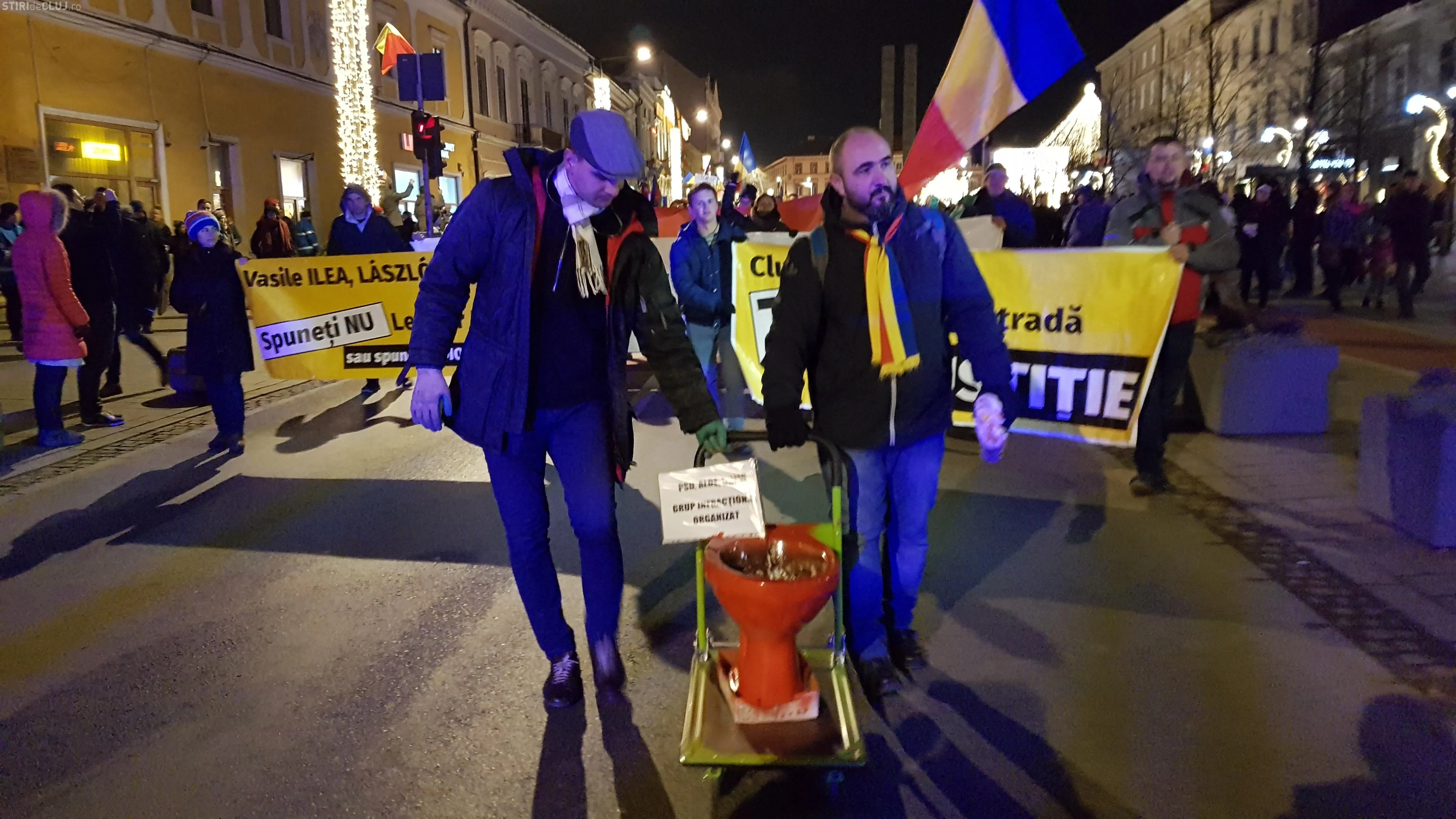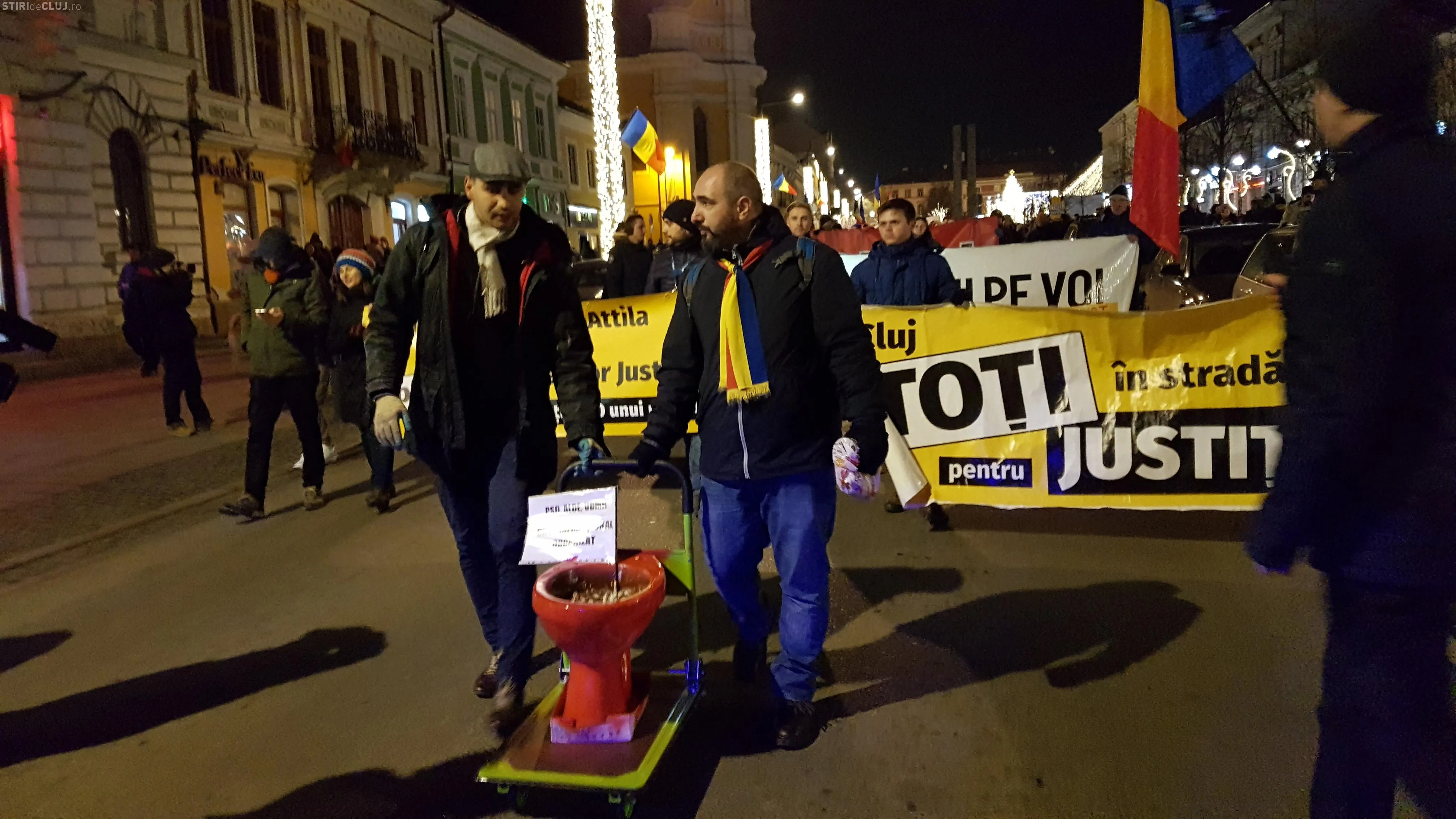 Protestatarii au vopsit și un vas de WC complet în roșu, apoi l-au amplasat în fața sediului PSD Cluj. ”Cadoul” a fost apoi purtat prin tot Clujul, pe traseul urmat de manifestanți.