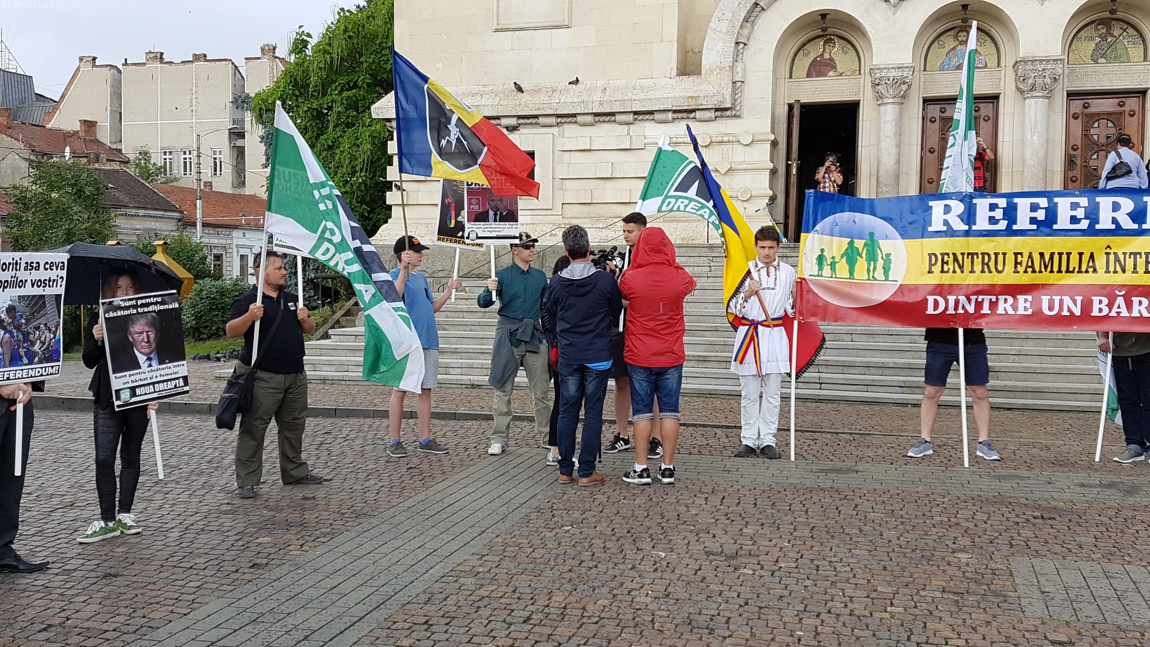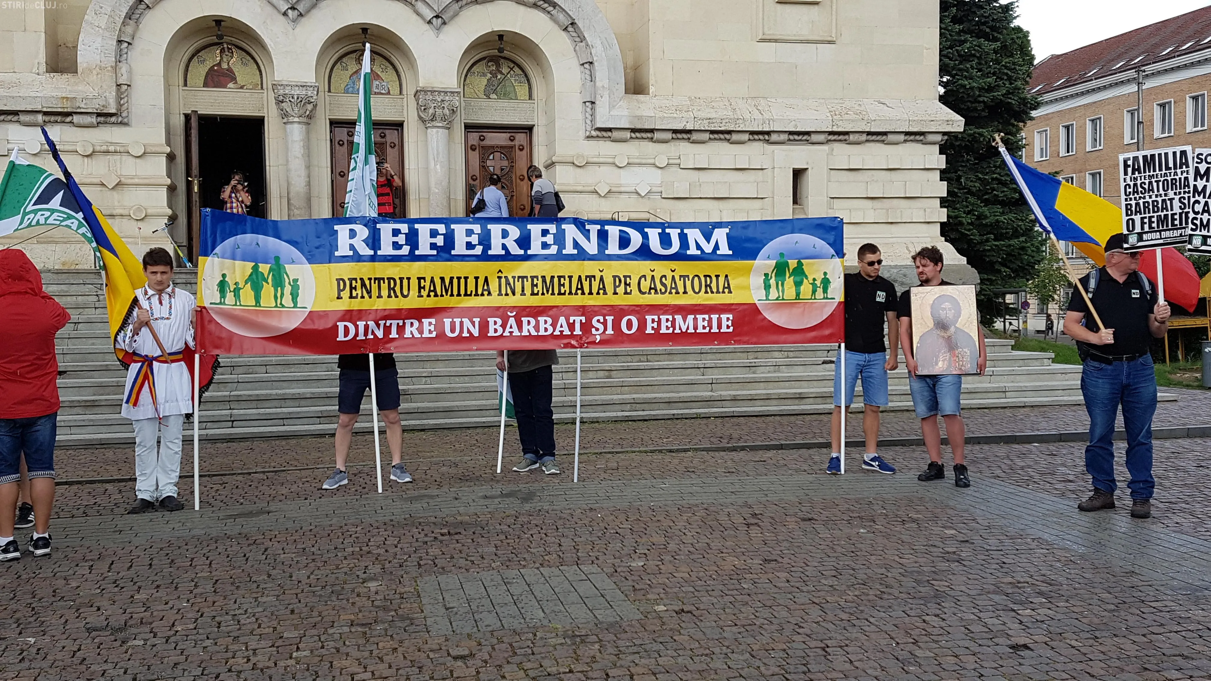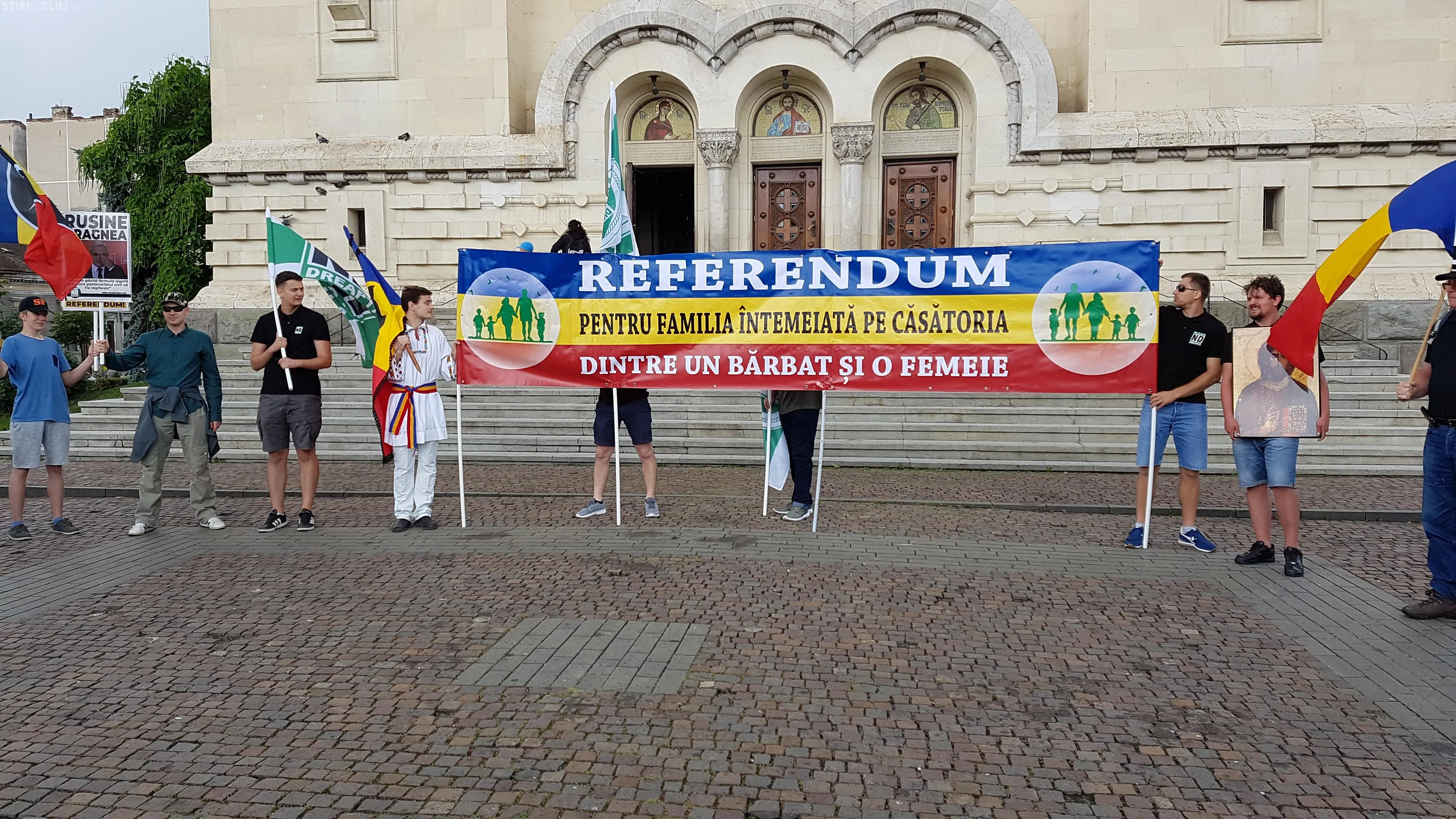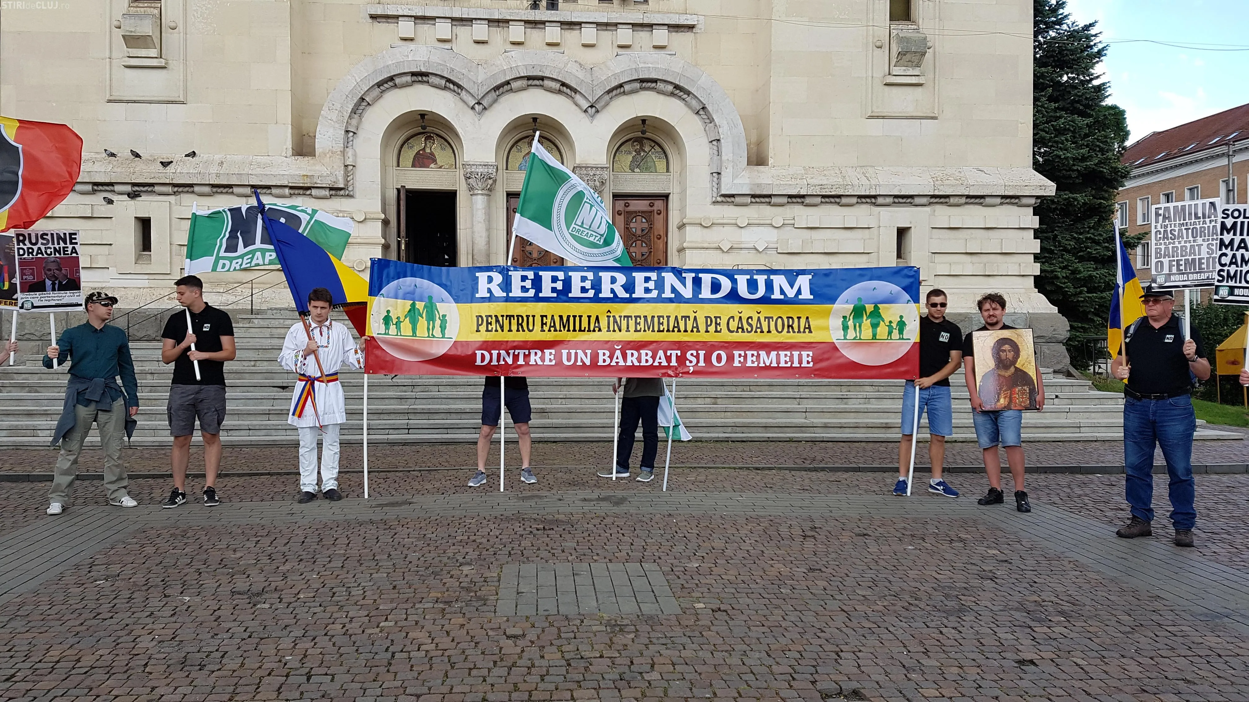Aceștia s-au adunat în fața Catedralei Ortodoxe din piața Avram Iancu, dotați bannere și pancarte prin care cer referendum pentru căsătoria doar între un bărbat și o femeie.