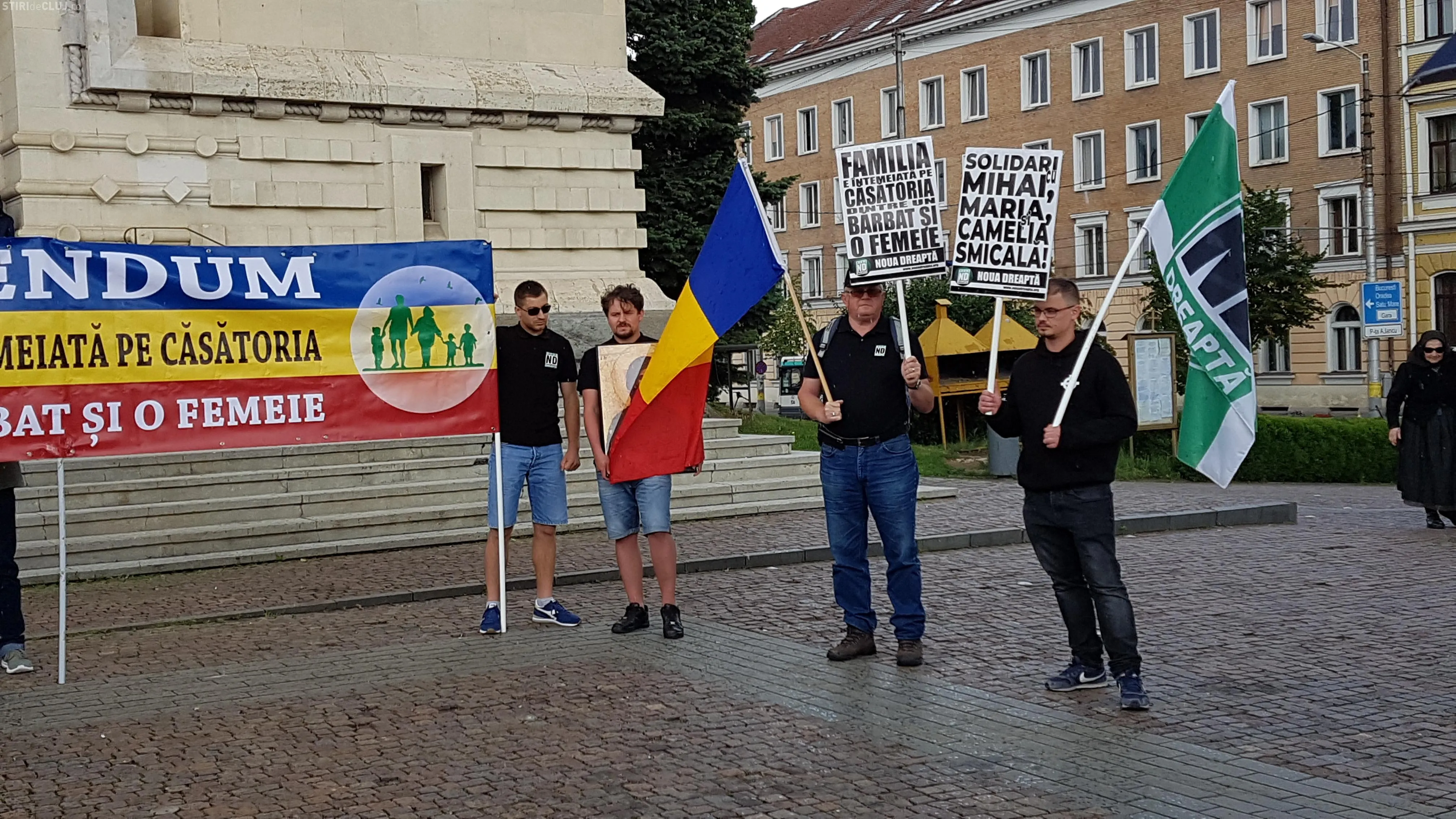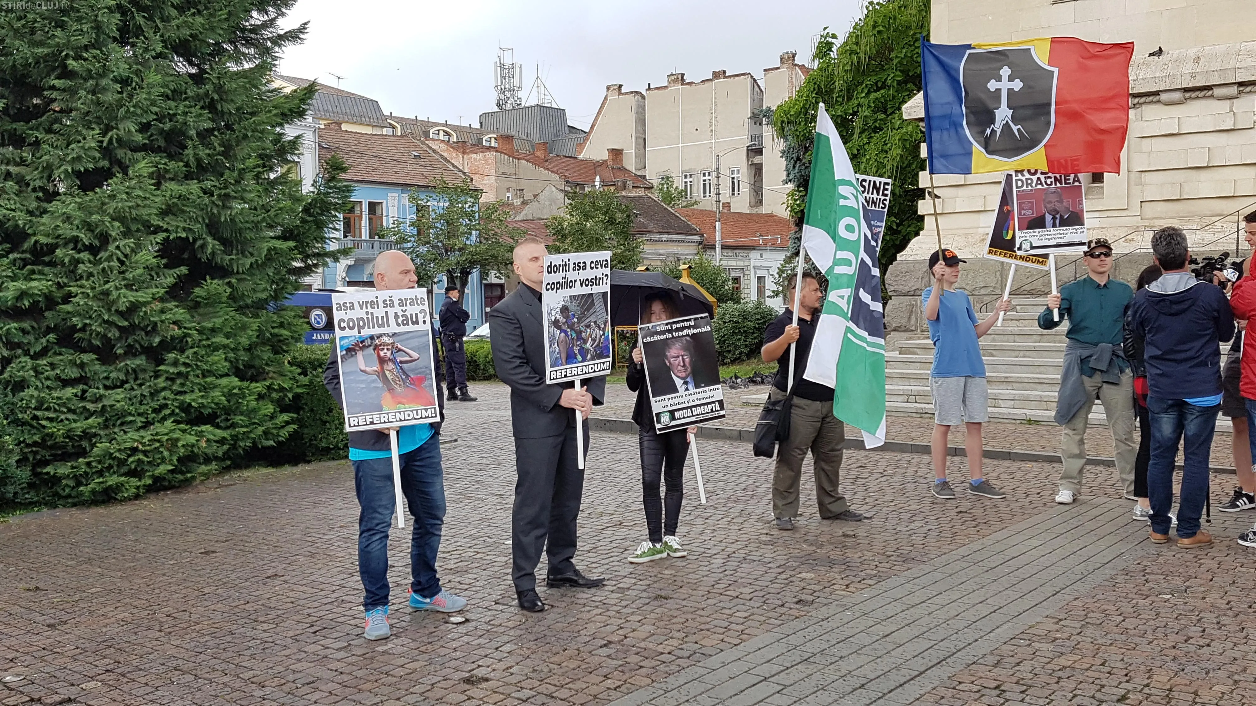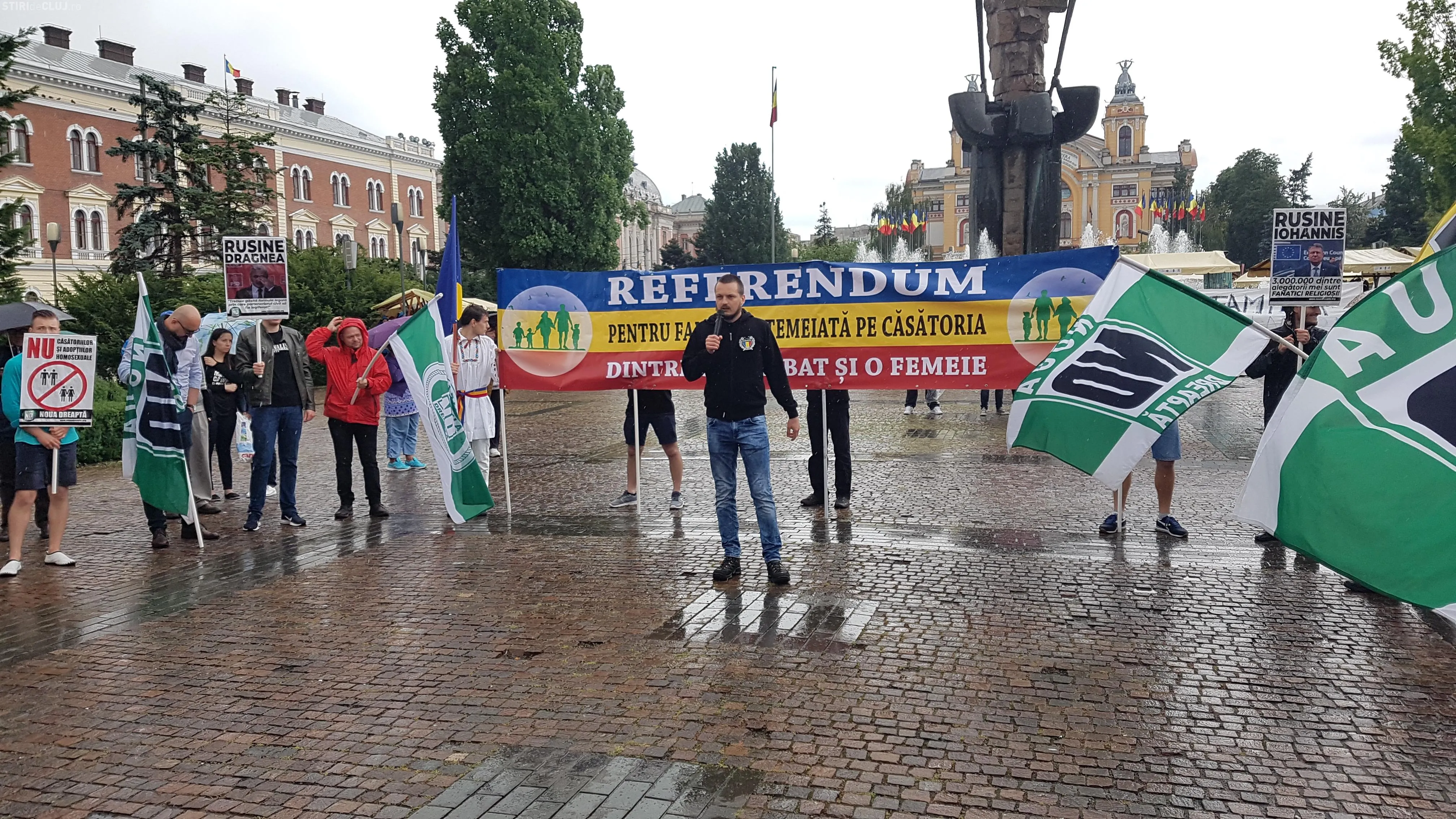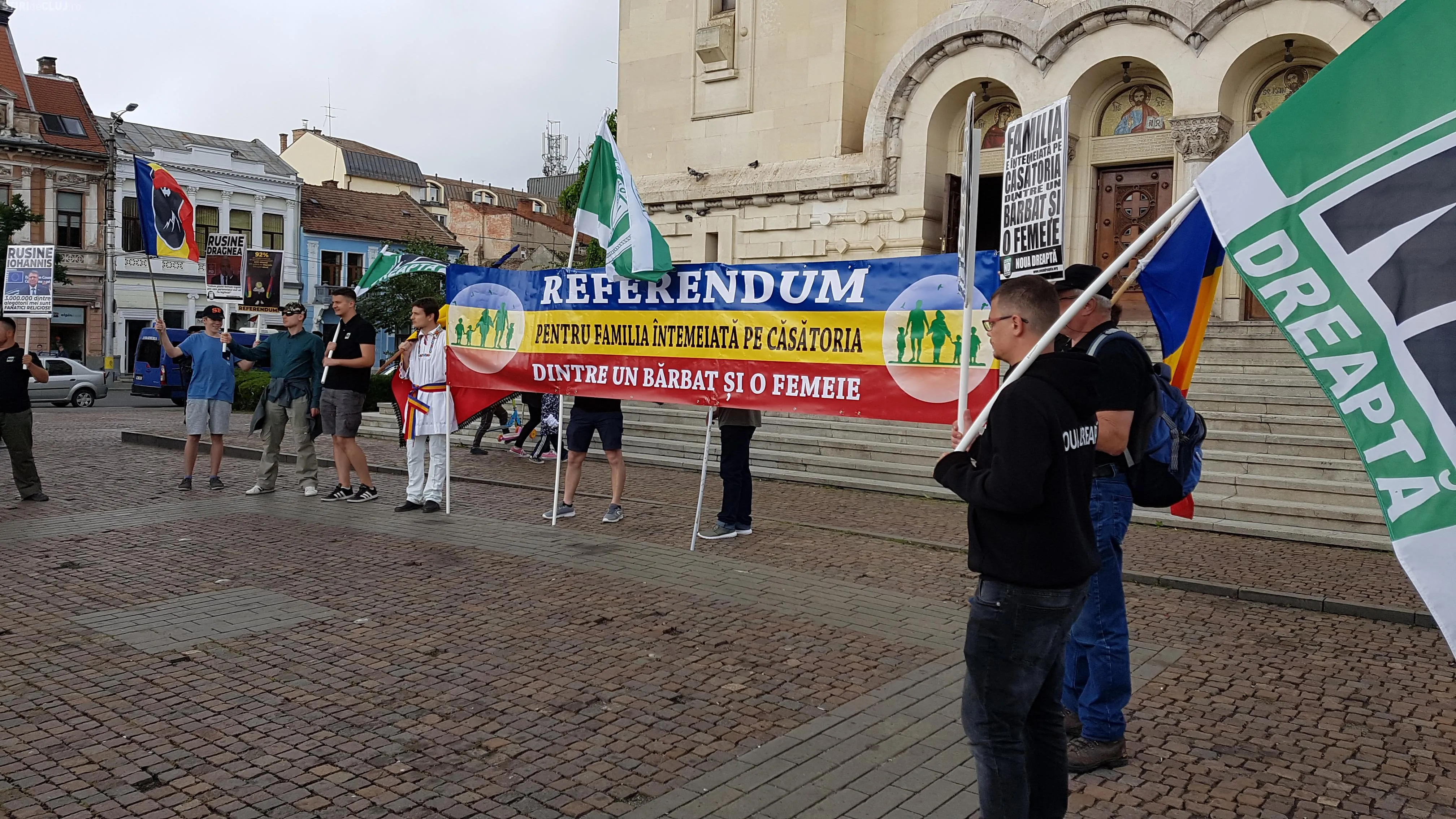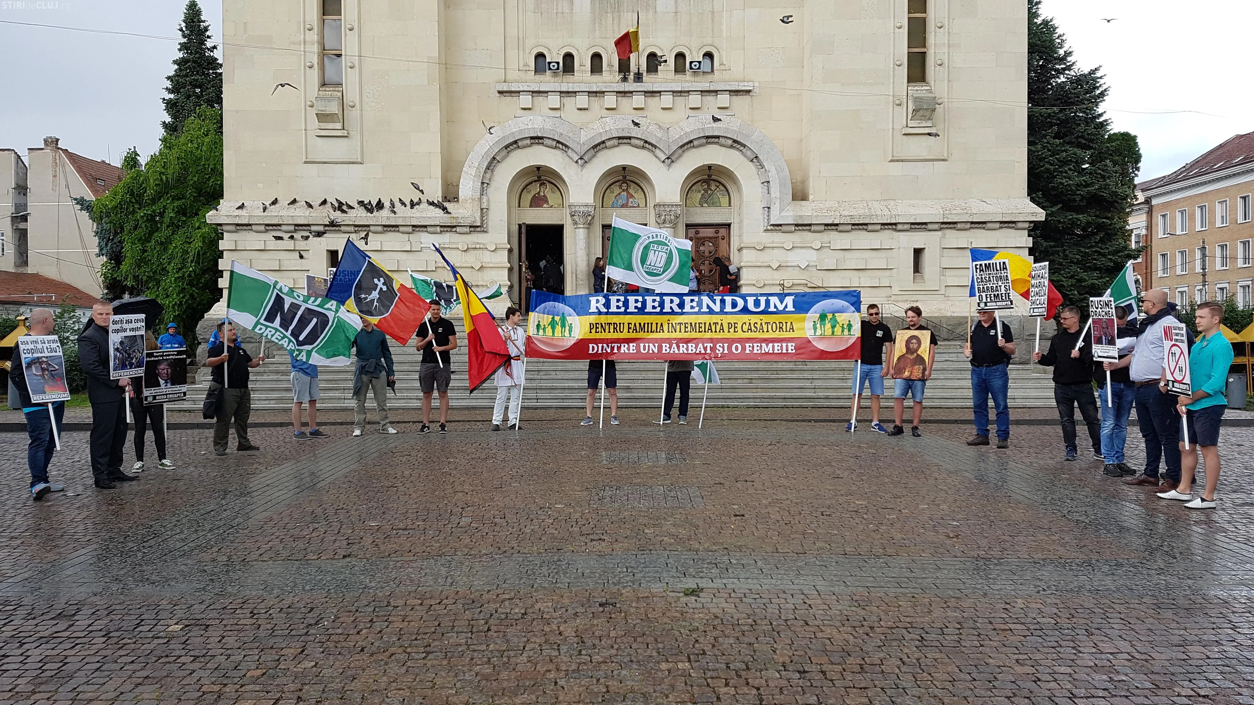 Aceștia s-au adunat în fața Catedralei Ortodoxe din piața Avram Iancu, dotați bannere și pancarte prin care cer referendum pentru căsătoria doar între un bărbat și o femeie.