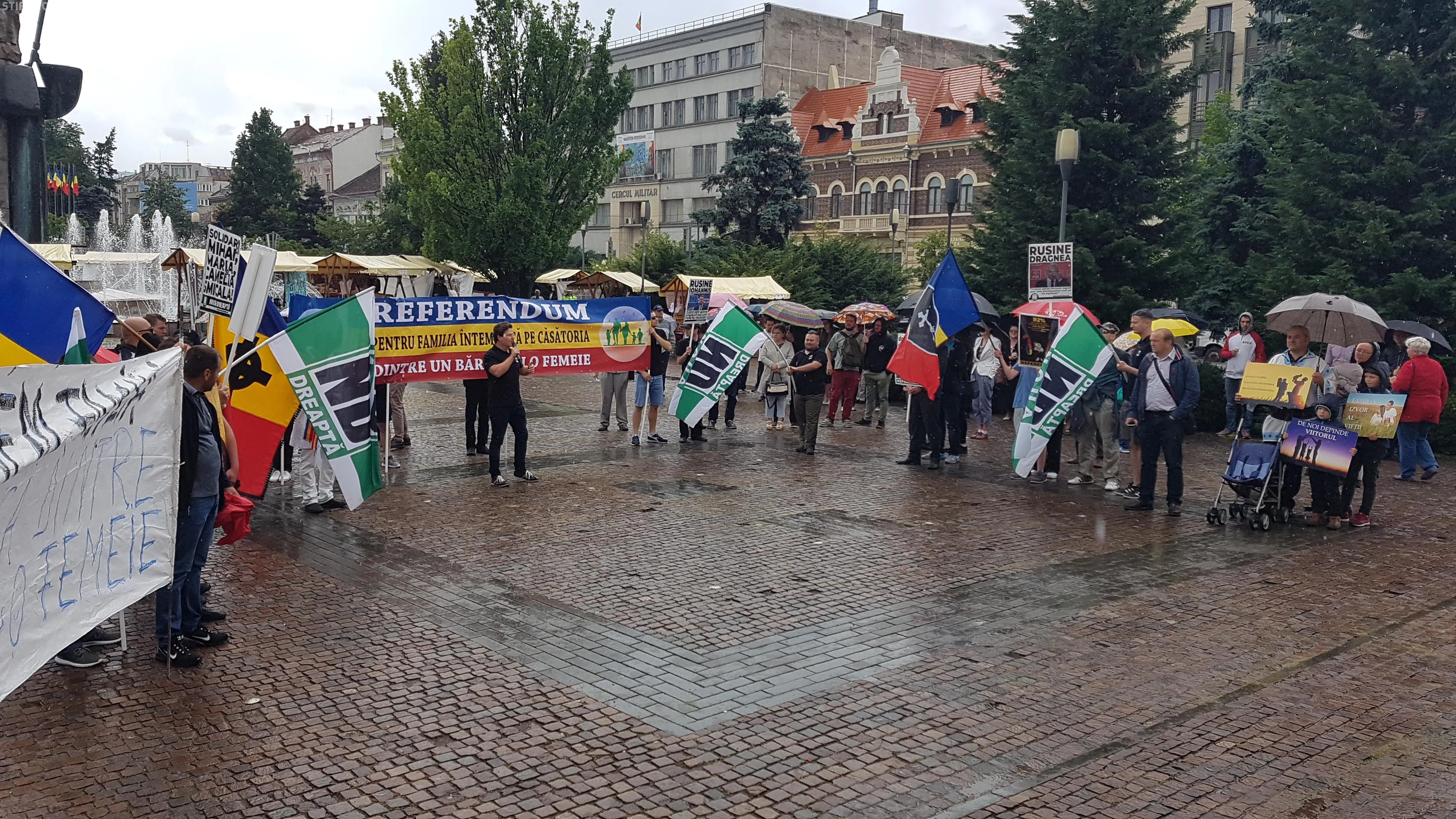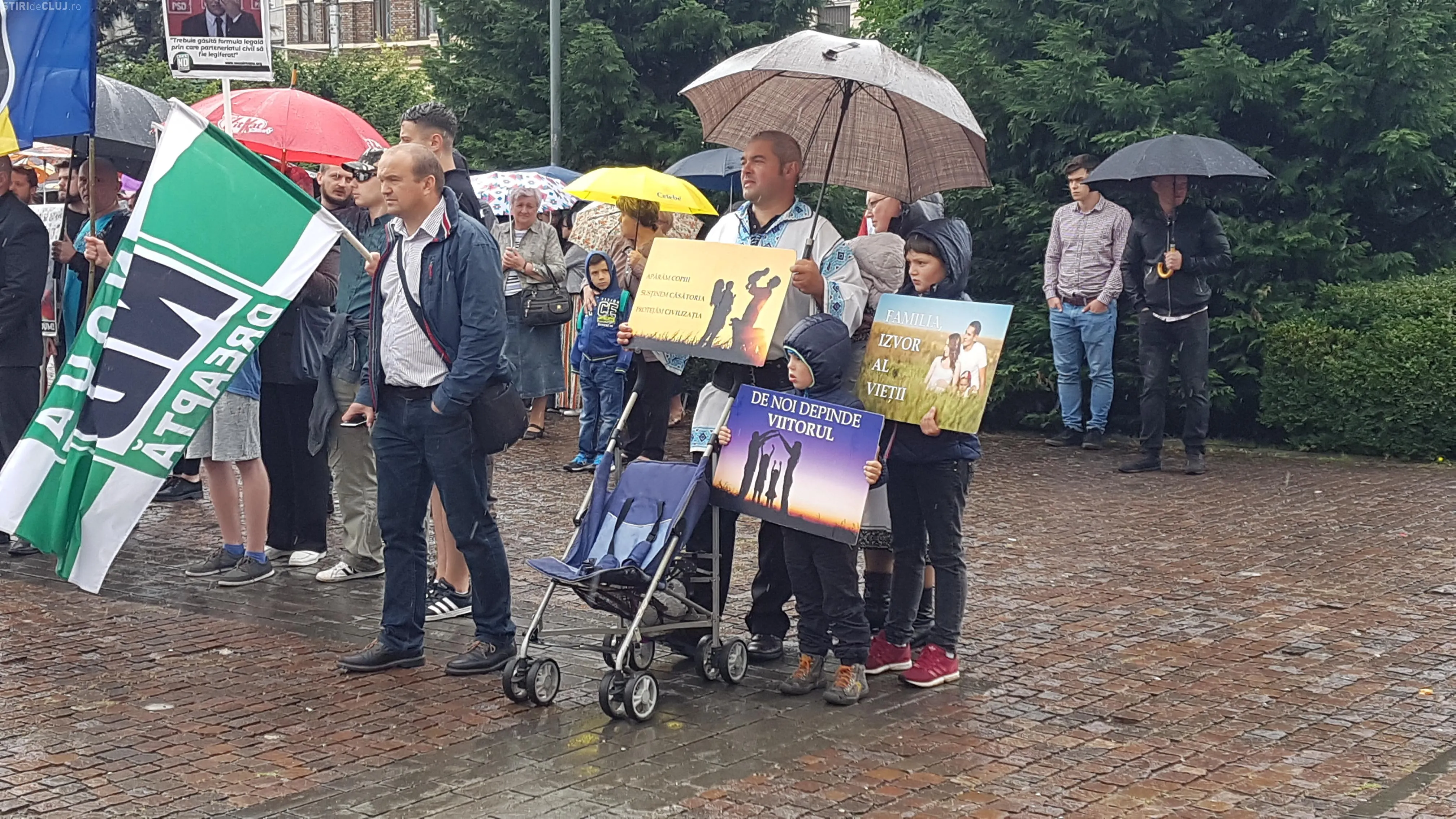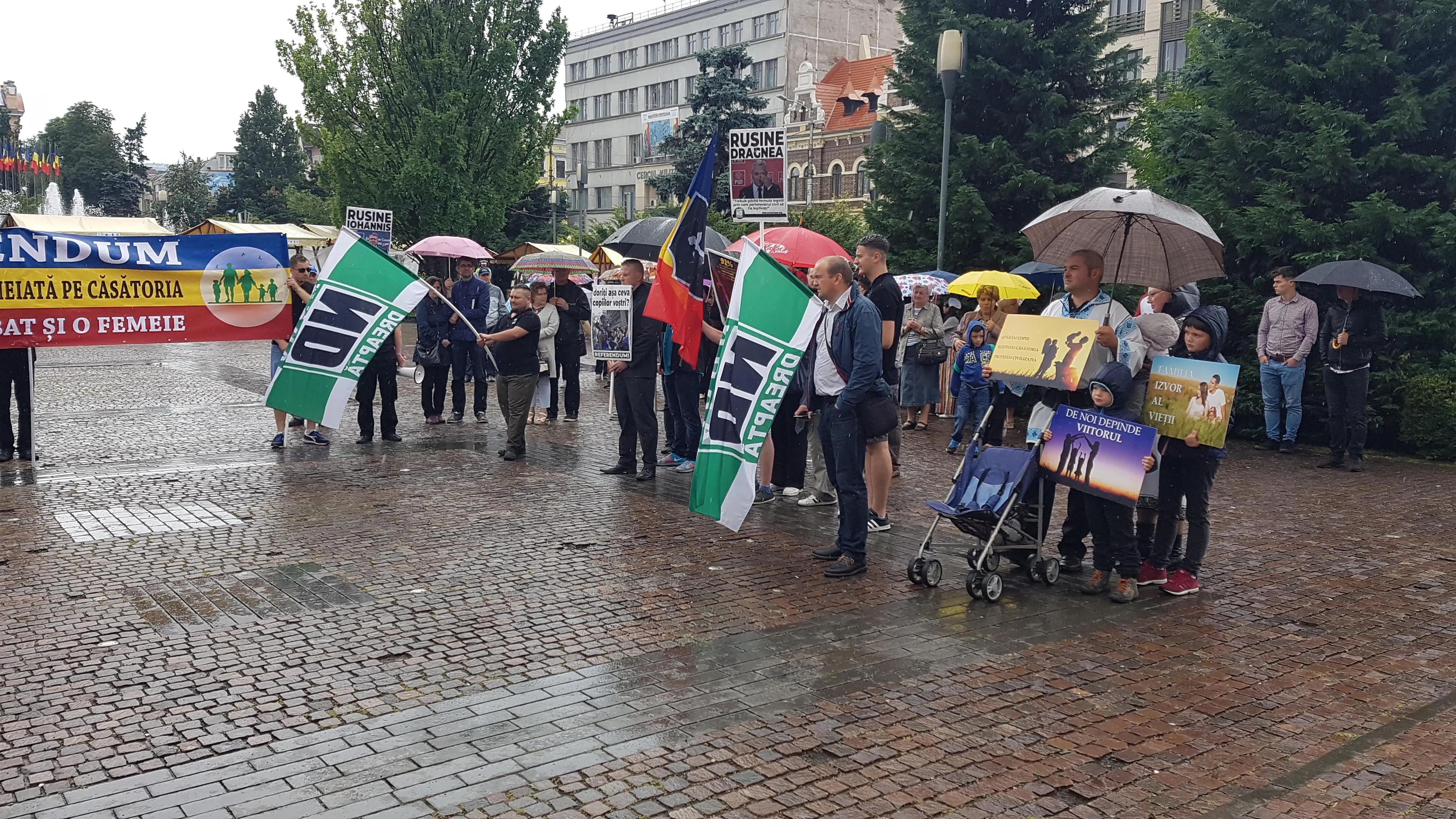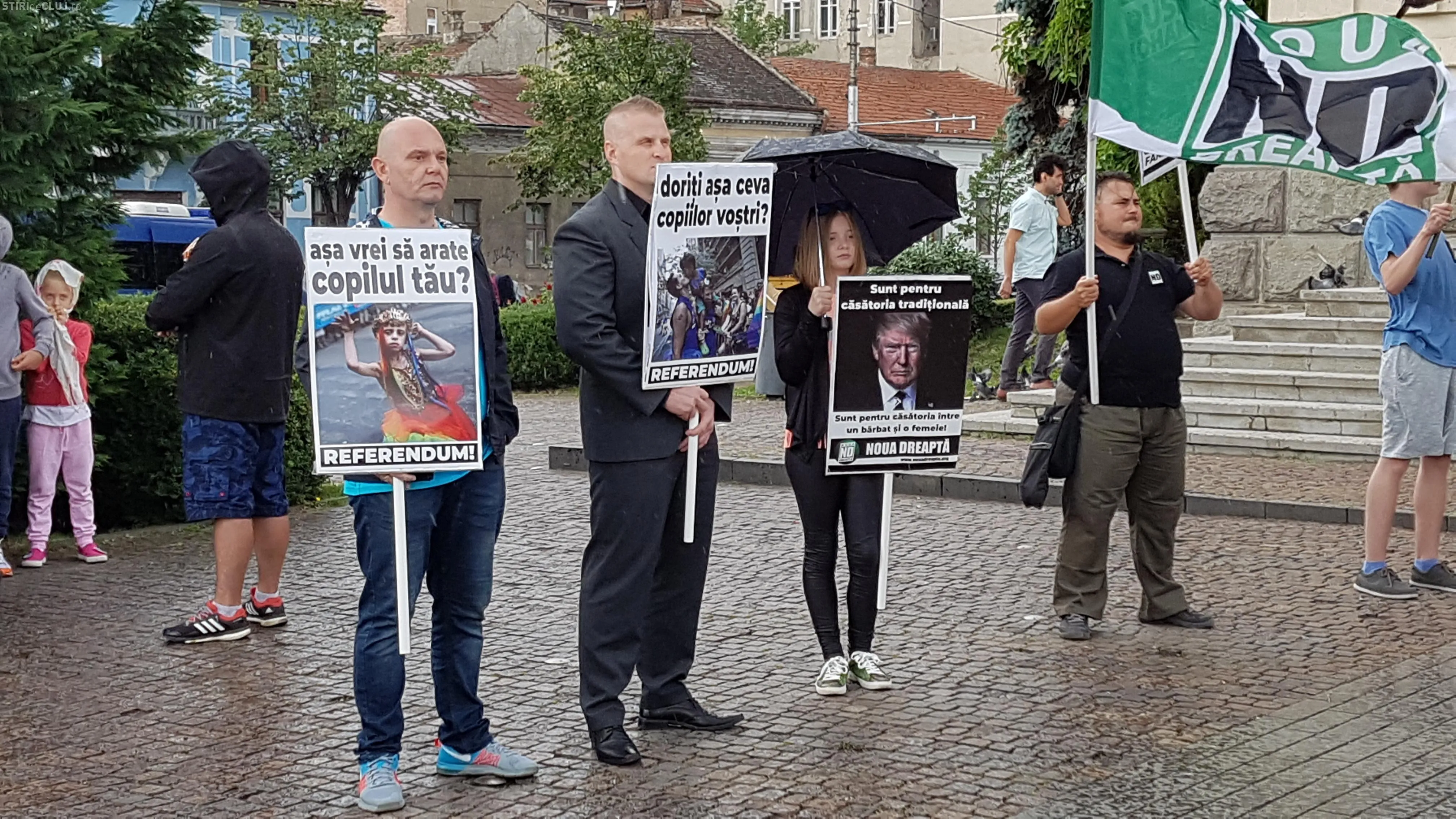 Aceștia s-au adunat în fața Catedralei Ortodoxe din piața Avram Iancu, dotați bannere și pancarte prin care cer referendum pentru căsătoria doar între un bărbat și o femeie.