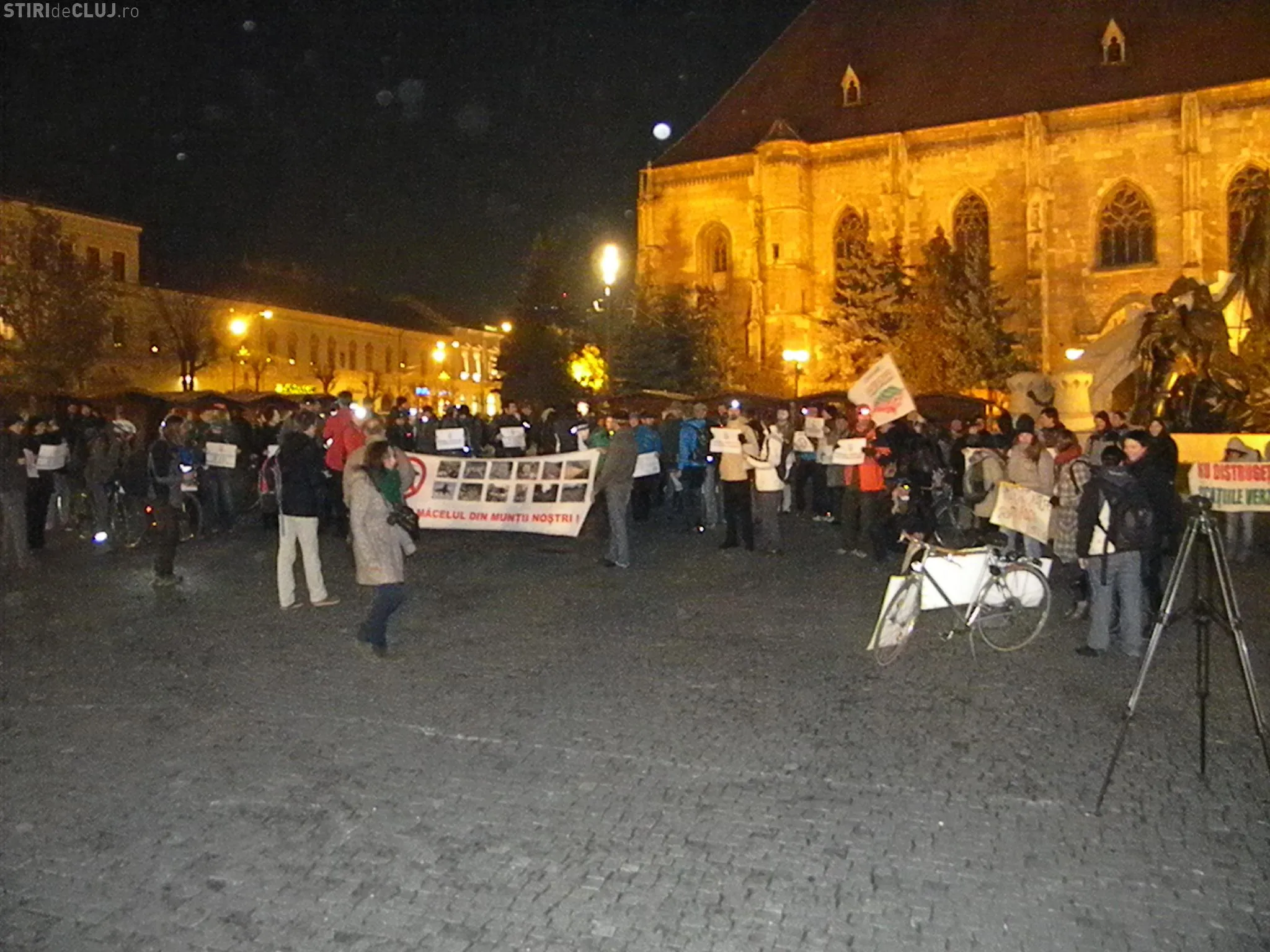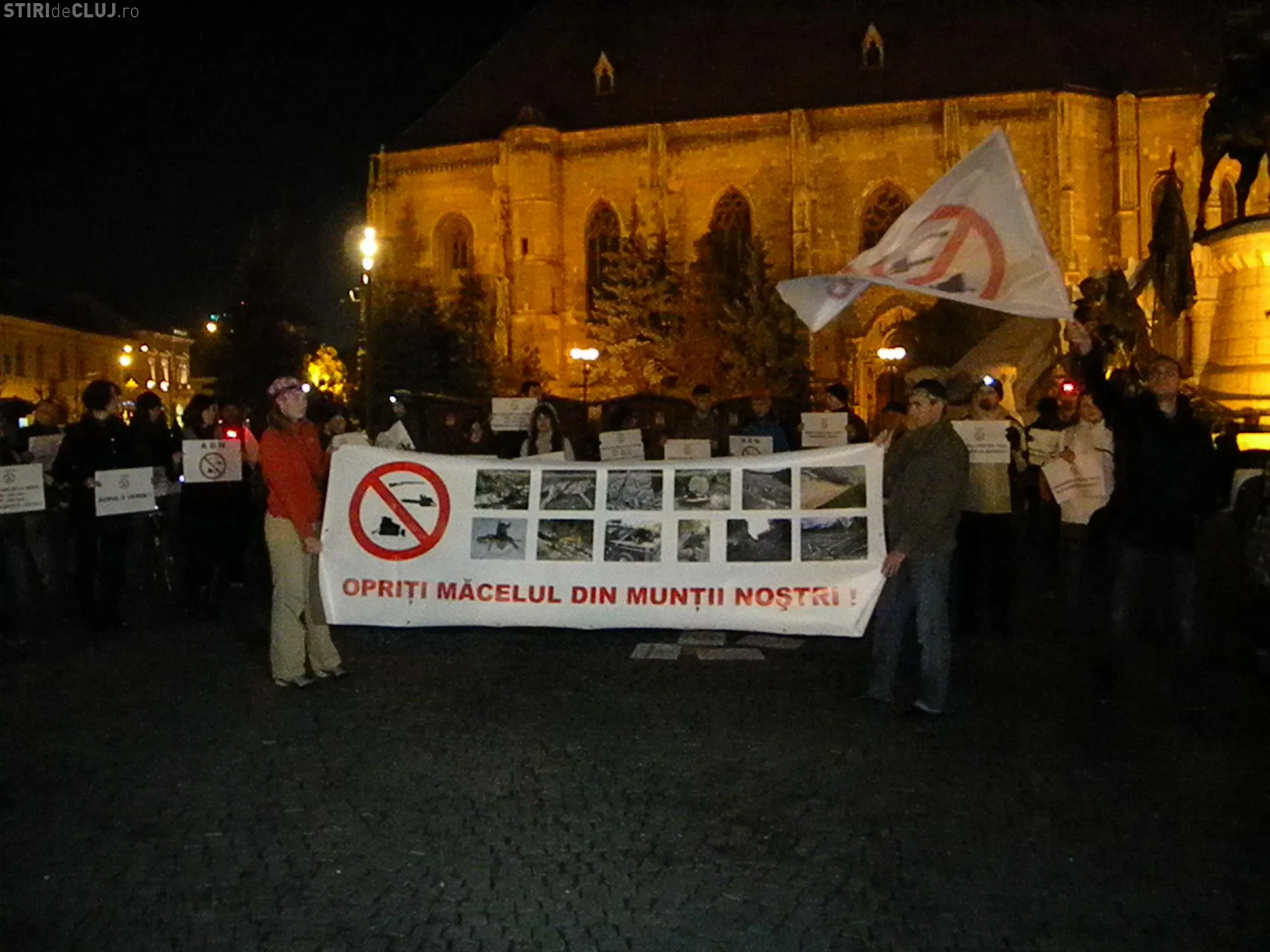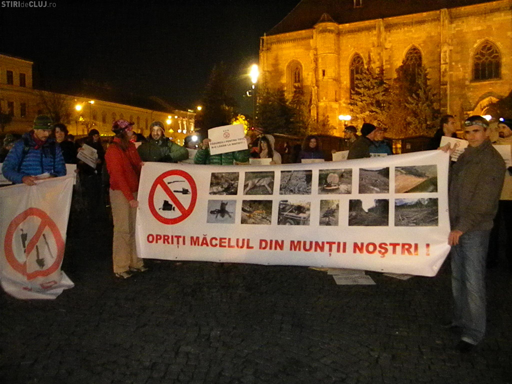 Circa 100 de persoane au protestat în Piața Unirii din Cluj-Napoca, miercuri seara, de la ora 19.00, cerând Guvernului și Ministerului Mediului și al Pădurilor să oprească defrișările.