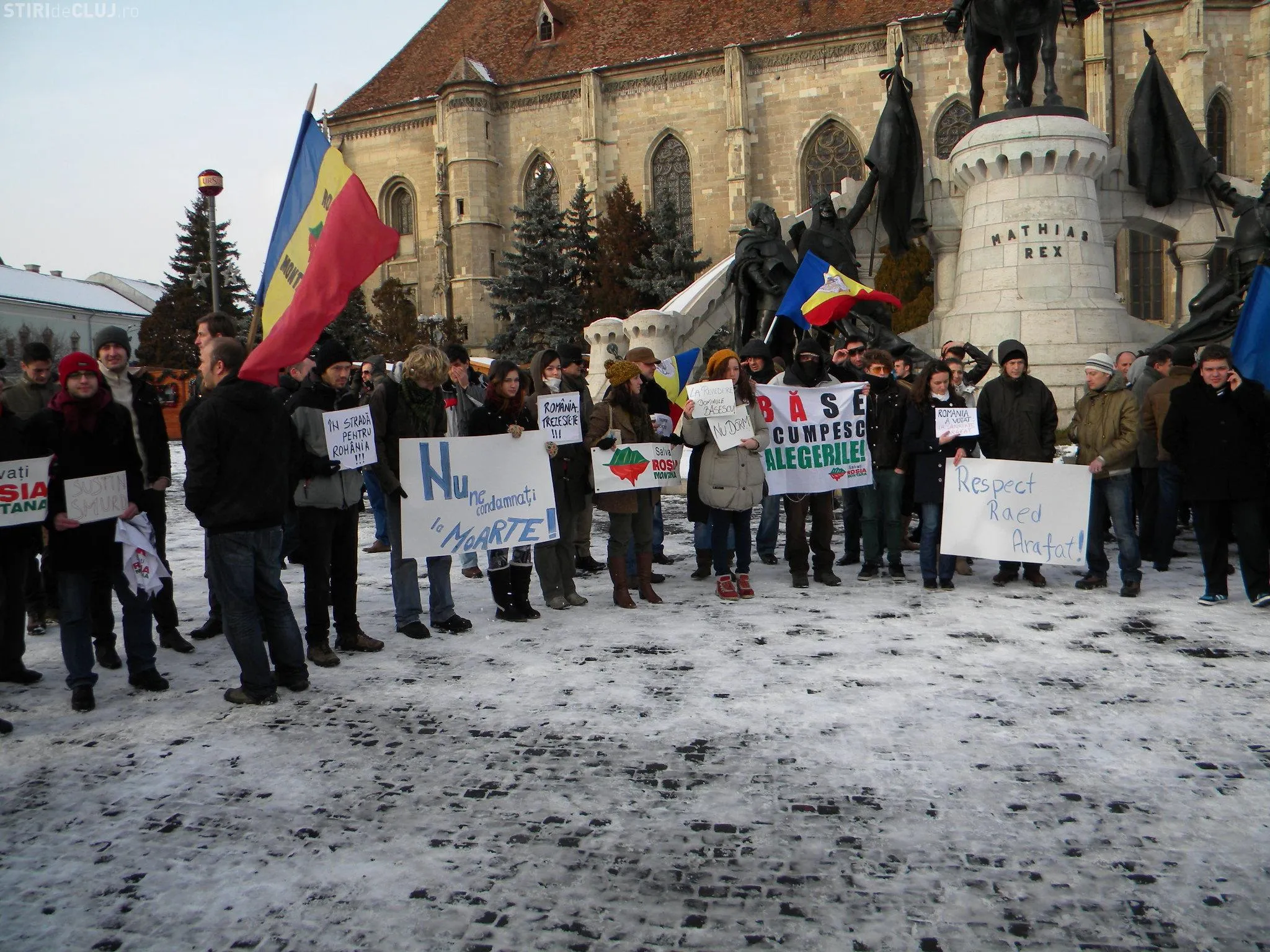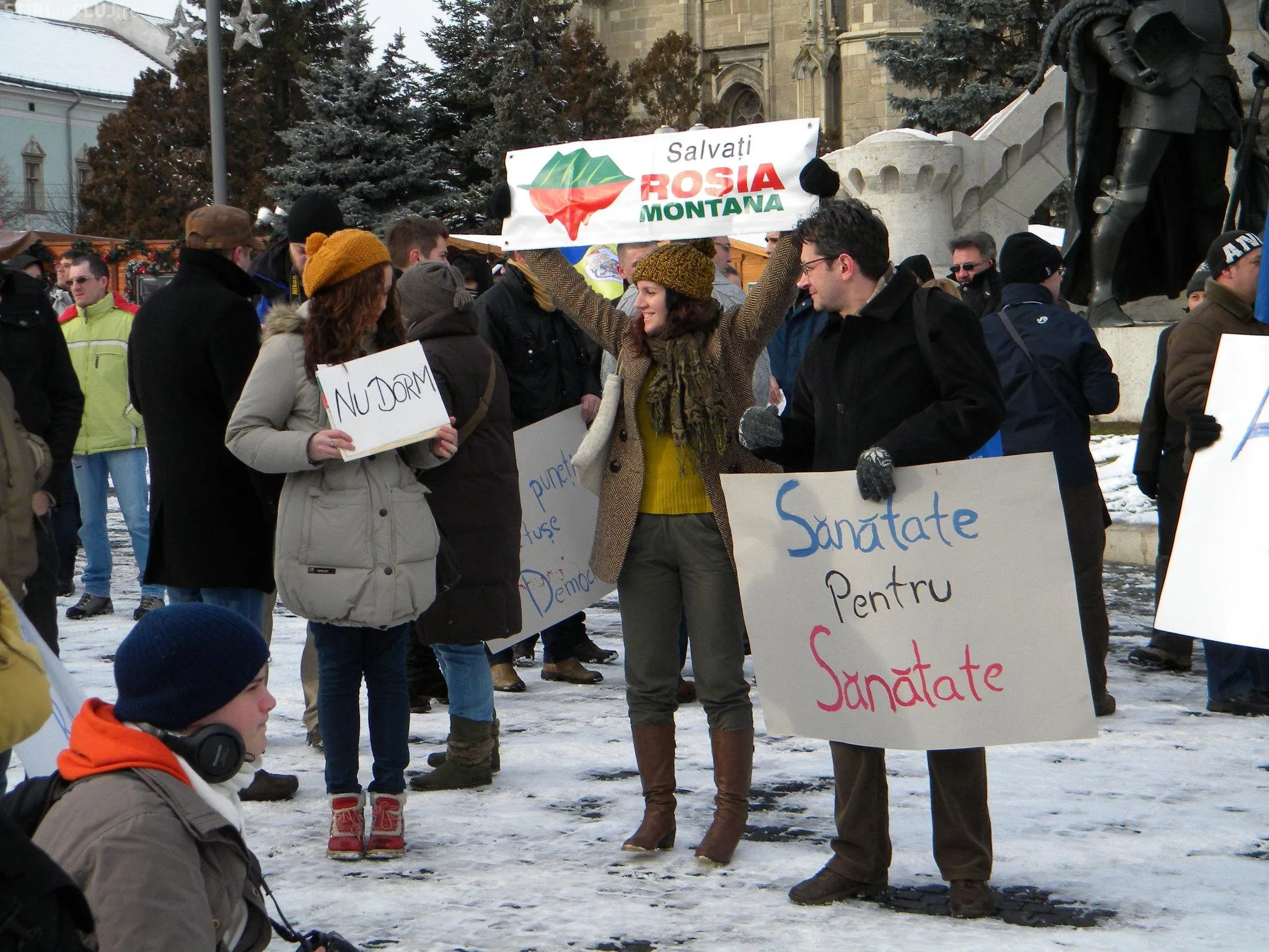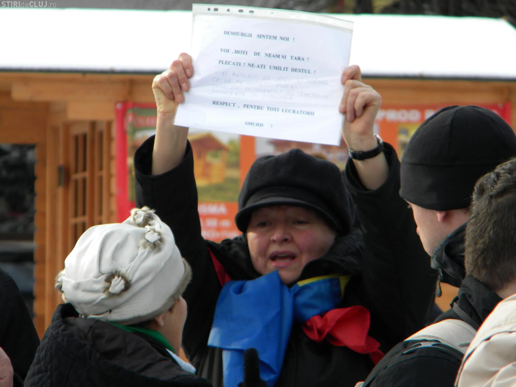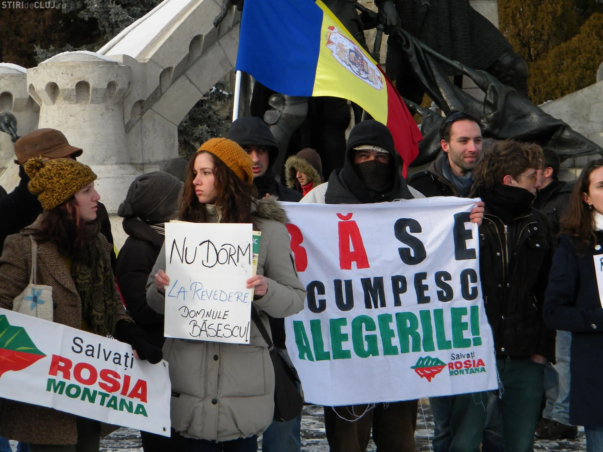 Protestul a inceput la ora 14.00 si a beneficiat de sprijinul militantilor ecologisti, care protesteaza impotriva exploatarii cu cianuri de la Rosia Montana.