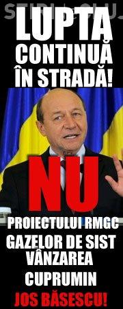 "Traian Basescu, presedintele jucator la bursa, sfideaza inteligenta unui popor intreg! Miercuri, 11 aprilie in Piata Unirii, ora 18.00 spunem NU raspicat proiectului Rosia Montana! NU exploatarii gazelor de sist! NU vanzarii Cuprumin!