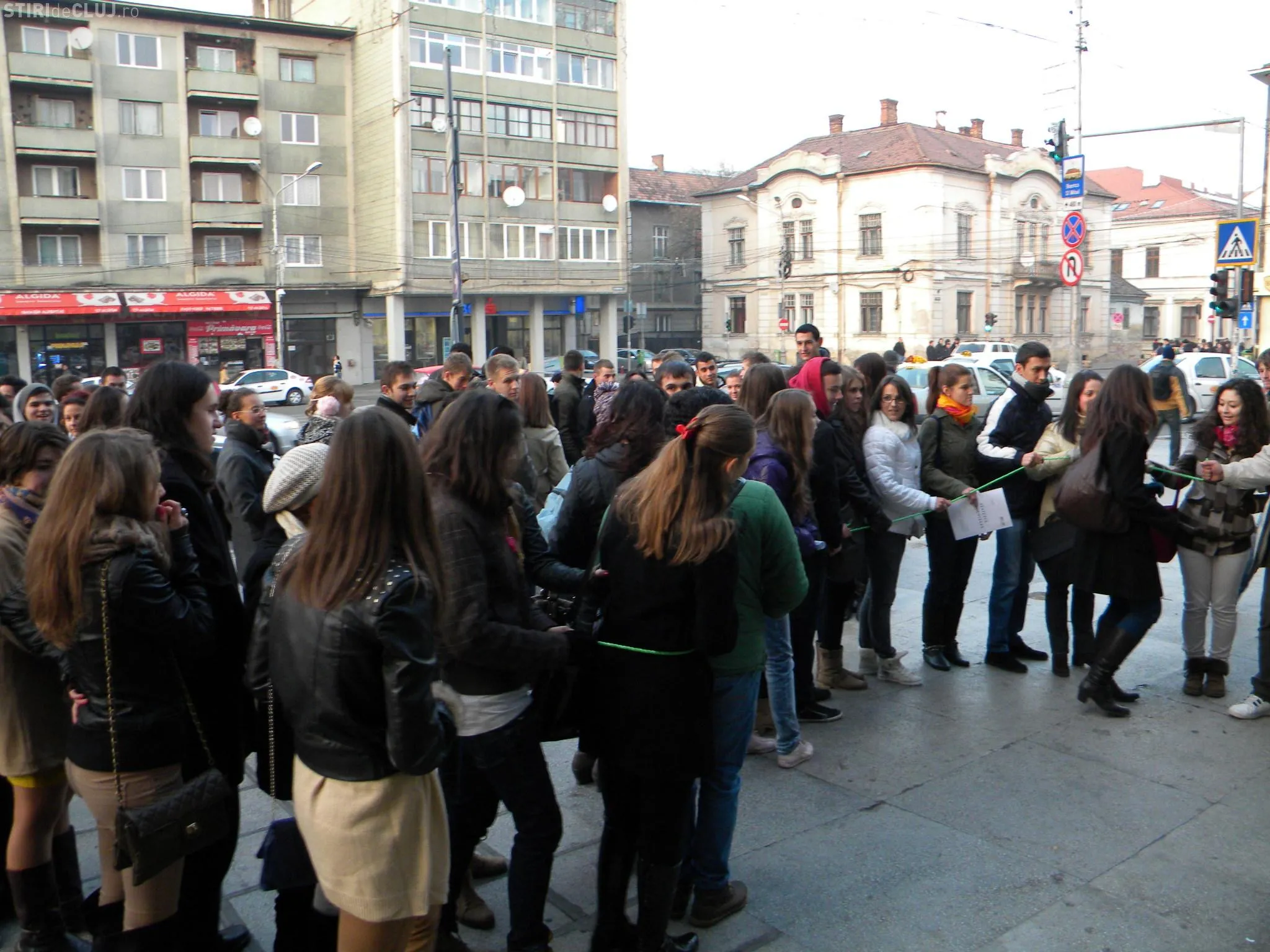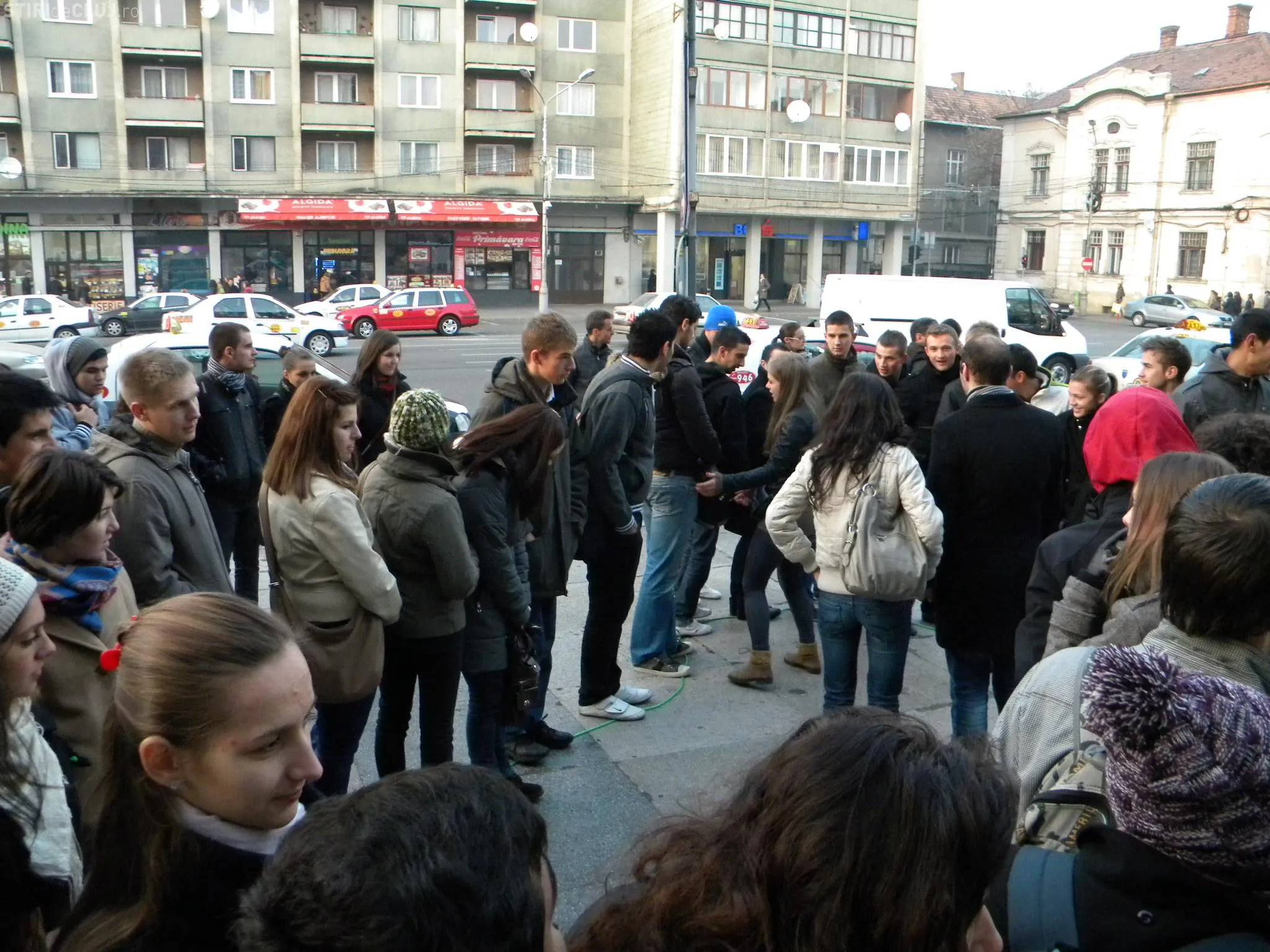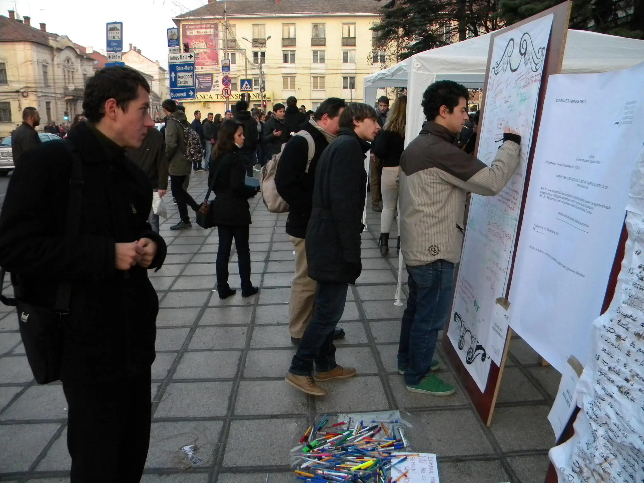 Peste 100 de tineri, membri ai tuturor organizatiilor studentesti din Cluj-Napoca, au protestat, joi, 17 noiembrie, de la ora 16.00, in Piata Lucian Blaga. Tinerii au adunat sute de pixuri pentru ca Daniel Funeriu sa aiba cu ce sa semneze statutul studentului.