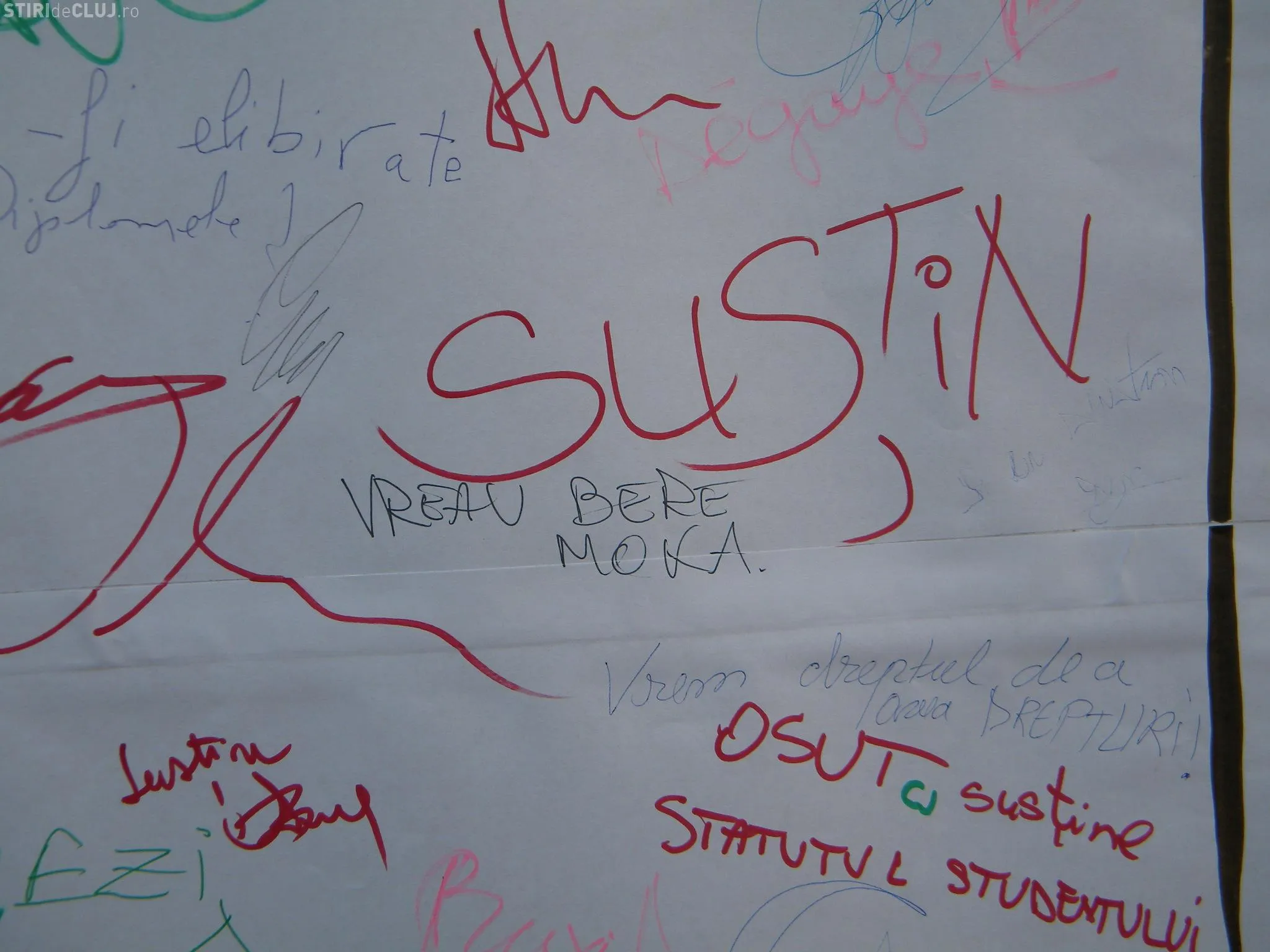 "Am venit ca sa salvam studentii si sa nu ne lasam manipulati. Suntem prinsi intre universitati, care ne controleaza statutul zilnic, si minister, care ne controleaza parintii, familia si viata de zi cu zi. Taxele sunt foarte mari si nu primim nimic. Platesc 2.500 de lei ca sa fac o facultate si nici aer conditionat sa nu ai. Sa nu vina proful la ore. Si pentru toate astea macar sa imi dea ceva de baut", a spus un student de la Facultatea de Psihologie, care a scris pe panoul cu mesaje ca vrea o bere.