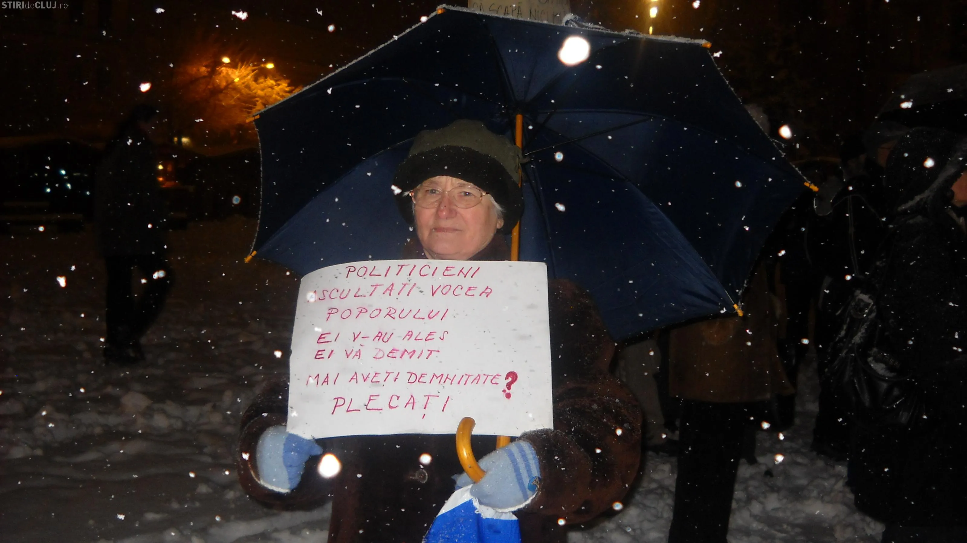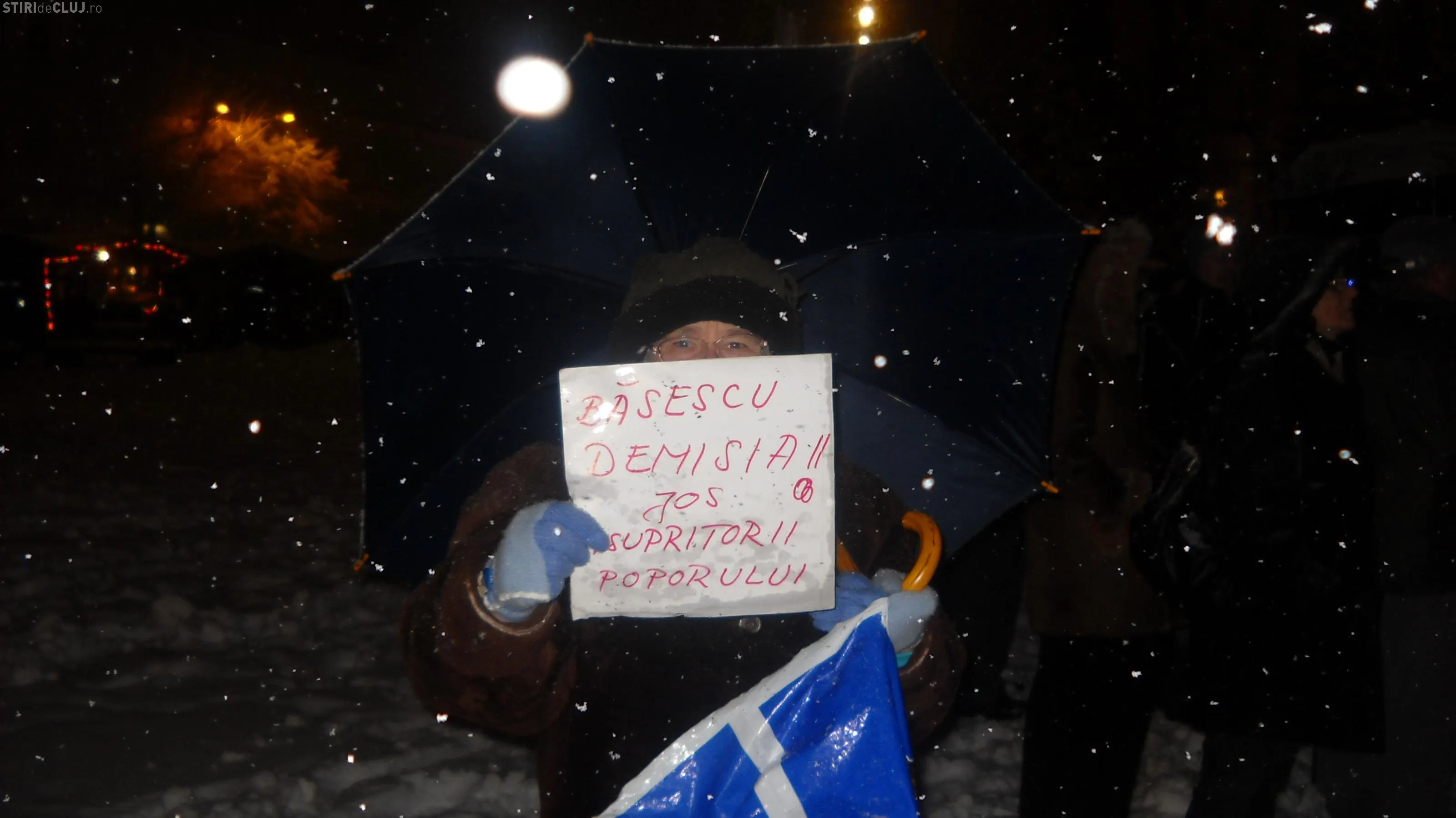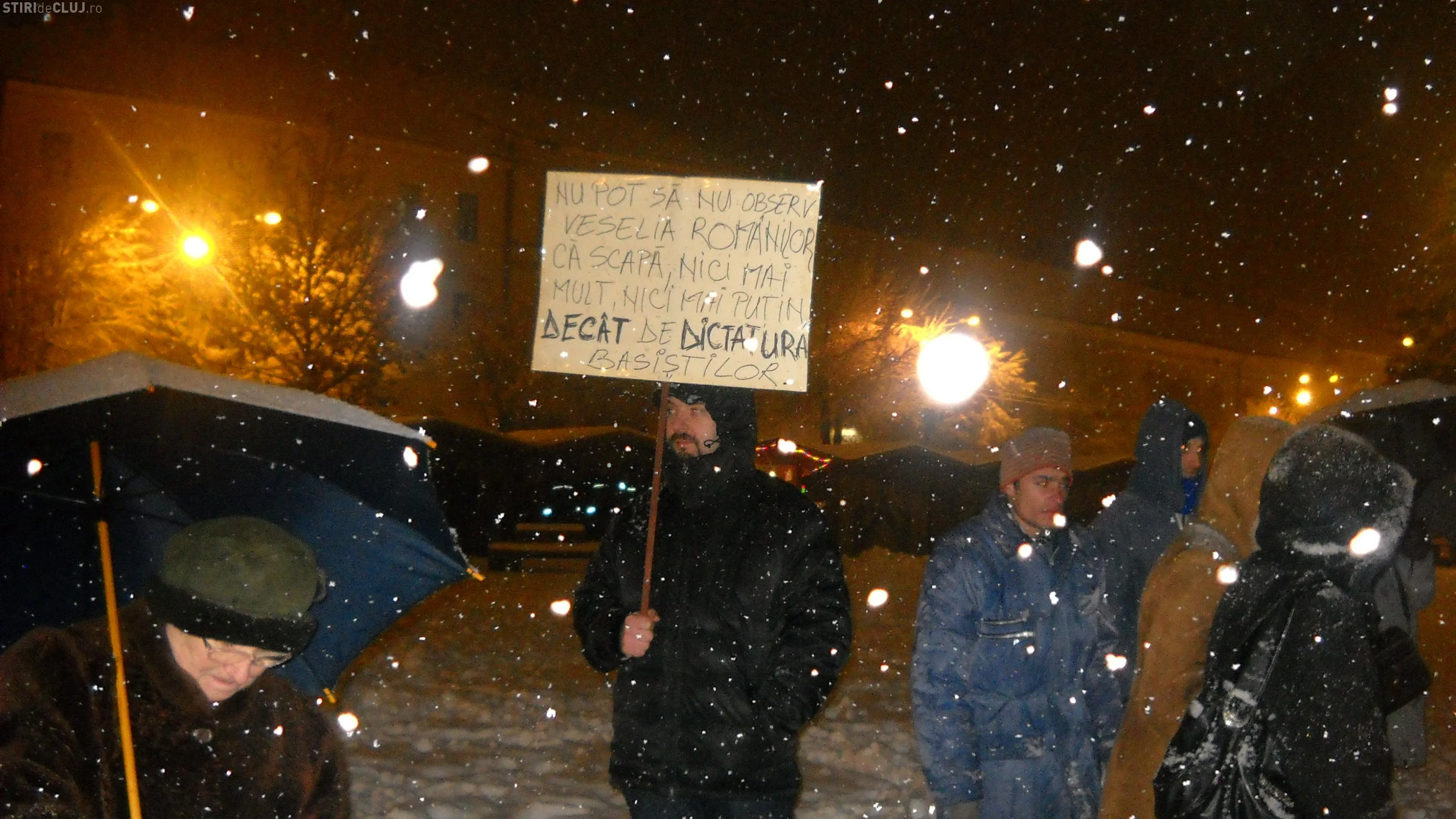 Acestia continua sa strige lozinci impotriva conducerii statului. "Basescu nu uita, Gherla este casa ta", "Chiar daca e zapada, iesim in strada" si "Boc Boc Boc, demisia pe loc".
