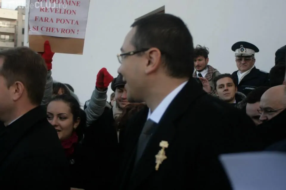 Ponta a fost așteptat de protestatarii anti RMGC, dar și cei care au fost încă de la început împotriva mutării romilor de pe strada Coastei la Pata Rât. Campusul Teologic ”Nicolae Ivan” a fost construit pe strada Coastei, chiar pe locul în care înainte erau cocioabele romilor.