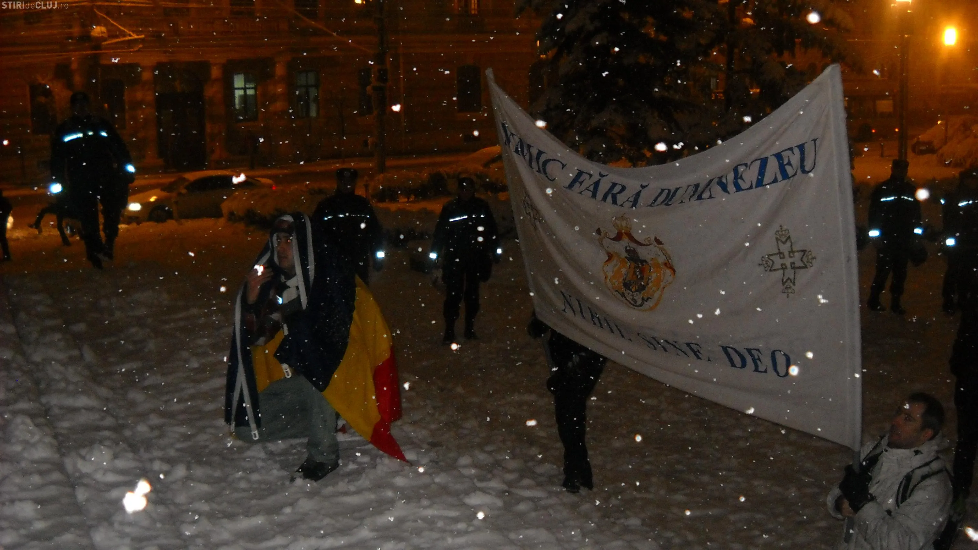 O parte dintre protestatari s-au oprit in aceasta seara in Piata Avram Iancu si s-au rugat in genunchi pe scarile Catedralei.