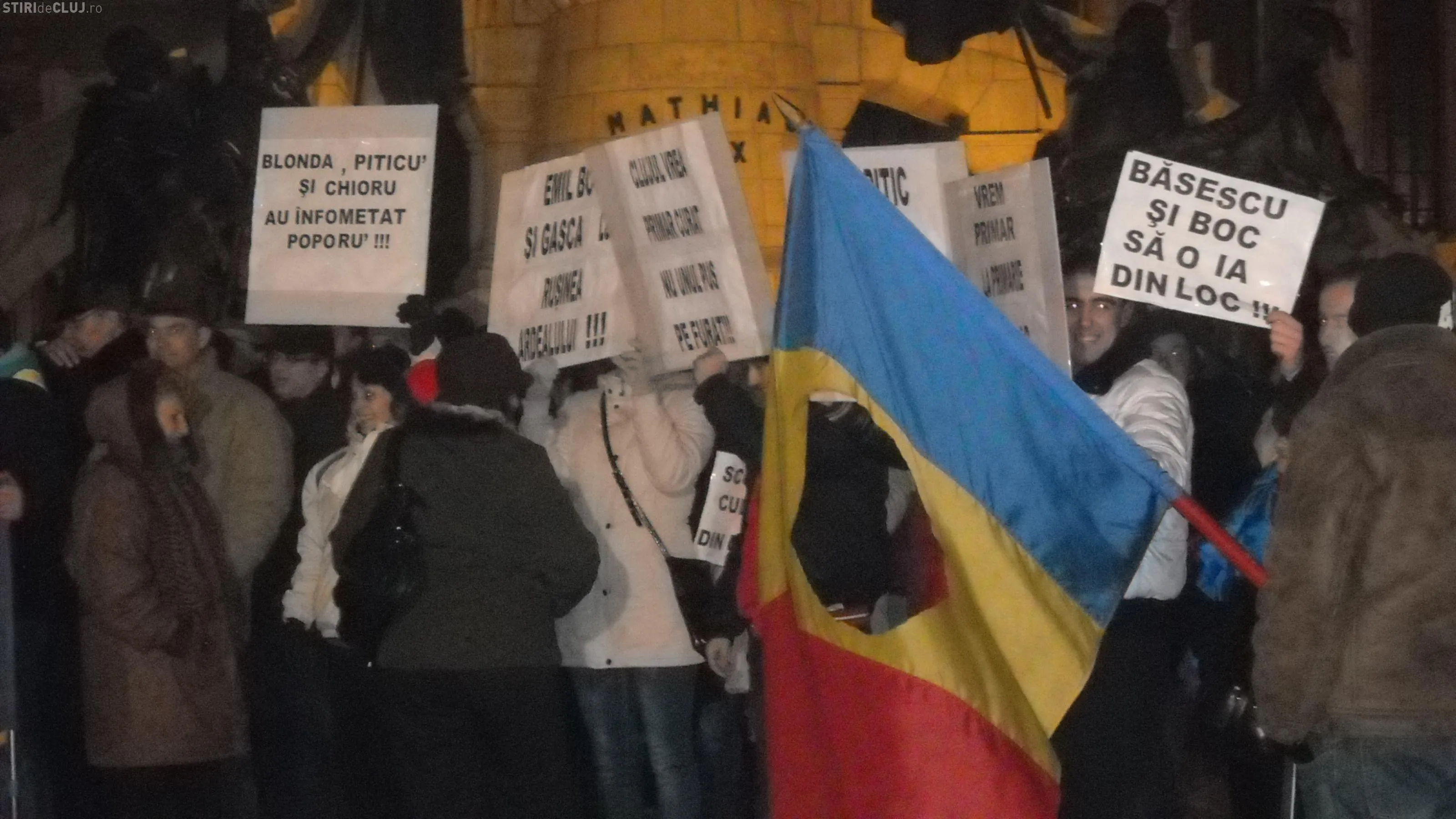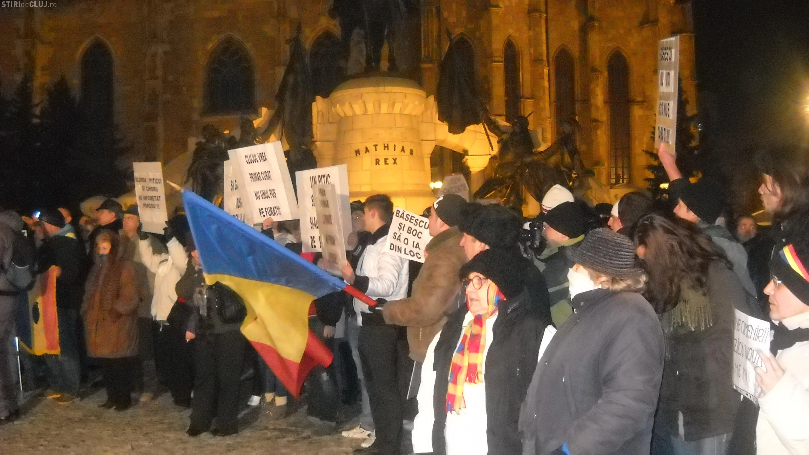 Protestatarii s-au adunat in Piata Unirii in jurul orei 18.00, cu steaguri si pancarte si au continuat sa strige lozinci impotriva lui Basescu, a Guvernului si fac apel la ceilalti clujeni sa li se alature.