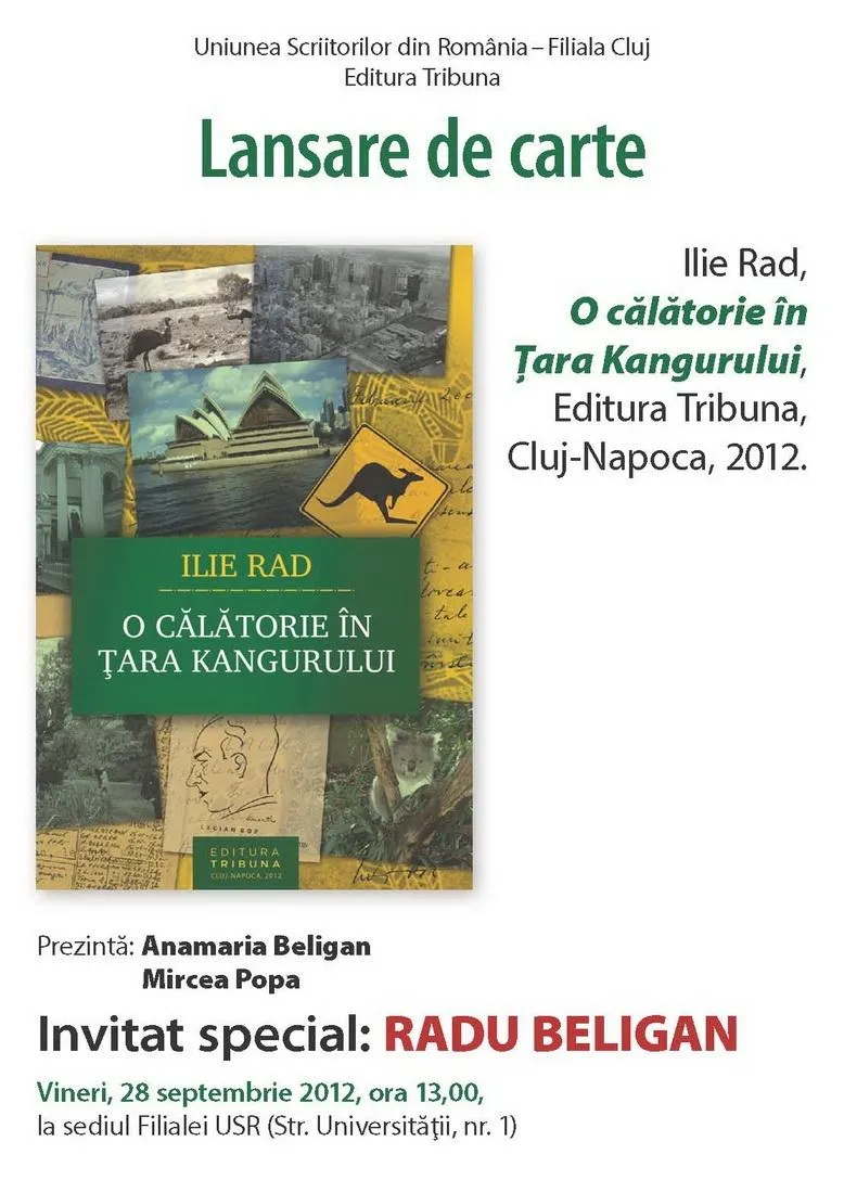 - vineri, 28 septembrie, ora 13, Ilie Rad va lansa volumul sau O calatorie in tara kangurului,