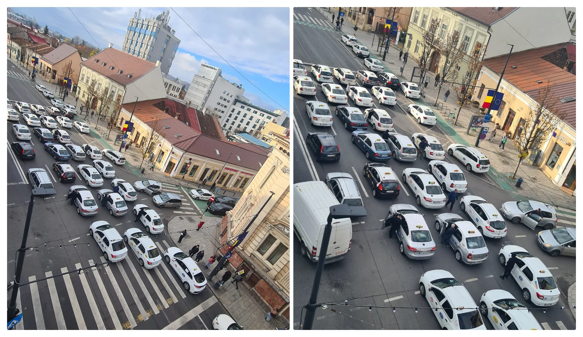 Taximetriștii clujeni au blocat miercuri, 22 noiembrie, orașul pentru a cere interzicerea serviciilor de ridesharing, Bolt și Uber. Sugestivă este fotografia din apropiarea Primăriei, unde taximetriștii au blocat traficul pentru a se face auziți.