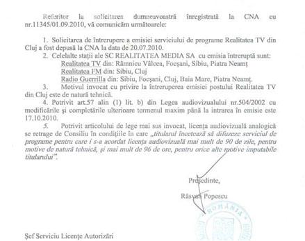 Potrivit unui raspuns primit de Stiri de Cluj de la CNA, "solicitarea de intrerupere a emisiei serviciului de programe Realitatea TV din Cluj a fost depusa la CNA in 20.07.2010". In plus, potrivit art. 57 alin 1, litera b, din Legea Audiovizualului nr. 504/2002, termenul maxim pana la care Realitatea TV Cluj poate sa reintre in emisie este 17 octombrie 2010. In caz, contrar, Realitatea TV Cluj va ramane fara licenta.