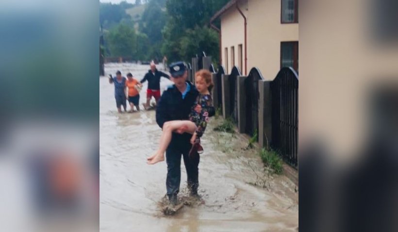 Rebeca, o fetiță în vârstă de 10 ani din localitatea Gura Suhodol, județul Alba, a fost cărată pe brațe de un jandarm, după ce casa în care locuia cu părinții ei a fost luată de ape.