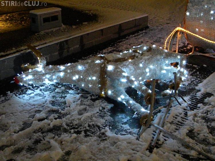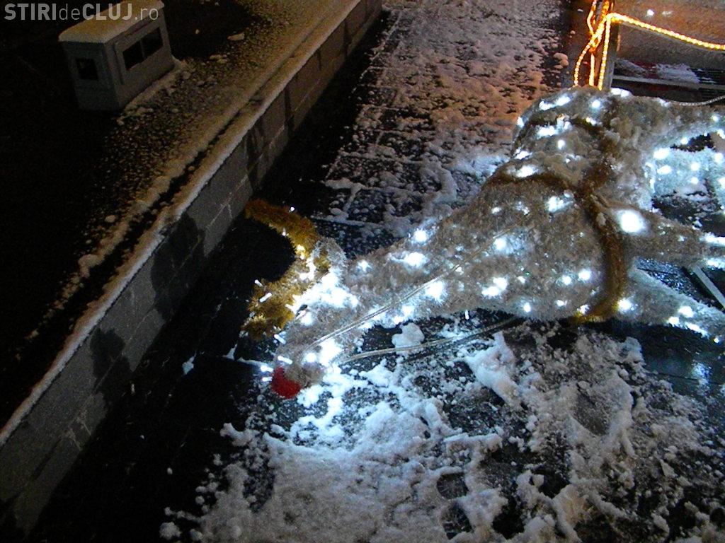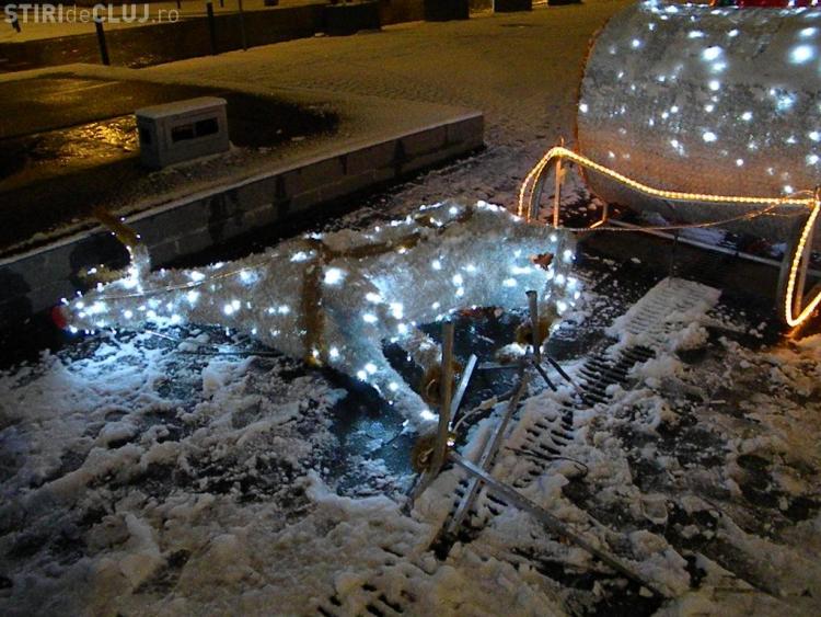 Renul de la sania lui Mos Craciun, ornament amplasat pe Bulevardul Eroilor, a cazut victima unor vandali, care l-au lovit pana cand a cazut la pamant.