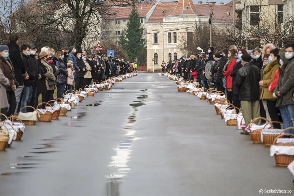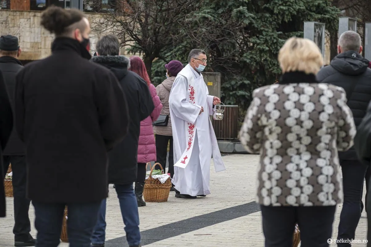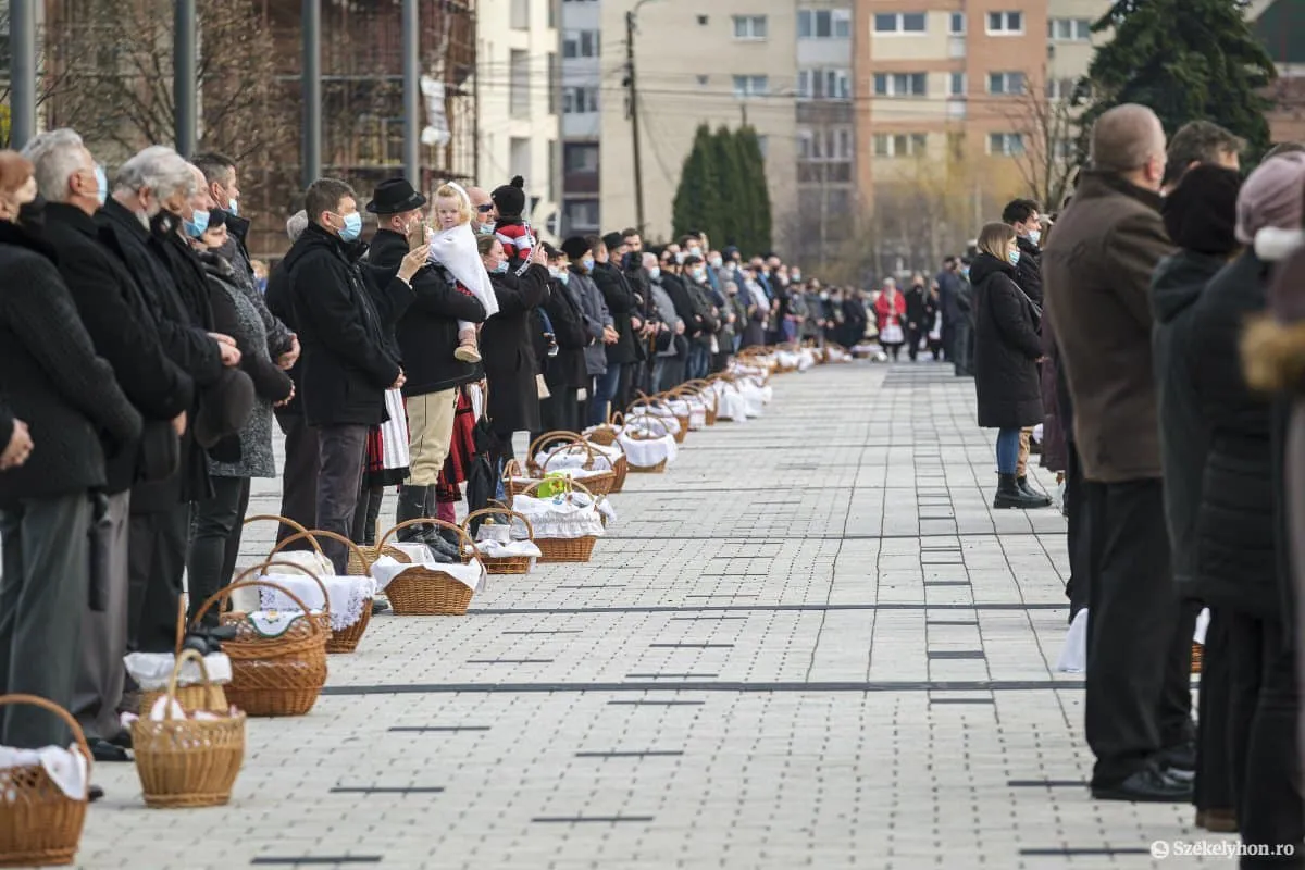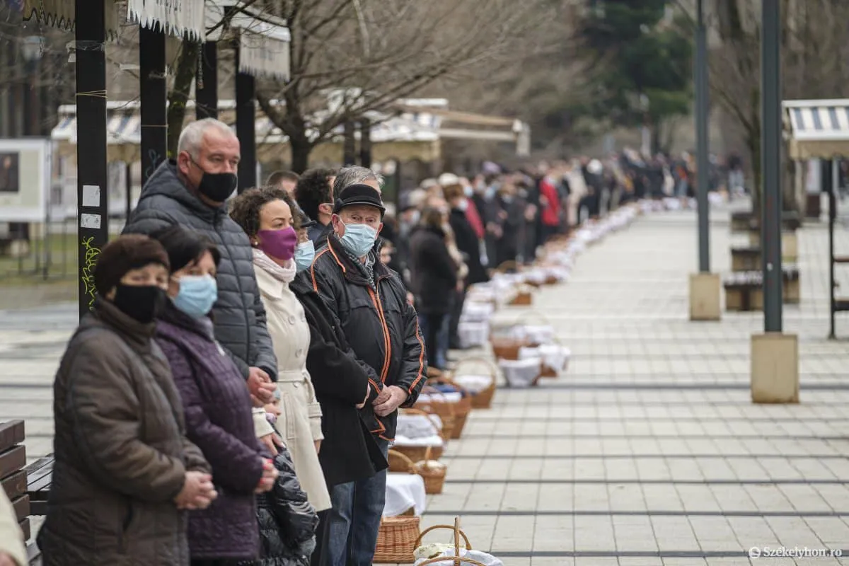 Dacă în alţi ani ceremonialul se desfăşura doar pe platoul din faţa Palatului Administrativ din Miercurea Ciuc, autorităţile au decis, în acest an, să extindă zona, pentru păstrarea distanţei fizice, scrie Agerpres. A fost blocată circulaţia pe două bulevarde din centrul oraşului, iar oamenii, purtând coşuri în care se aflau bucate de Paşti, s-au aşezat în ordine într-o zonă în formă de cruce.