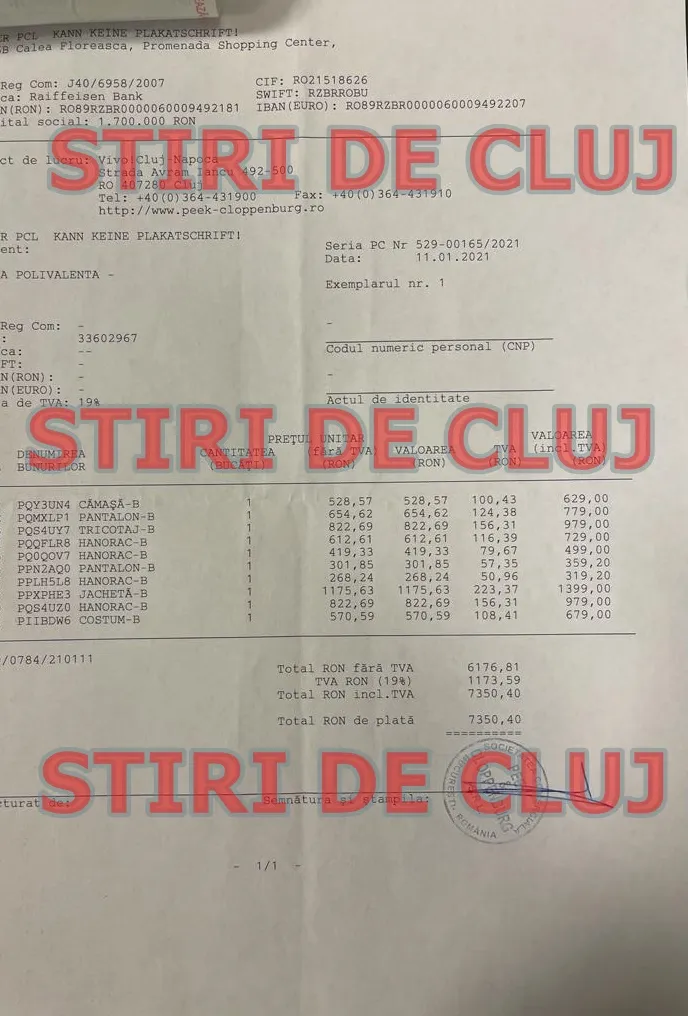 Factura emisă de Peek & Cloppenburg și datele oferite de firmă arată exact ce s-a cumpărat pentru ”angajații” de la Sala Polivalentă afectați de pandemie, care aveau lefurile tăiate și fuseseră dați afară.