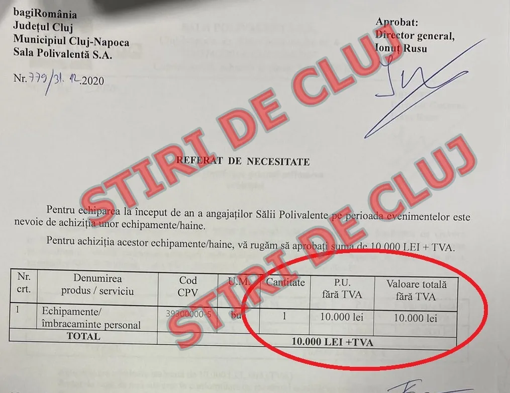 În 31 decembrie 2020, ”noaptea ca hoții”, în ultima zi a anului, directorul Sălii Polivalente din Cluj-Napoca, Ionuț Rusu, a aprobat un referat de necesitate, pentru cheltuirea sumei de 10.000 de lei plus TVA, achiziție cu denumirea ”echipamente / îmbrăcăminte personal”. Achiziția este anormală, fiind vorba despre un an de pandemie, când și așa Sala Polivalentă din Cluj a avut pierderi, a dat oameni afară și a redus salariile celor rămași. În plus, Sala nu a avut activitate, pentru că nu s-au ținut deloc evenimente. Toate aceste lucruri fac ca nici măcar de echipamentele pentru angajați să nu fie nevoie.