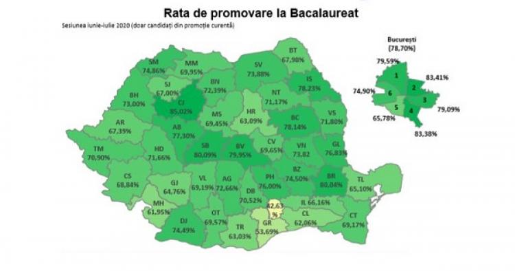 Potrivit datelor furnizate de Ministerul Educației, județul cu cea mai mare rată de promovare în sesiunea iunie-iulie 2021, înainte de contestații, este Cluj, cu 84,1%. Pe locul doi se află județul Galați, cu 82,8%, fiind urmat de județele Iași (81,9%) și Brăila (80,4%).
