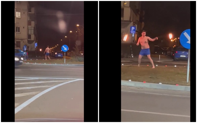 Șoferii care au trecut prin zonă au rămas uimiți de spectacolul oferit, dar în paralel au sunat și la 112. Acesta a fost pus să se îmbrace și probabil a fost dus acasă.
