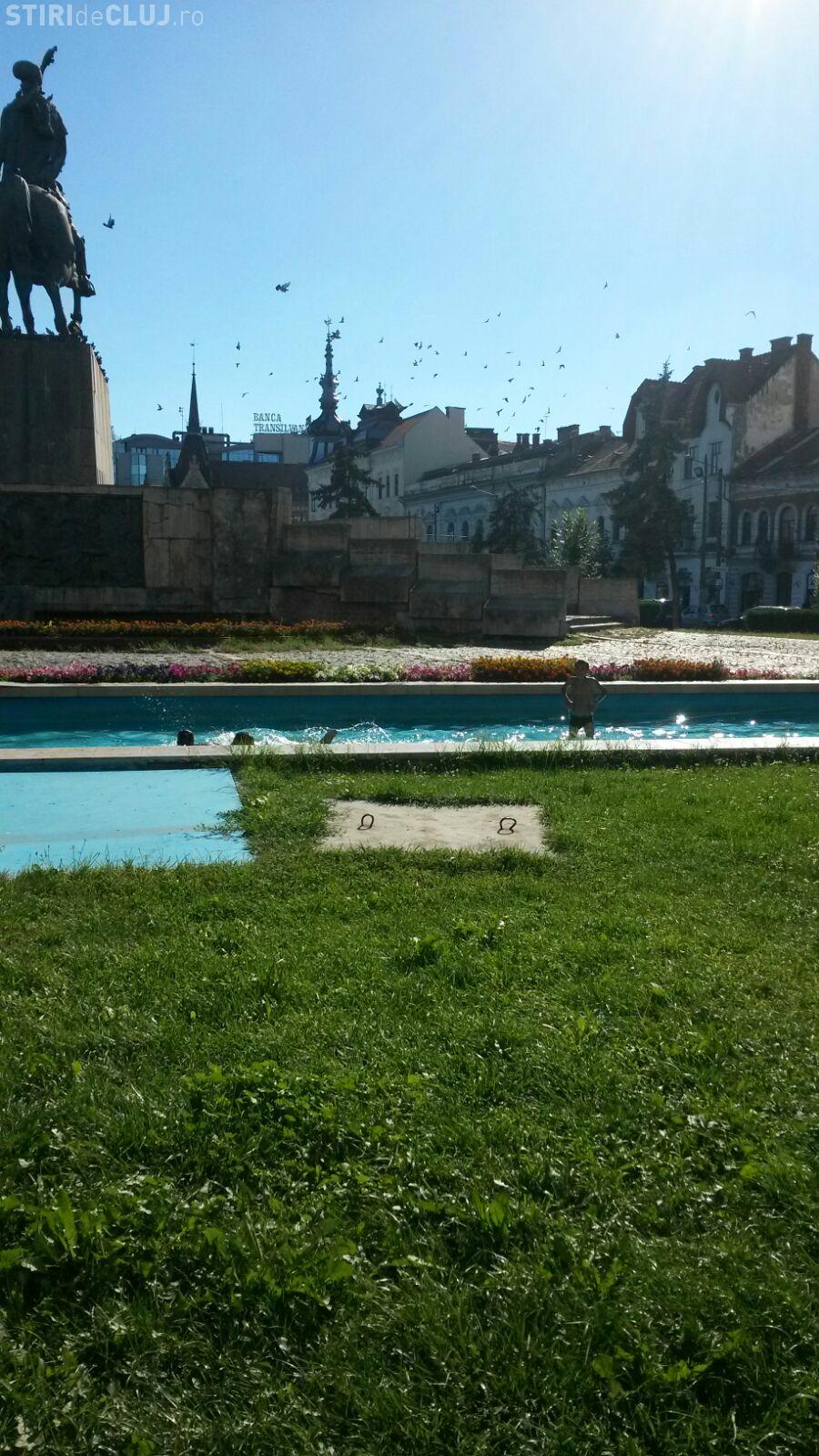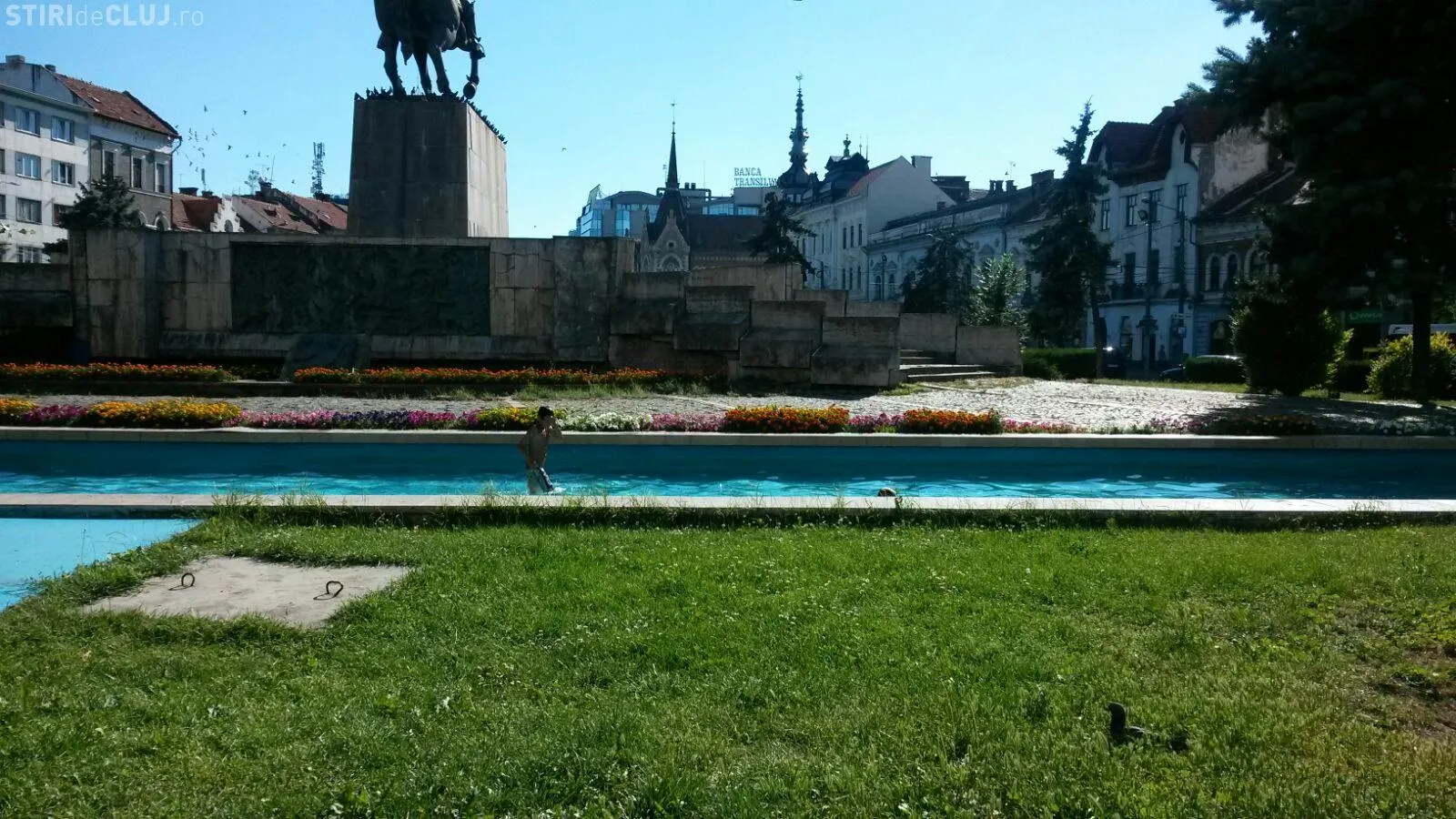 Fântâna arteziană din spatele statuii lui Mihai Viteazu, din centrul municipiului Cluj-Napoca, a devenit ”piscina” unor copii de etnie romă.