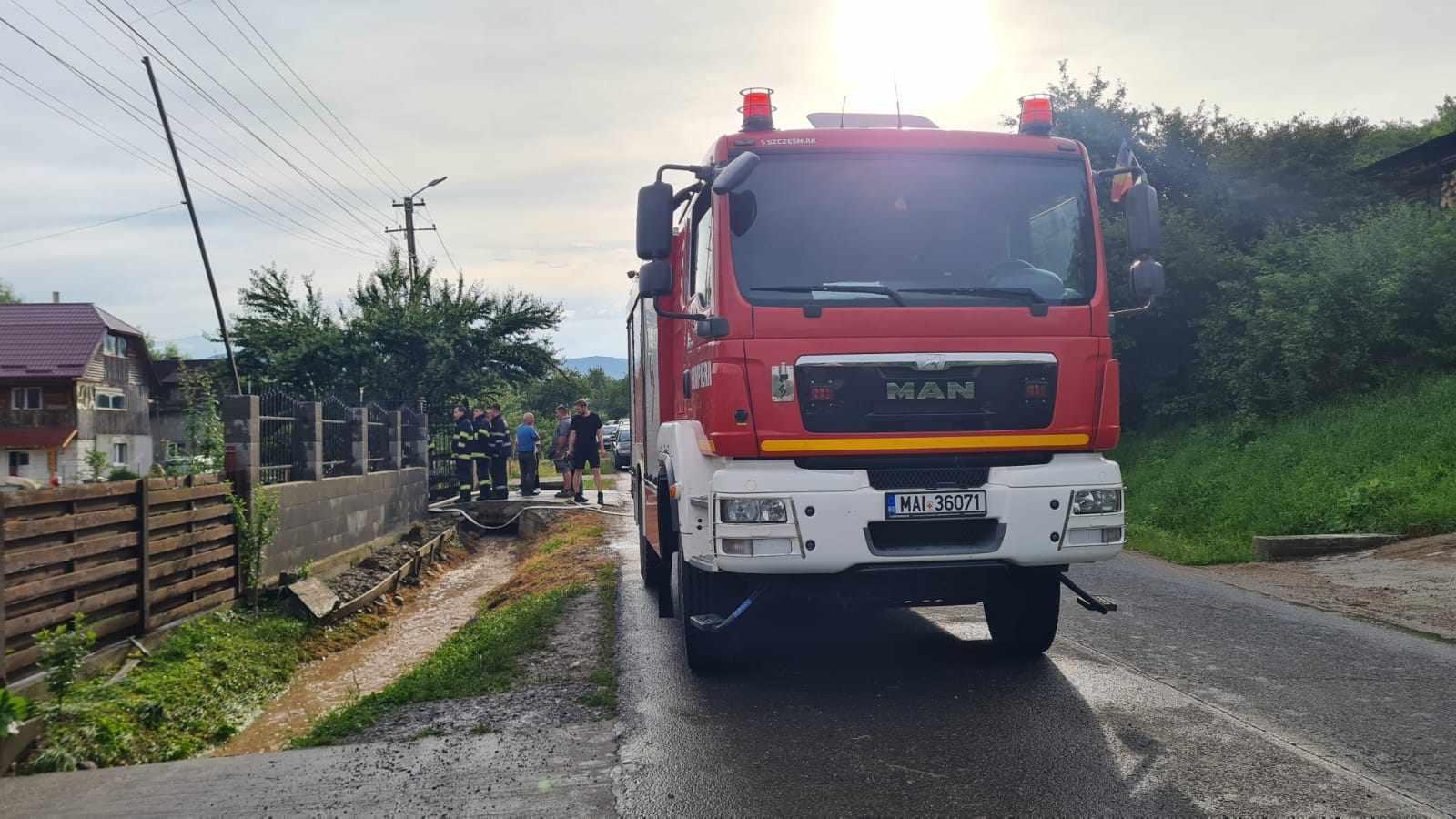 „În localitatea Hășdate, pompierii de la Garda de Intervenție Băișoara au evacuat apa din trei beciuri și au fost solicitați pentru a degaja o parte a unui acoperiș de casă, afectată de fenomenele meteo.