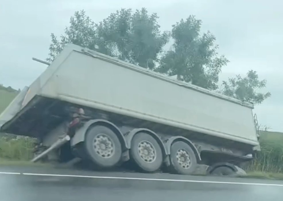 Basculantă ieșită de pe carosabil la coborâre spre Păniceni. Trafic îngreunat, dar se circulă