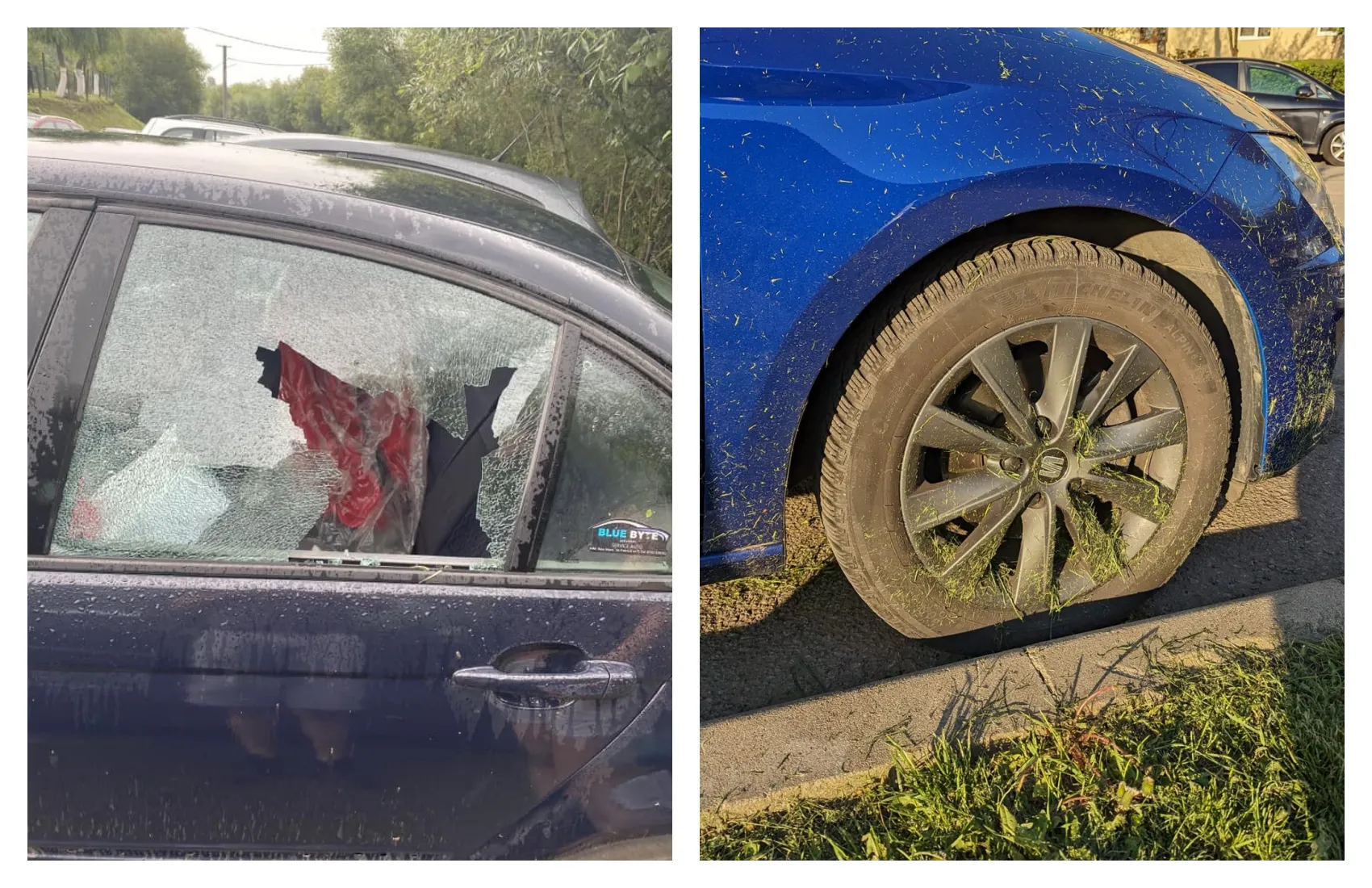 Așadar, mai mulți șoferi s-au trezit cu geamurile sparte, mașinile zgâriate și o altă „surpriză”, polish auto „natural” de iarbă.