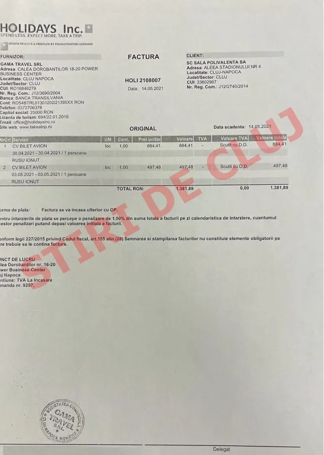Știri de Cluj a obținut și o factură care arată că directorul Sălii Polivalente, Ionuț Rusu, se deplasa liniștit cu avionul la București, cu toate că bugetul Sălii era pe minus. Mai jos este o factură pentru două bilete de avion, din intervalul 30.04.2021 - 3.05.2021, adică fix în perioada în care își sărbătorea ziua de naștere. Ionuț Rusu este născut în 1 mai. Sala Polivalentă nu avea niciun eveniment în acea perioadă, fiind închisă, dar directorul ar putea motiva că a discutat cu diverși organizatori, timp de 4 zile.