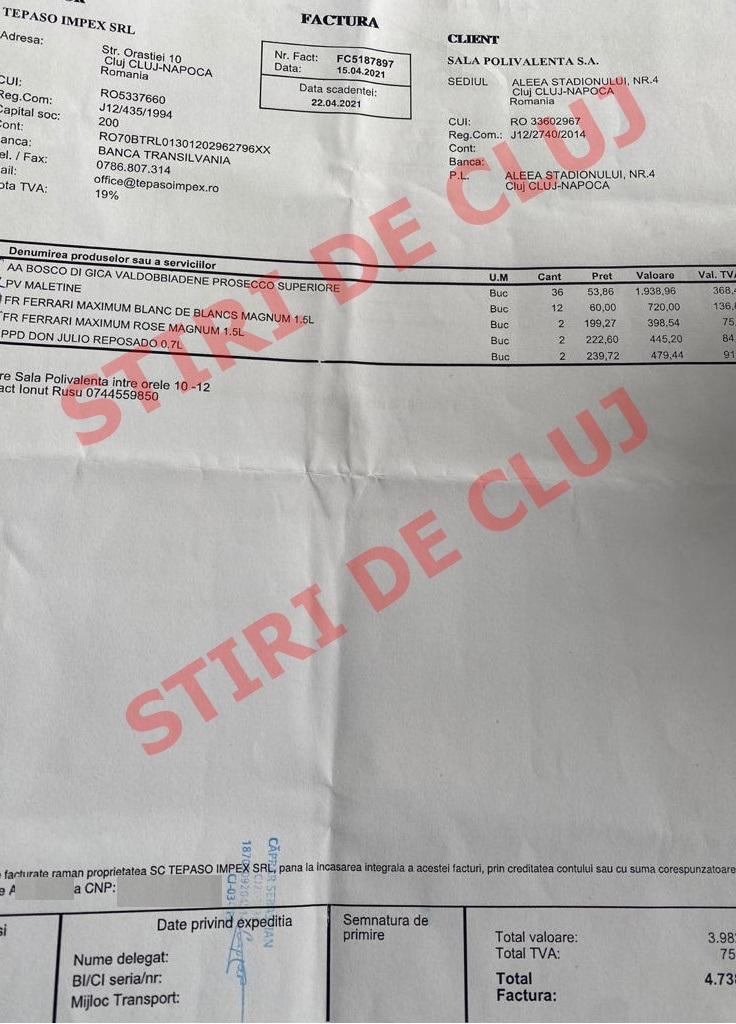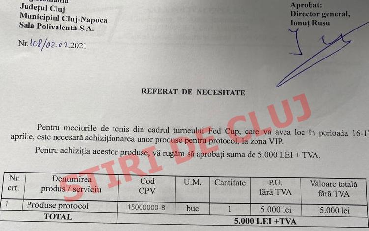 Sala Polivalentă Cluj, prin directorul Ionuț Rusu, a cumpărat în 22 aprilie băutură cât pentru un botez, motivând că este pentru salonul VIP de la Fed Cup, eveniment care a avut loc în 16 și 17 aprilie 2021.