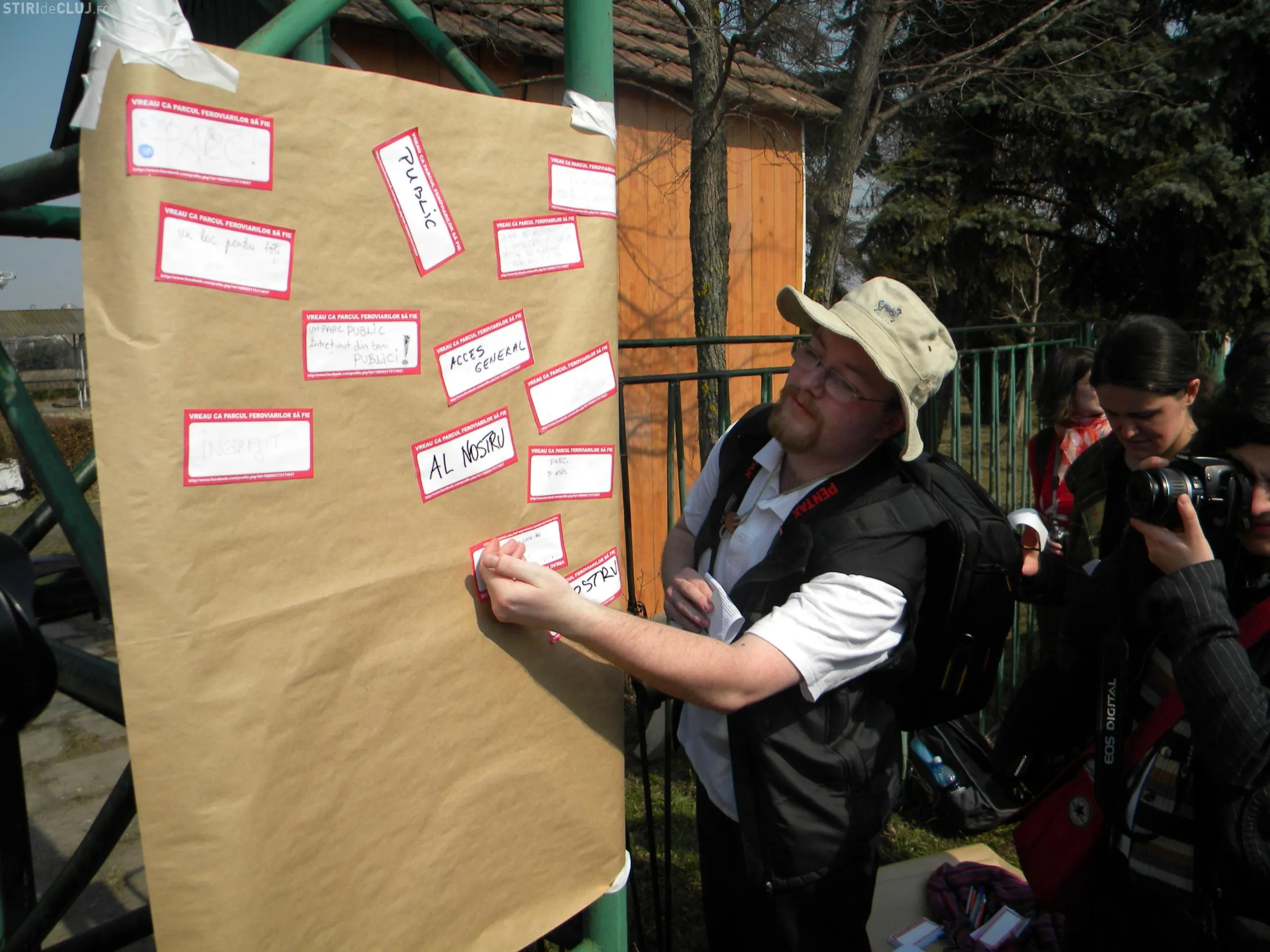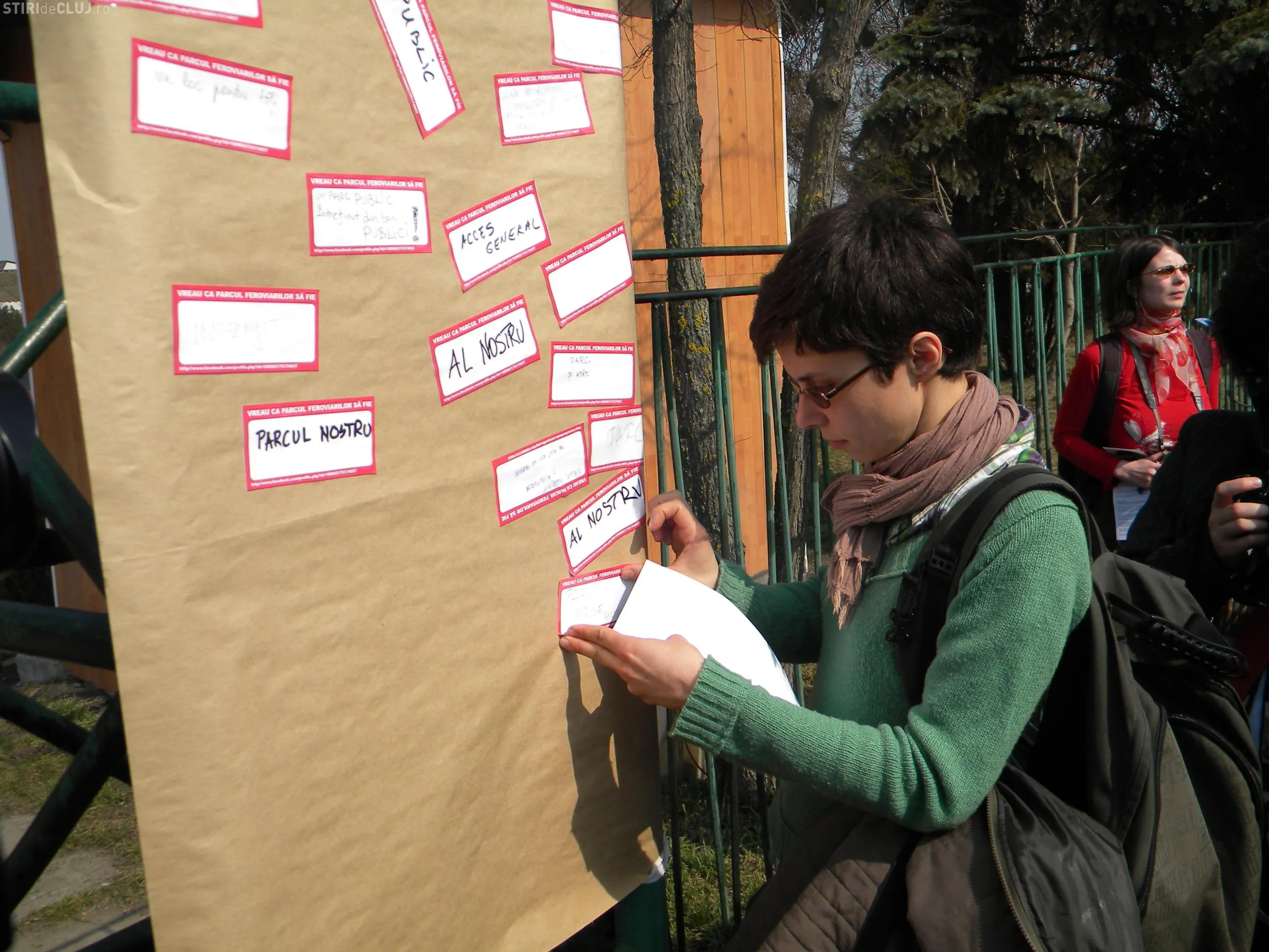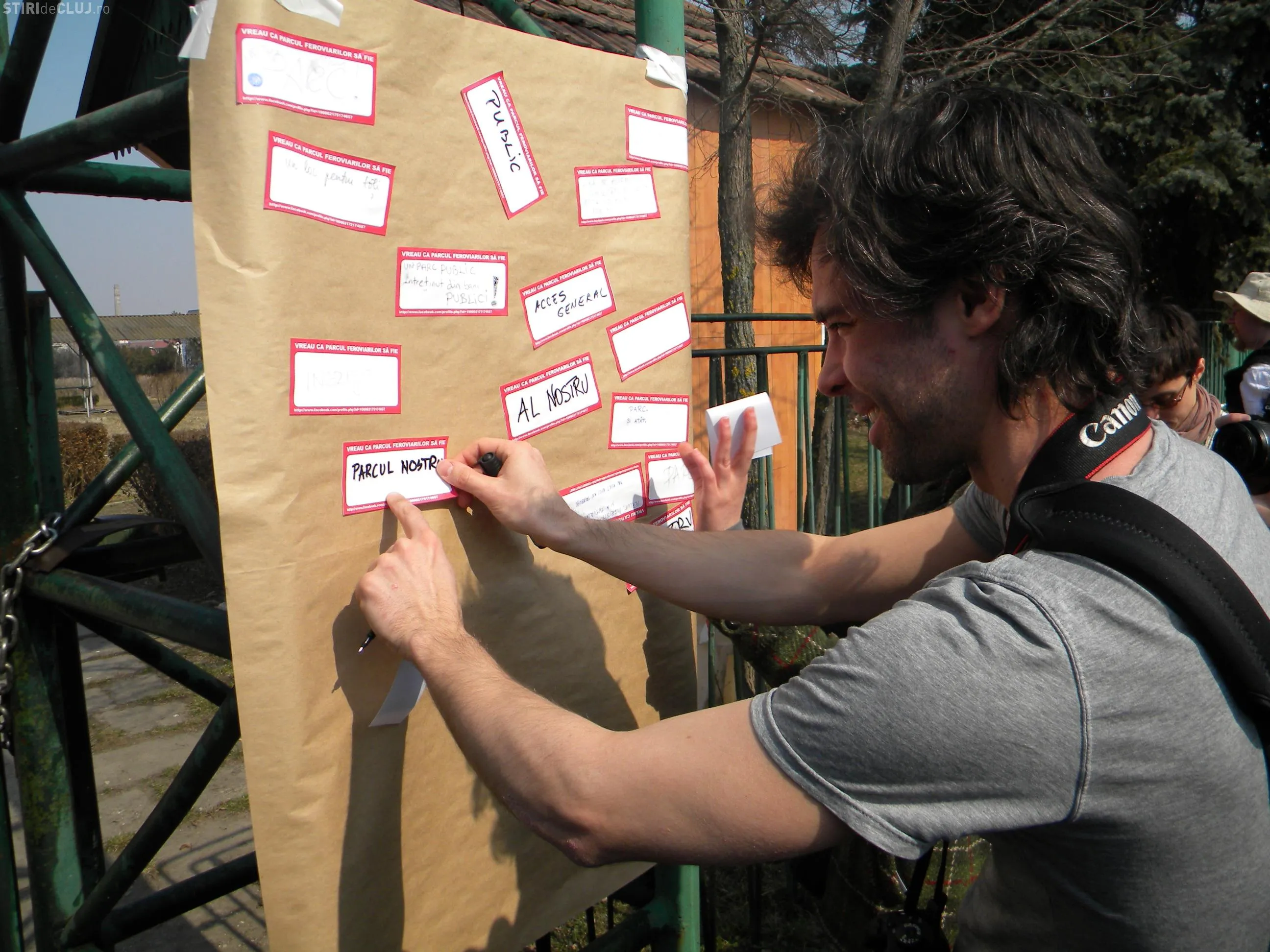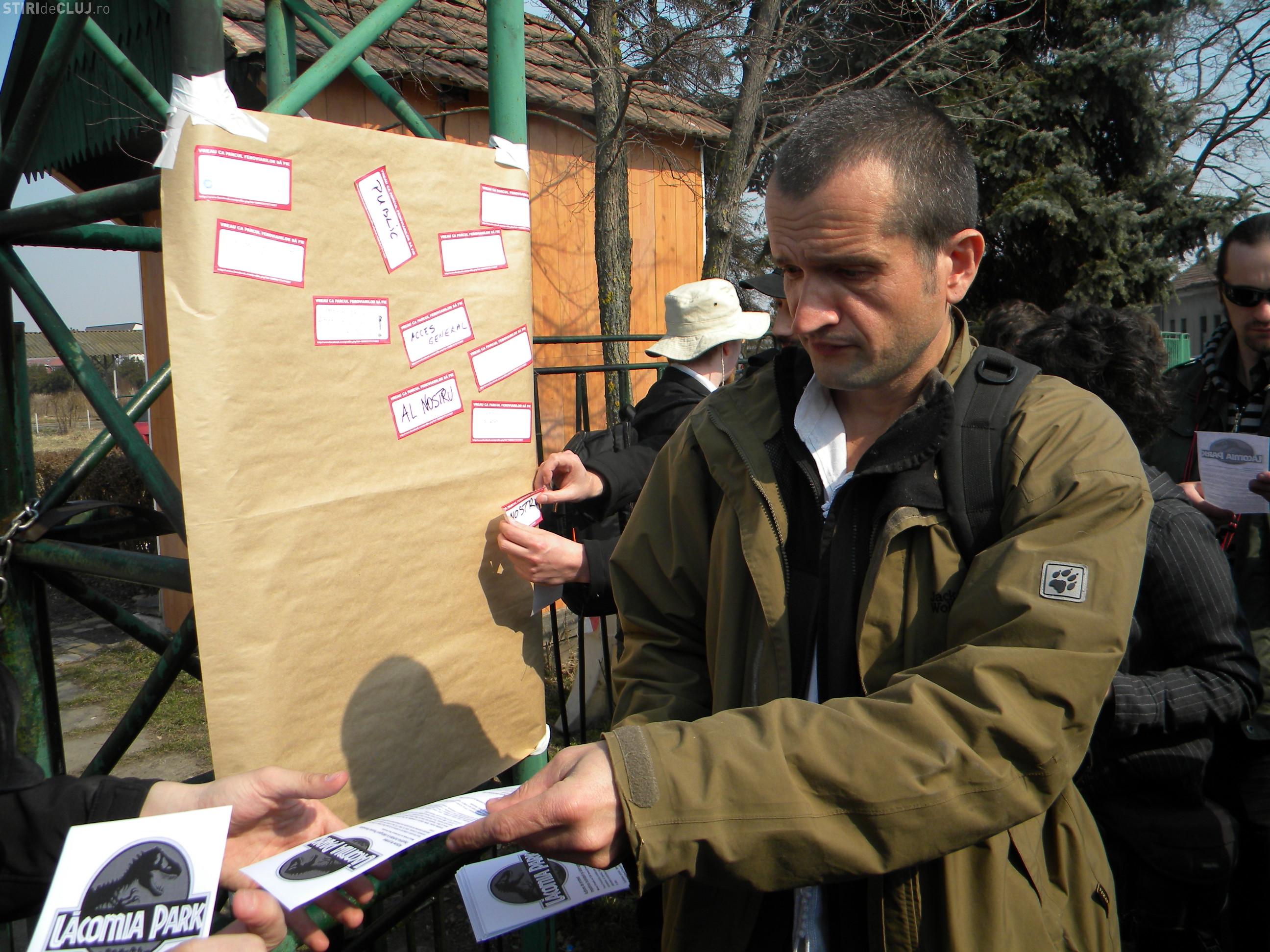 Protestul a inceput la ora 13.00 si toti participantii au primit cate un sticker pe care au scris mesaje si le-au lipit apoi pe un panou de pe poarta parcului.