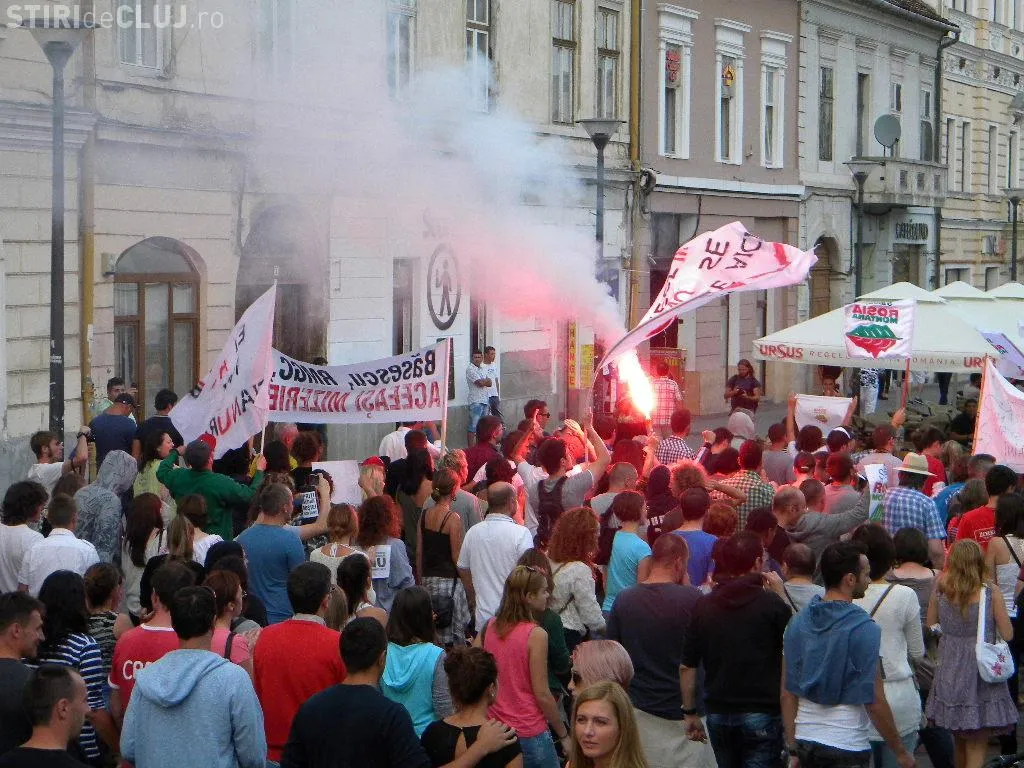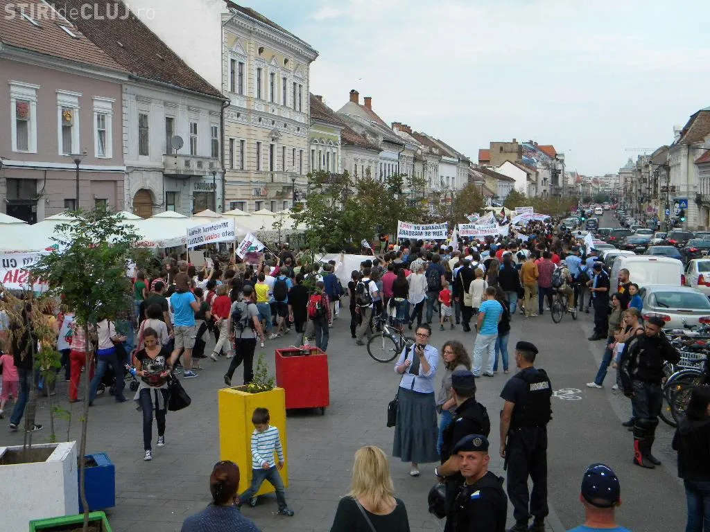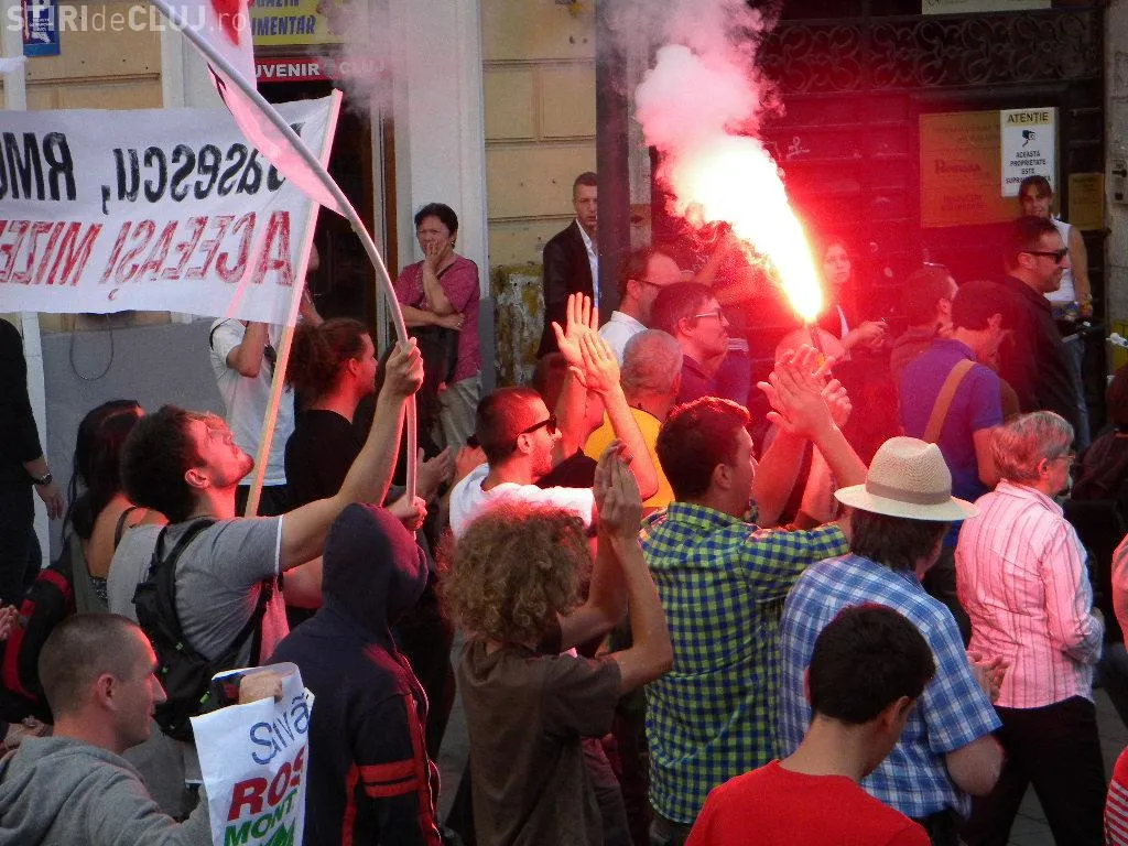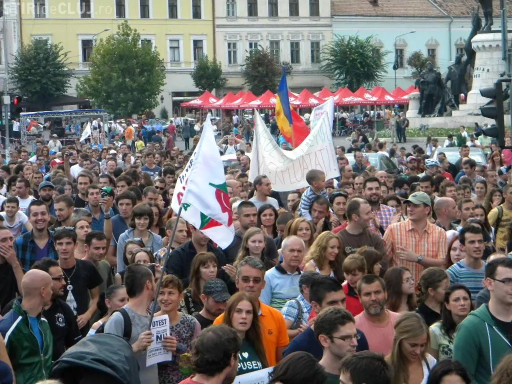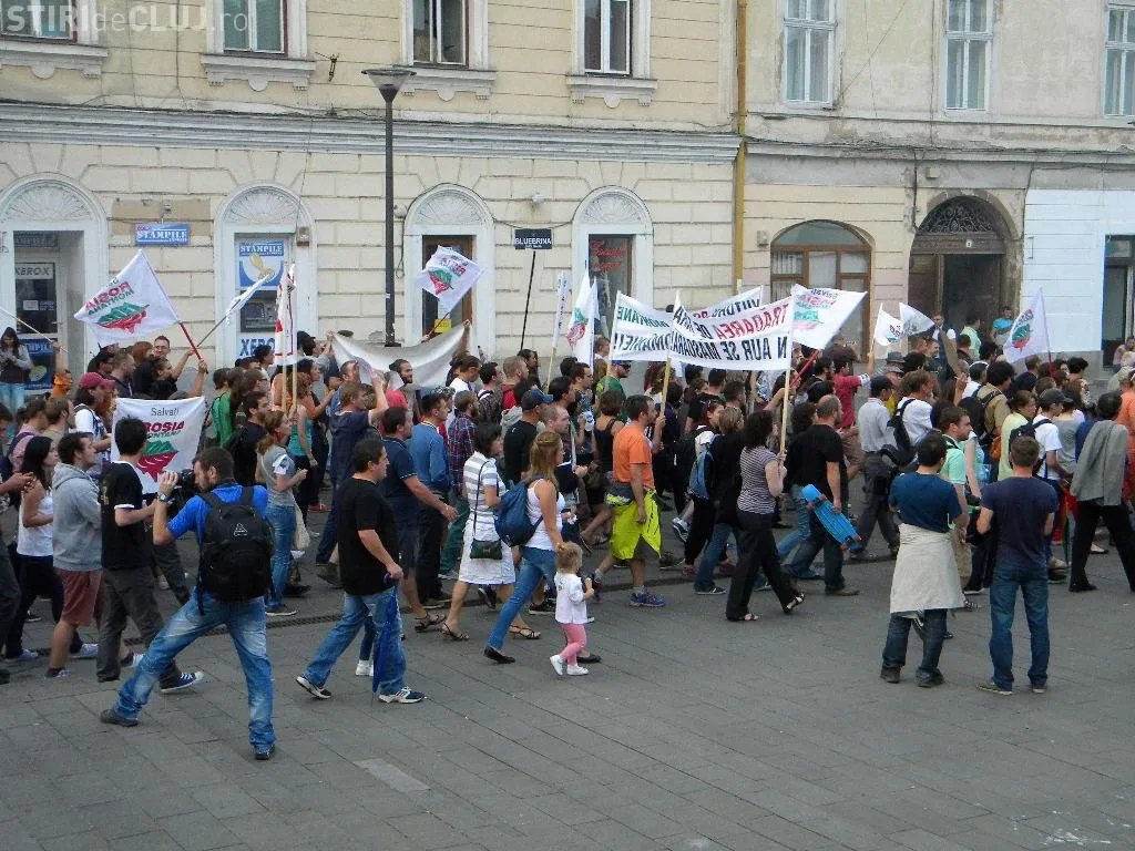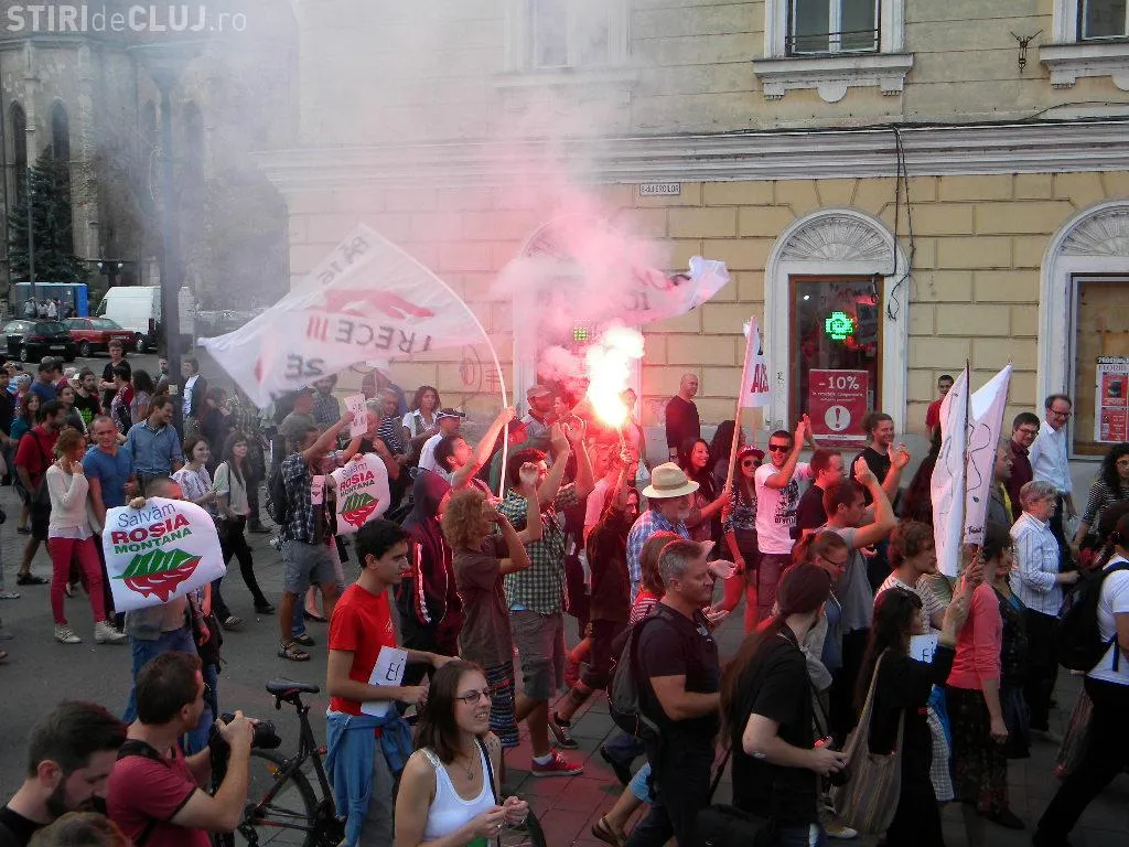 Mulțimea s-a strâns în Piața Unirii la ora 17.00, iar după circa o oră de scandări împotriva clasei politice care susține proiectul, protestatarii au pornit într-un marș prin centrul Clujului.