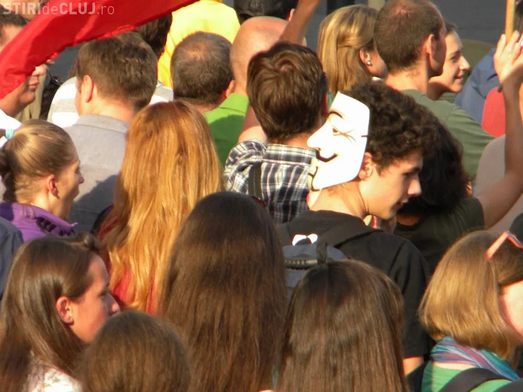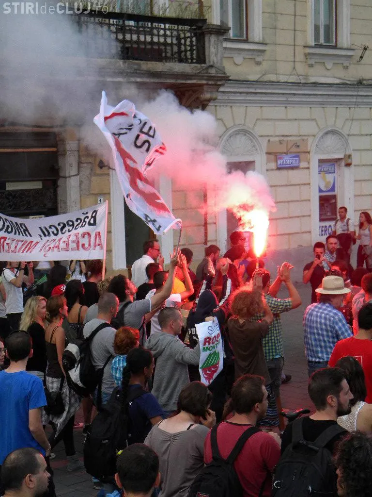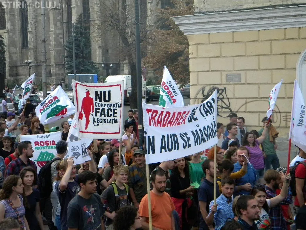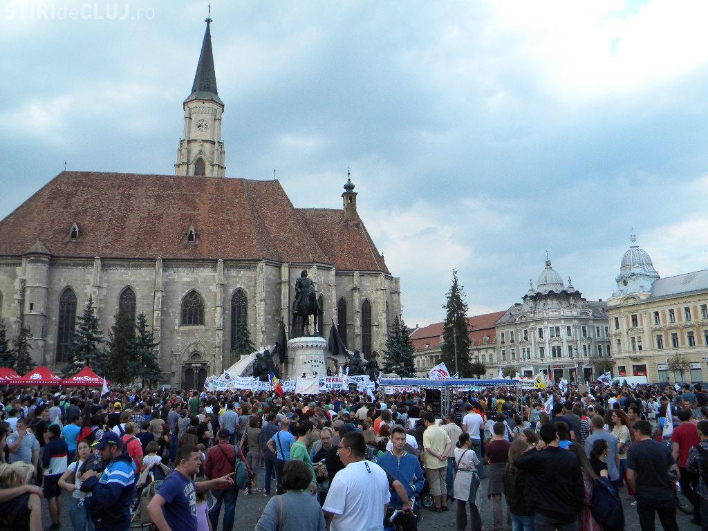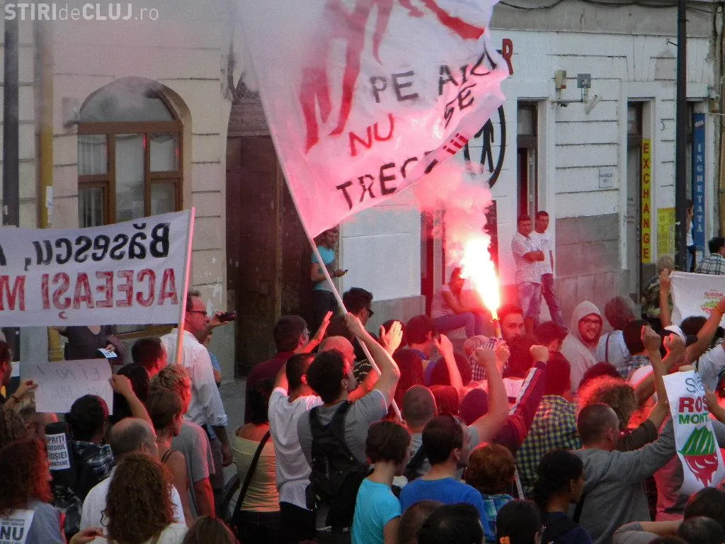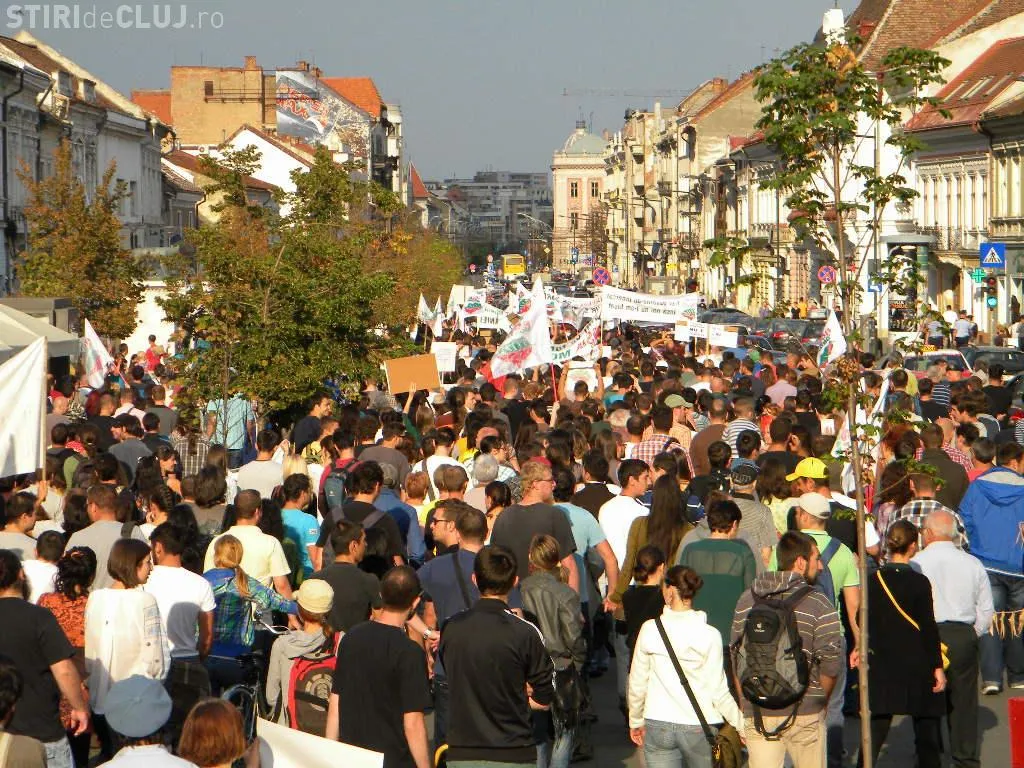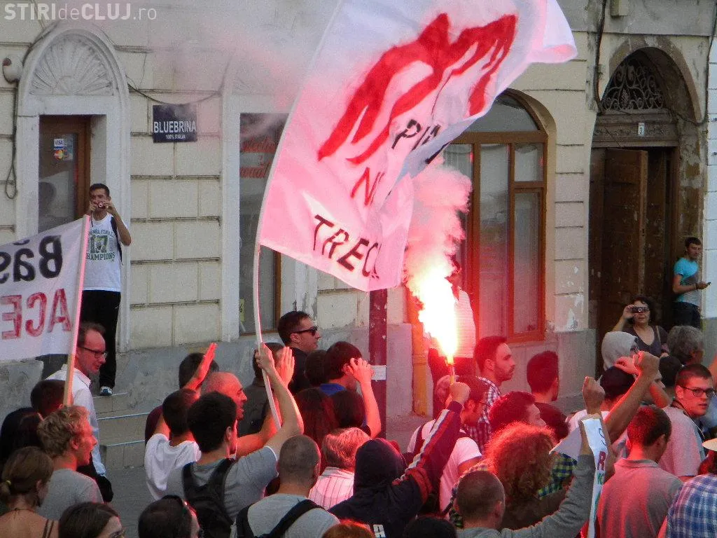 Mulțimea s-a strâns în Piața Unirii la ora 17.00, iar după circa o oră de scandări împotriva clasei politice care susține proiectul, protestatarii au pornit într-un marș prin centrul Clujului.
