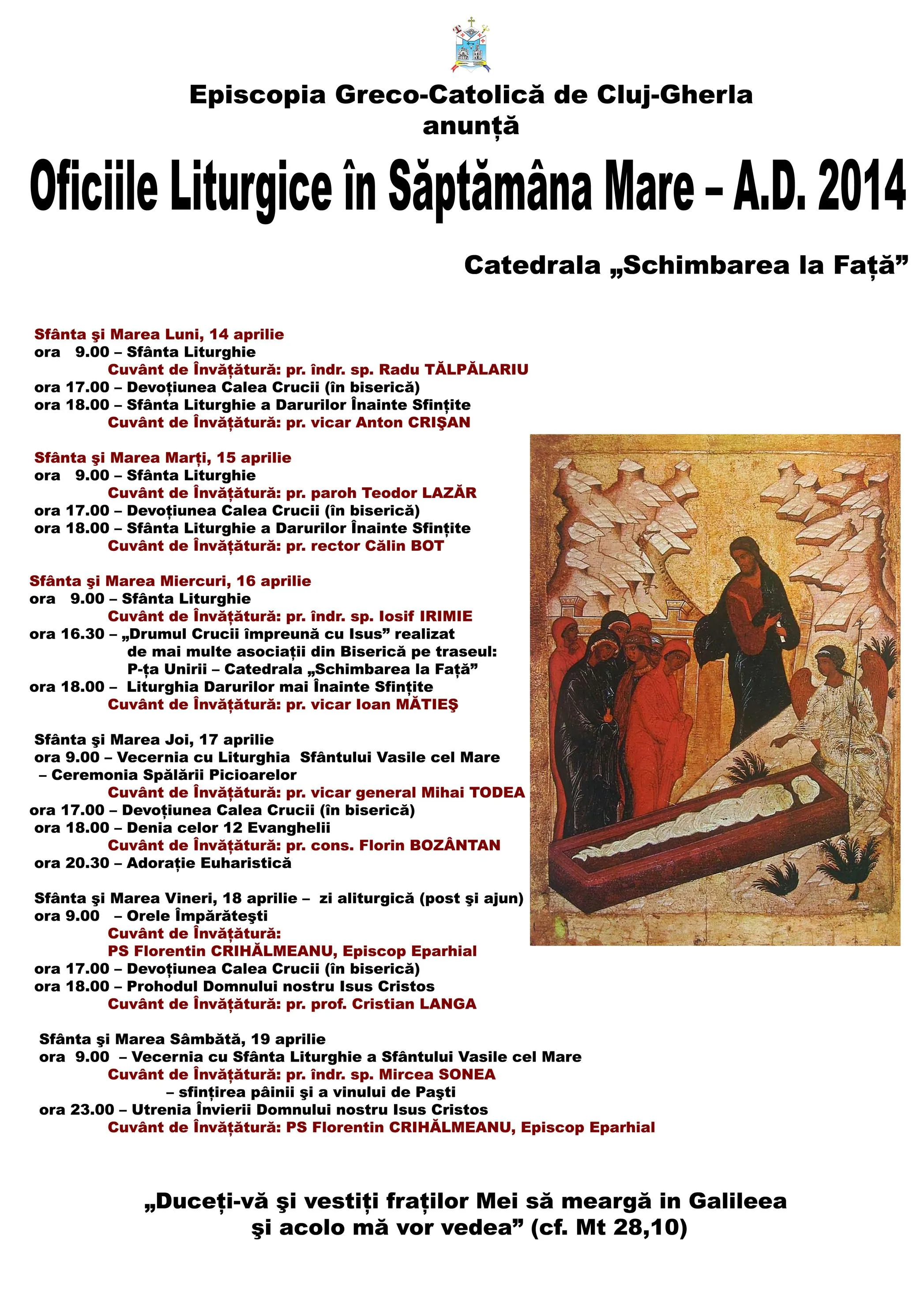 Toate celebrările Săptămânii Mari şi ale Sărbătorii Învierii din Catedrala episcopală greco-catolică, vor fi însoţite de cuvinte de învăţătură explicative susţinute preoţi profesori şi consilieri eparhiali şi de Episcopul eparhial de Cluj-Gherla.