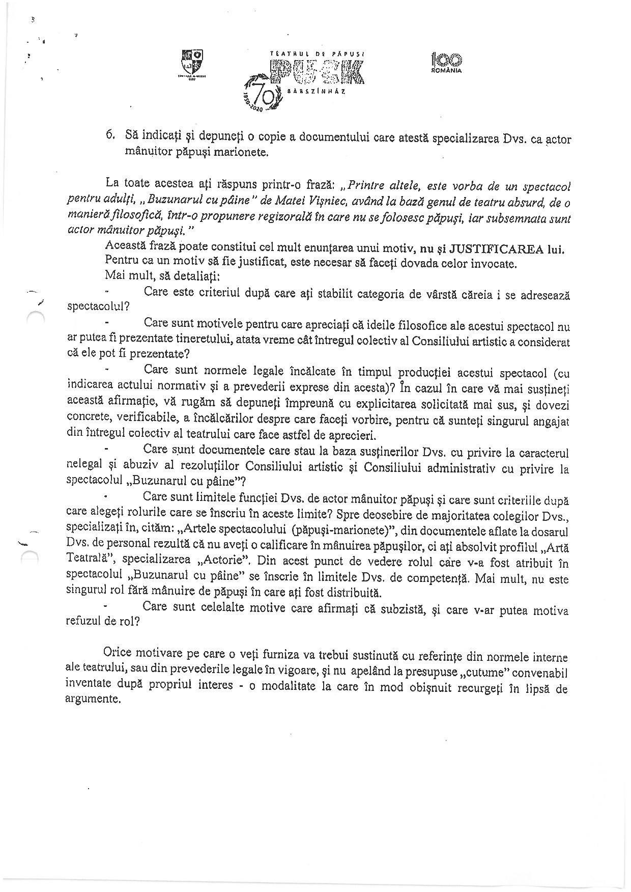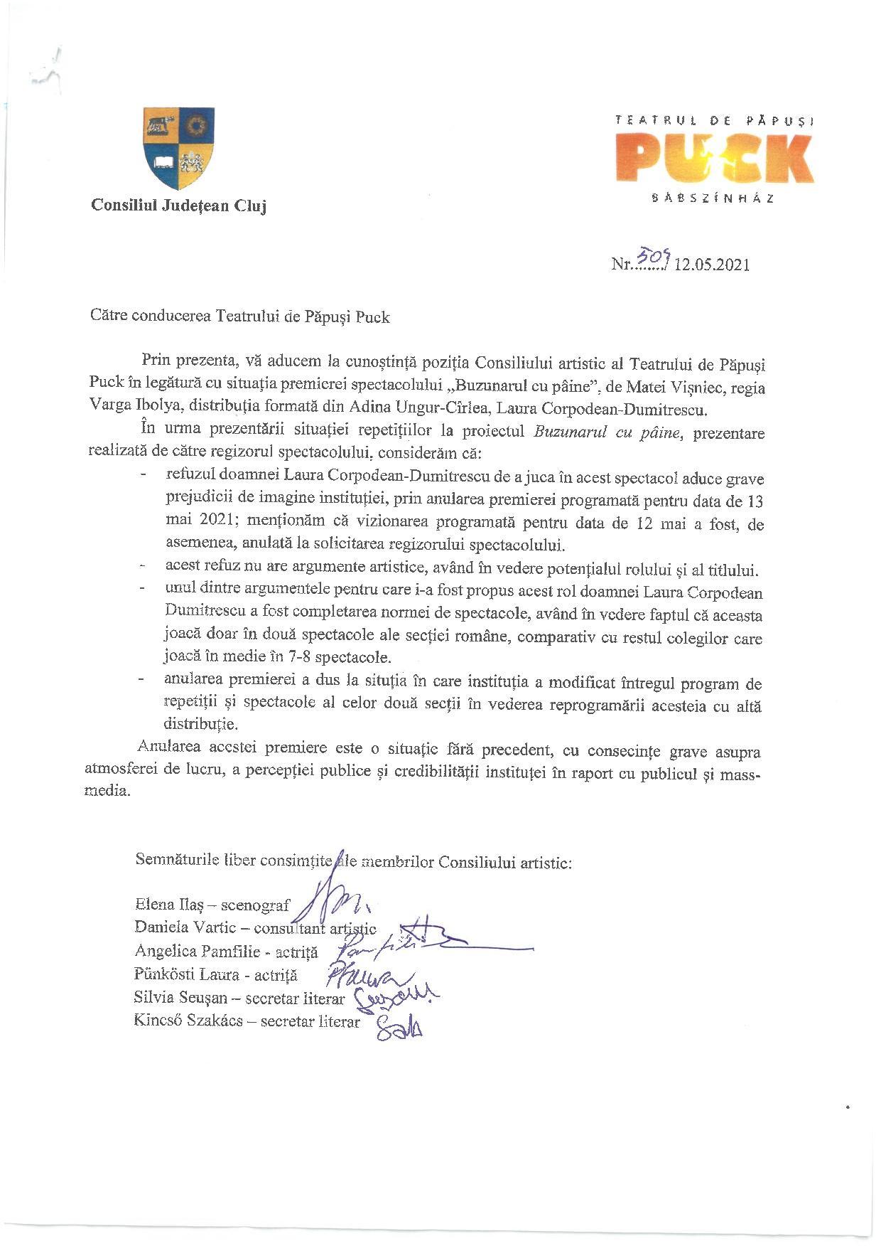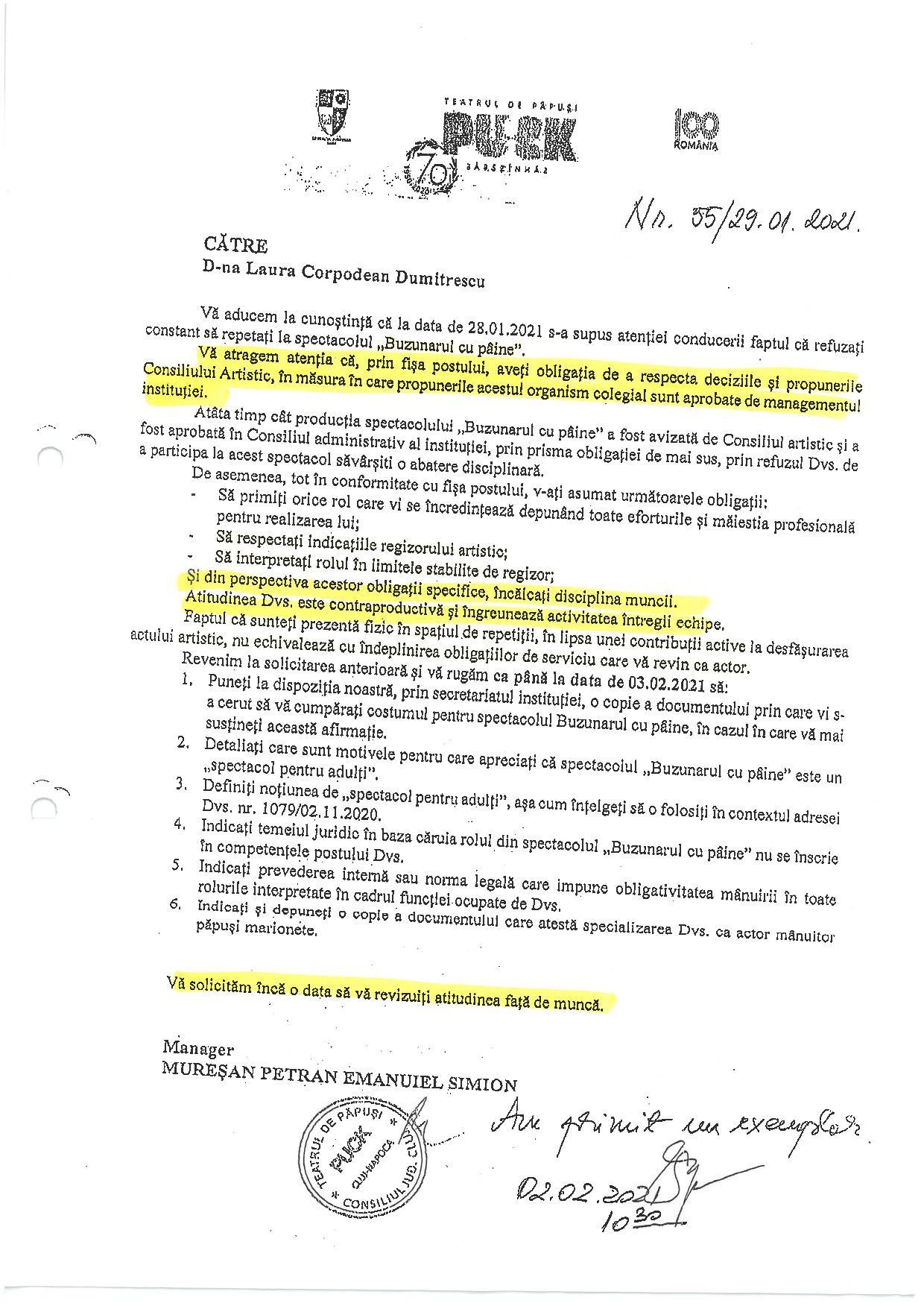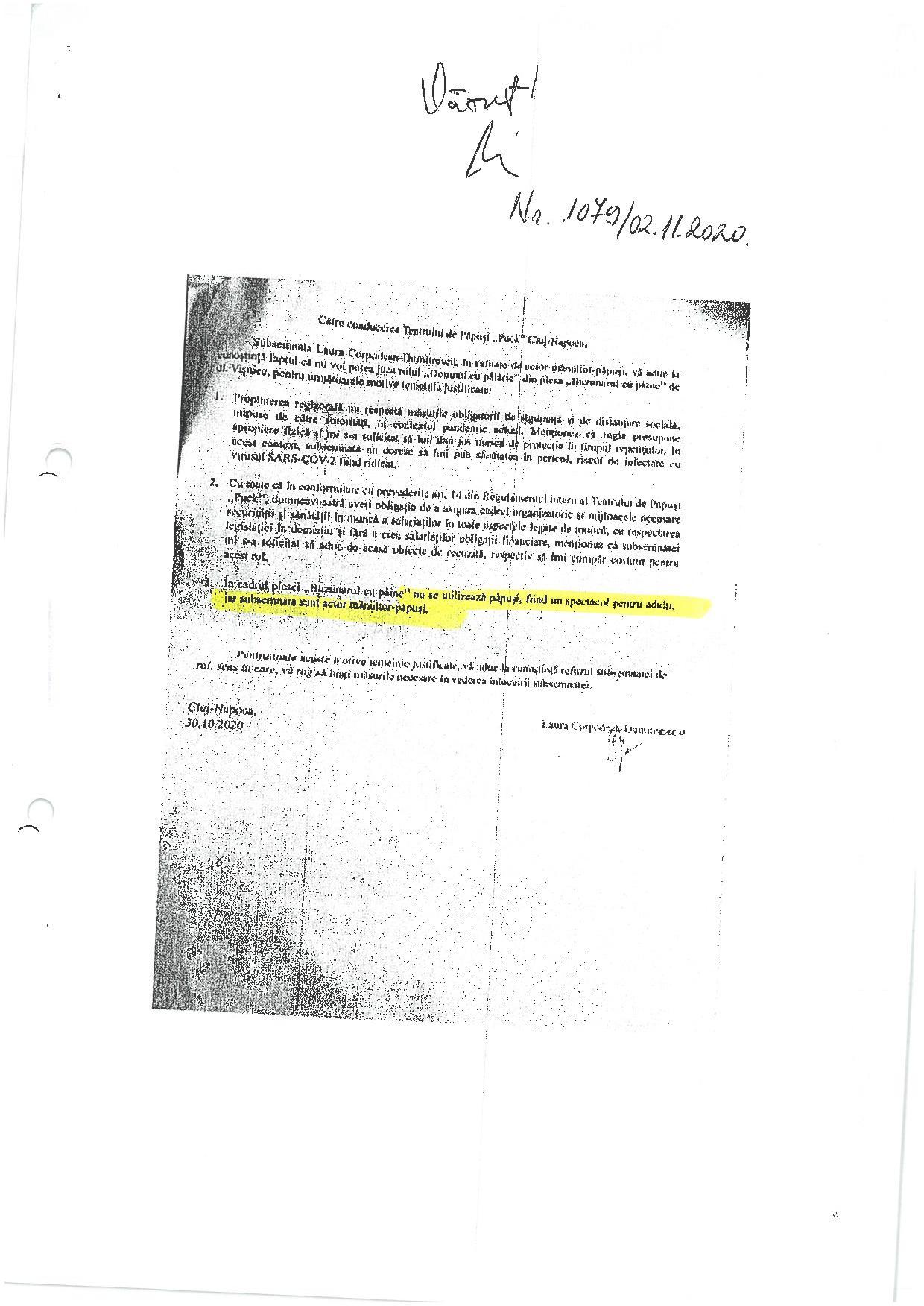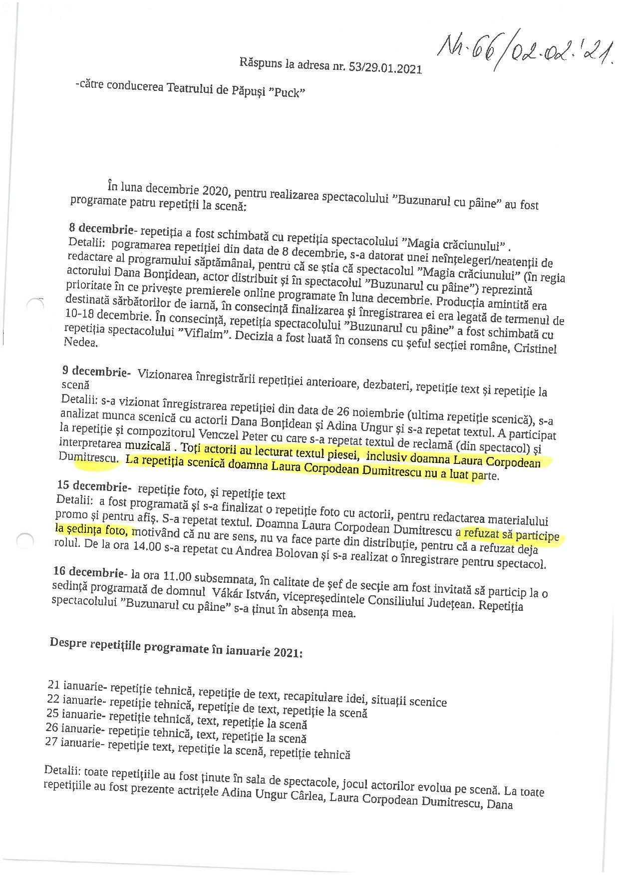 Acesta a prezentat și motivarea pe care a prezentat-o actrița Laura Corpodean, încă din noiembrie 2020. În document refuzul este motivat de nerespectarea distanțării sociale și că în cadrul piesei ”Buzunarul cu pâine” nu se utilizează păpuși, fiind un spectacol pentru adulți, iar ”subsemnata sunt actor mânuitor de păpuși”.