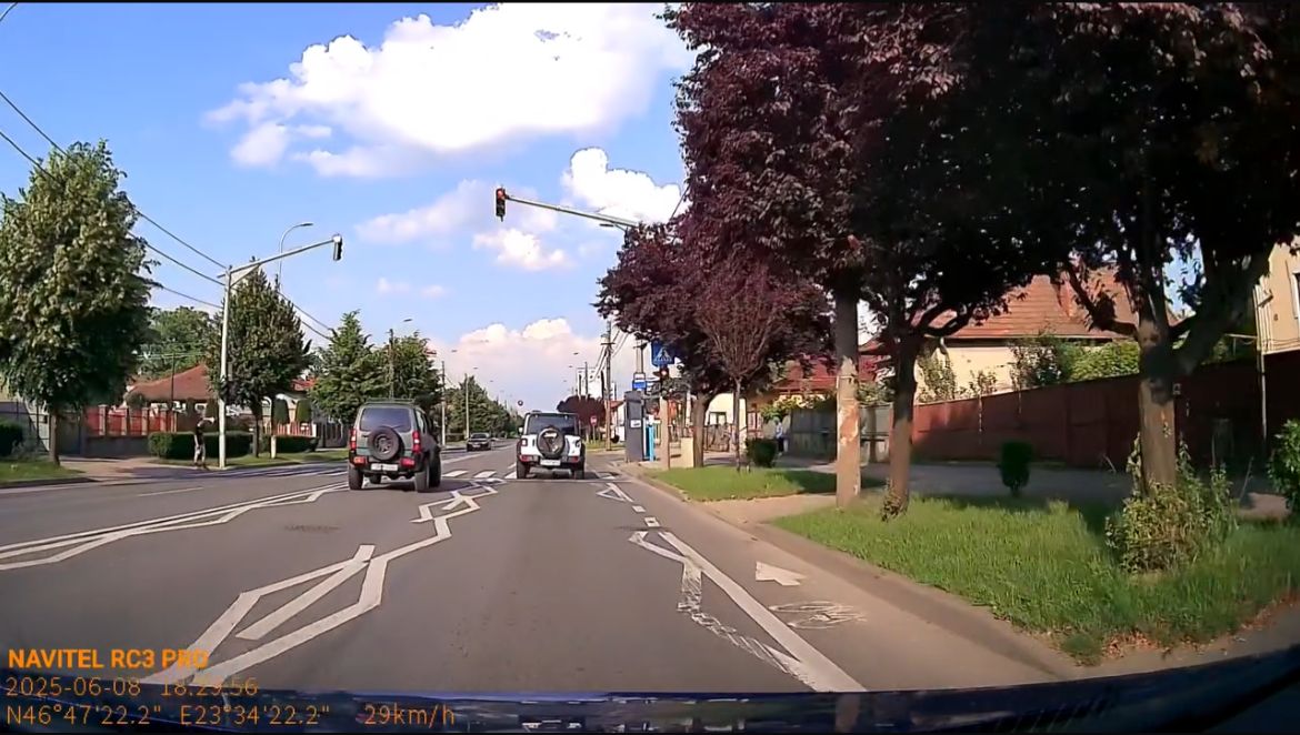 Ce a urmat pare desprins dintr-un film de acțiune, dar trăit pe viu de cei din zonă: o mașină apare brusc pe banda a doua, evită o altă mașină, apoi accelerează și trece în goană prin fața semaforului, ignorând complet culoarea roșie și marcajul pietonal. Deși nimeni nu a fost rănit, momentul a fost la un pas de tragedie.