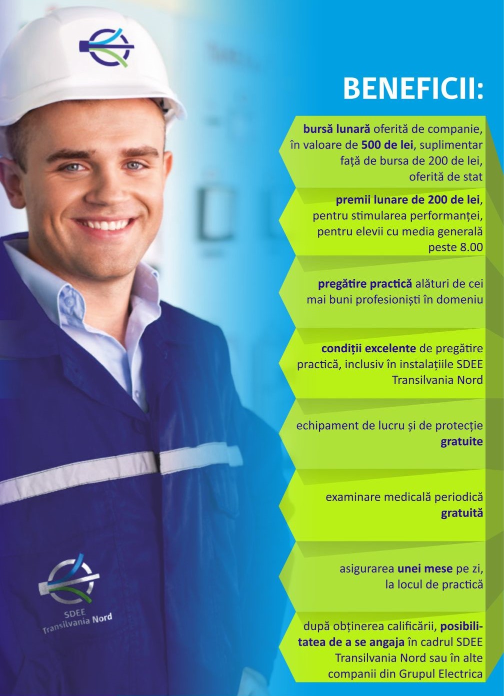 În cadrul parteneriatului, SDEE Transilvania Nord asigură fiecărui elev al clasei profesionale pe care o susține, o bursă lunară în valoare de 500 lei, la care, în funcție de rezultatele școlare, se poate adăuga un premiu de stimulare a performanței de 200 de lei/lună. Elevii vor beneficia de condiții excelente de pregătire practică, inclusiv în instalațiile SDEE Transilvania Nord, precum și de echipament de lucru și de protecție. În plus, li se va asigura o masa pe zi, la locul de practică. După obținerea calificării pentru meseria de electrician, absolvenții vor avea posibilitatea de a se angaja în cadrul SDEE Transilvania Nord sau în altă companie din Grupul Electrica.