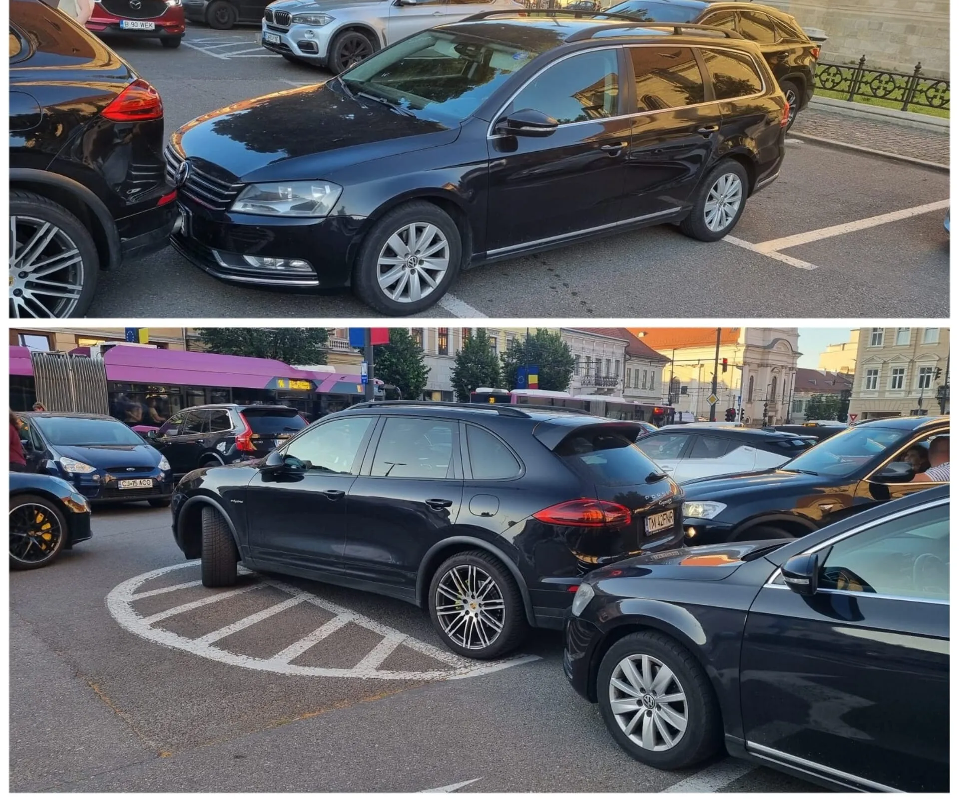 Se caută un șofer a cărui mașină a blocat singură parcarea din centrul Clujului și apoi s-a ”parcat” în altă mașină: ”Hai și trage frâna”- FOTO