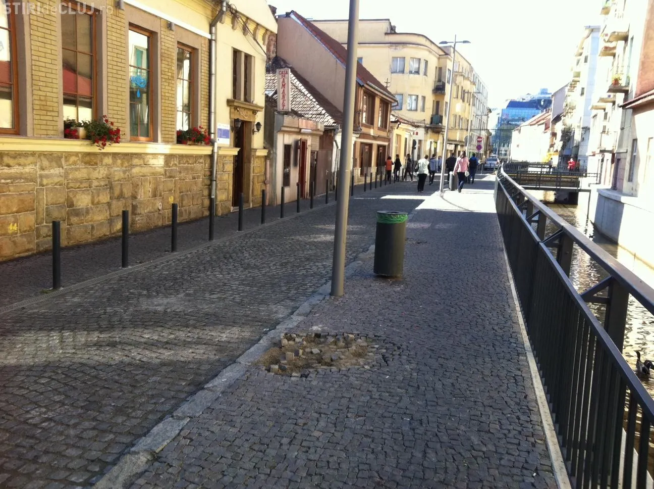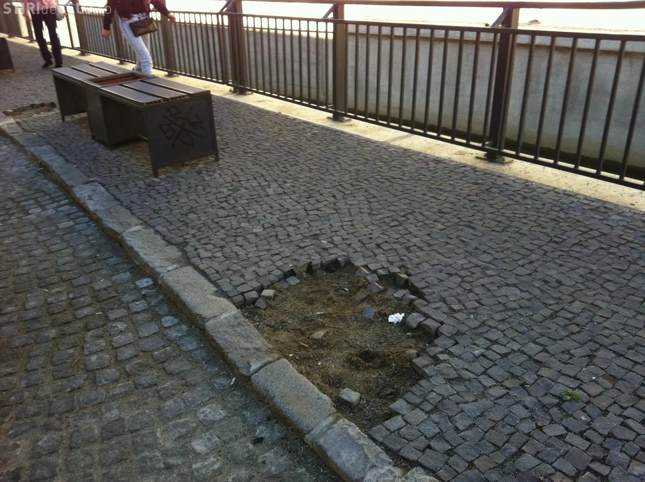 Piatra de granit de pe pietonala de lângă Canalul Morii, între strada Regele Ferdinand și Piața Mihai Viteazu, a început să dispară.