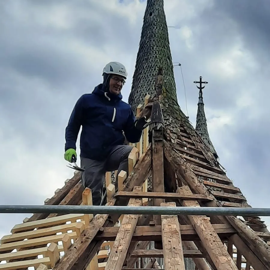 La acțiune participă și arhitectul șef al județului Cluj, Claudiu Salanță, care a lăsat costumul pentru a bate cuie și a învăța meșteșugul uitat.