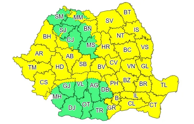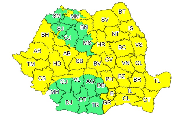 Meteorologii de la ANM au emis o serie de avertismente de tip cod galben de vremea rea, care afectează aproape toată țara.