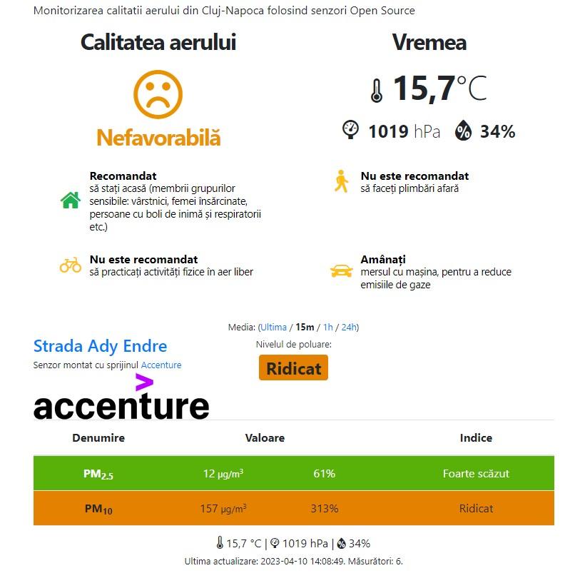 În ceea ce privește concentrația particulelor mai mari PM10, limita impusă de lege a fost depășită cu 746%. Ne bucurăm că este un episod trecător, dar pentru cei astmatici poate reprezenta o reală problemă”, a transmis Luchiian Alexandru, fondatorul proiectului „Strop de aer”, în „Clujul Civic”