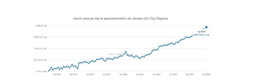 Prețul mediu al apartamentelor de vânzare din Cluj-Napoca, în ianuarie 2025 a fost de 2.928 euro/mp, în creștere cu 96 euro/mp cu față de decembrie 2024 (2.832 euro/mp) și este cu 428 de euro peste aceeași perioadă a anului 2024 (2.500 euro/mp), potrivit unei analize Compariimobiliare.ro.