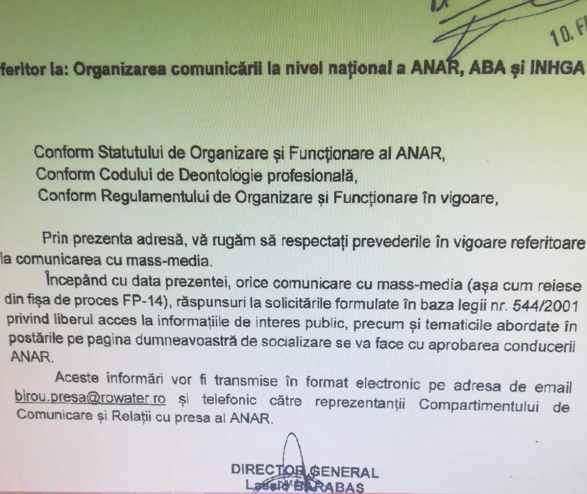 Angajații de pe Compania ”Apele Române” au primit o directivă prin care nu mai au voie să comunice cu presa.