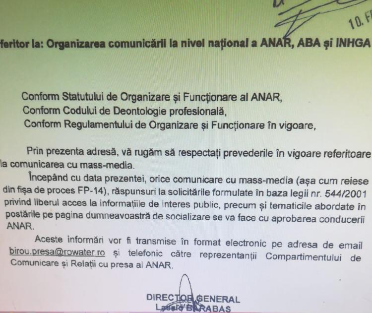 Începând cu data prezentei, orice comunicare cu mass-media (așa cum reiese din fișa de proces FP-14), răspunsuri la solicitările formulate în baza legii nr. 544/2001 privind liberul acces la informațiile de interes public, precum și tematicile abordate în postările pe pagina dumneavoastră de socializare se va face cu aprobarea conducerii ANAR.