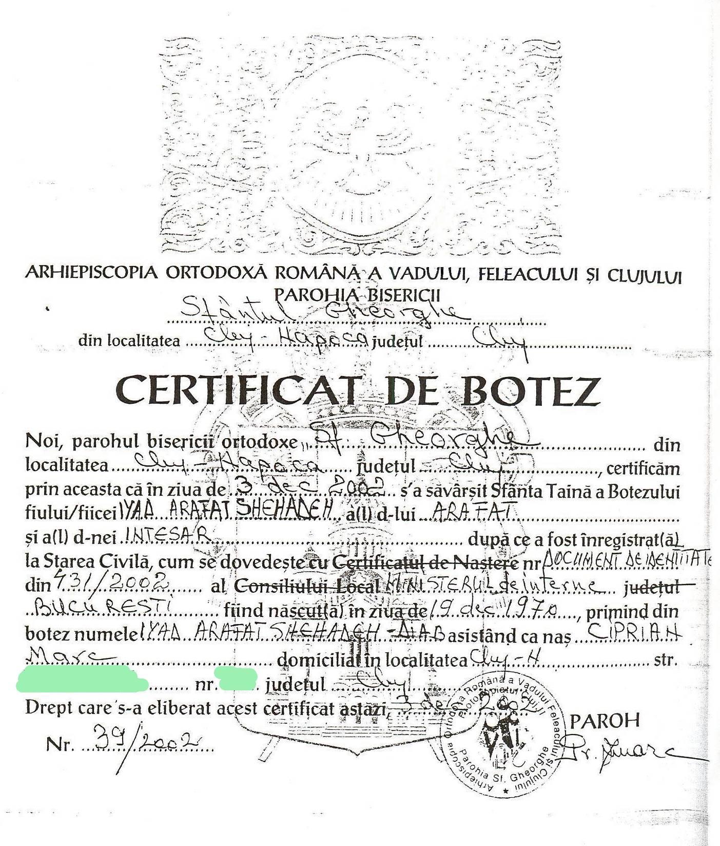 Certificatul de botez eliberat de biserica ortodoxa "Sfantul Gheorghe" din Cluj a fost publicat astazi de ziarul Curentul.