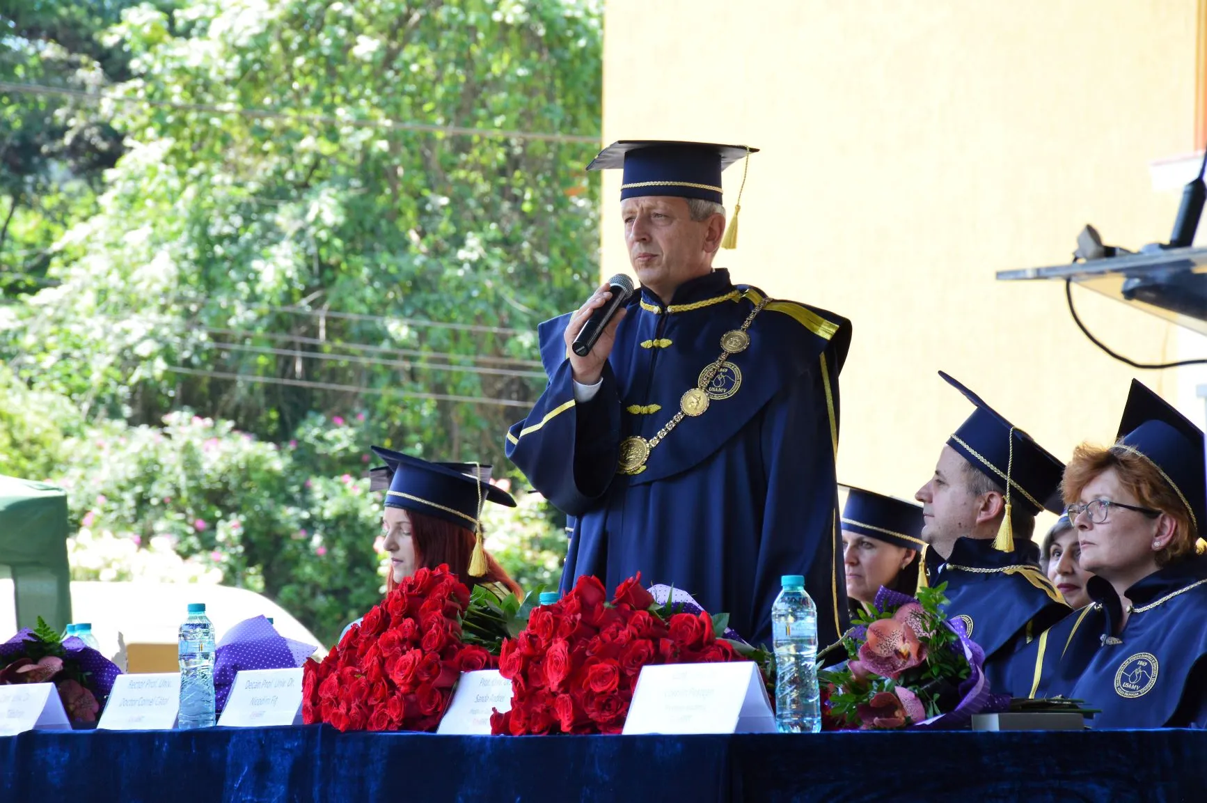 ”Festivitatea noastră este prima din calendarul de absolvire la USAMV Cluj-Napoca, iar alături de studenți suntem și noi foarte emoționați. Ei sunt primii după doi ani de întrerupere, care au cântat serenadele în campus, primii care au parte de o ceremonie ca într-o mare familie și tot primii care se vor bucura de banchetul de final de an. Sunt o generație foarte bună, care își ia zborul pe drumul ales, dar care ne mândrim că pleacă de la una din cele mai bune școli de Medicină Veterinară din sud-estul Europei. Ne încearcă și o umbră de tristețe, ca la fiecare generație de absolvenți, dar ne și bucurăm că vor purta în lume, oriunde vor merge, mesajul nostru și amintirile adunate în anii de studenție la USAMV Cluj-Napoca. Ei sunt, de fapt, ambasadorii facultății noastre, așa cum sunt și cei dinaintea lor și așa cum vor fi și viitorii studenți, pe care îi așteptăm cu drag la admitere. Mult succes medicilor veterinari, absolvenți în 2021 la USAMV Cluj-Napoca!”, a spus decanul Facultății de Medicină Veterinară, Nicodim Fiț.