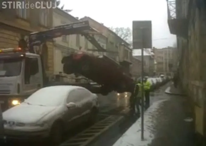 Serviciul de ridicari masini din Cluj, la un pas sa distruga un autoturism parcat neregulamentar VIDEO