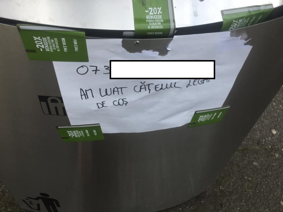 ”Cine și-a lăsat cățelul legat de coșul de gunoi de la intrarea în parcare din str Dunarii la Iulius Mall, sa știe cum poate lua legătura cu persoana care l-a luat”, a relatat un clujean.