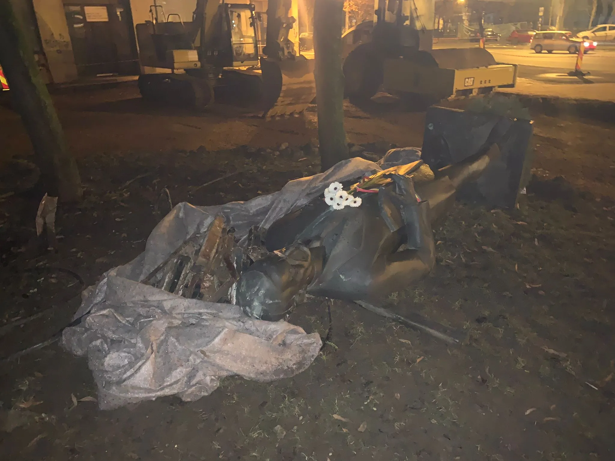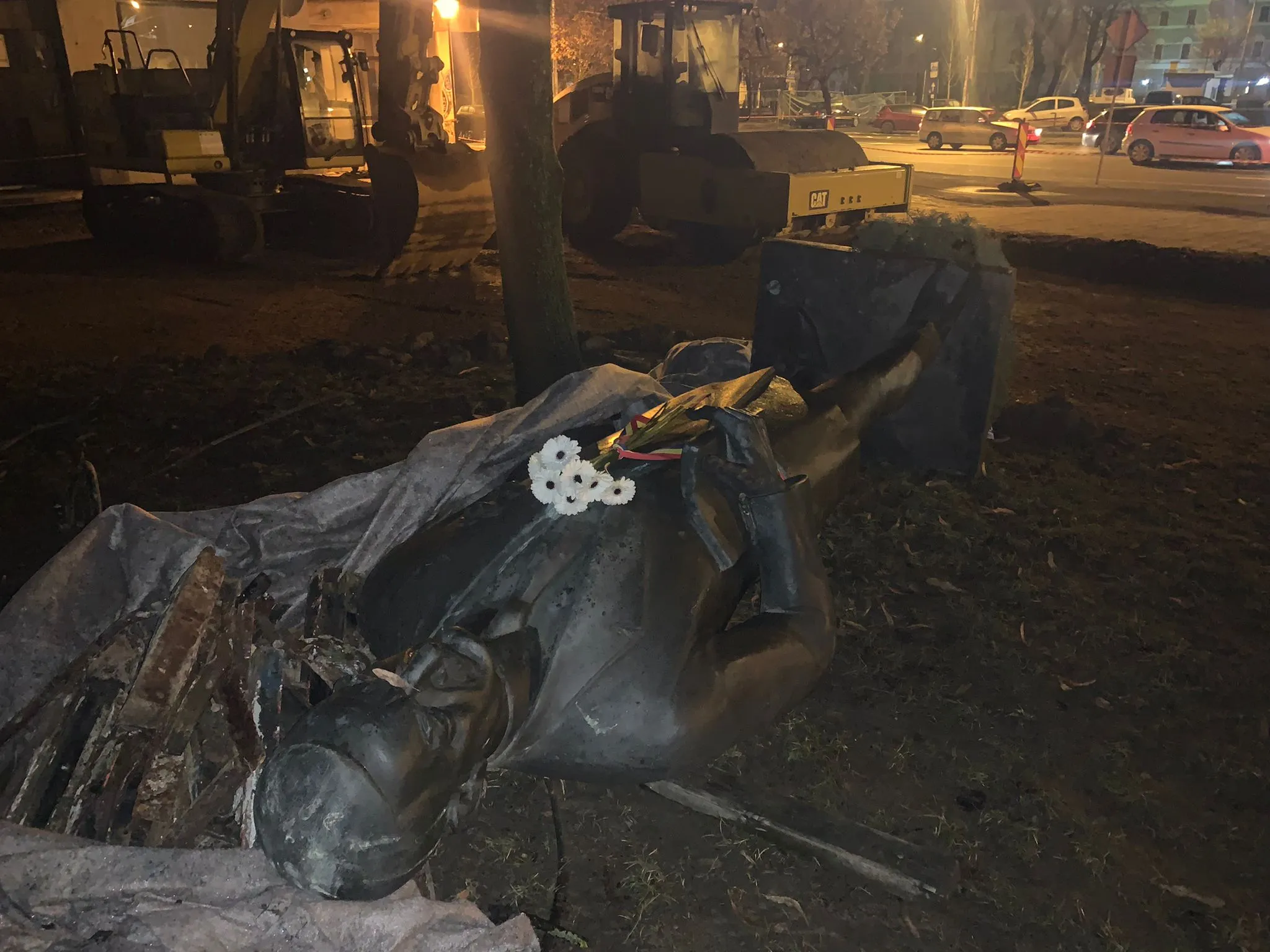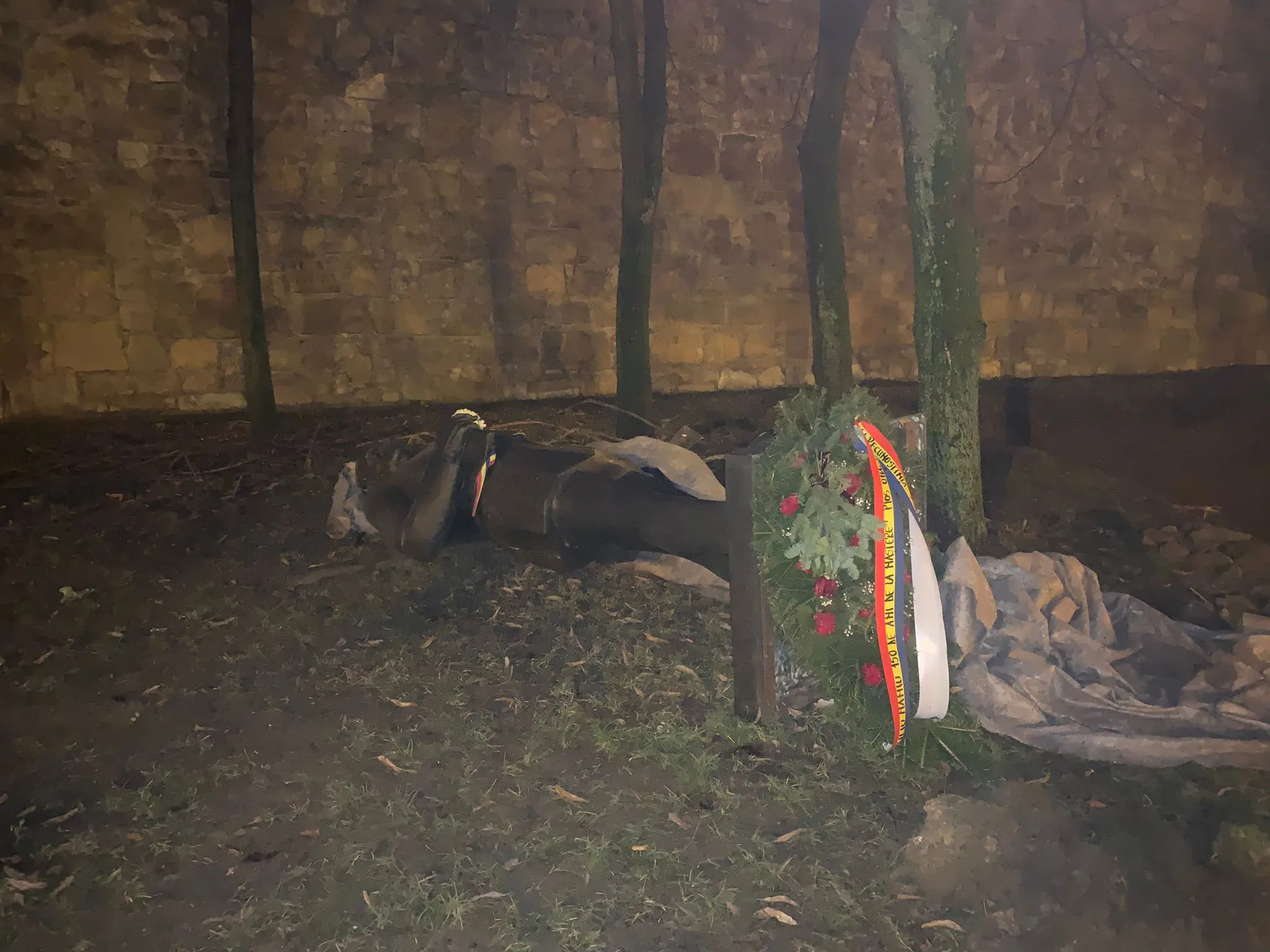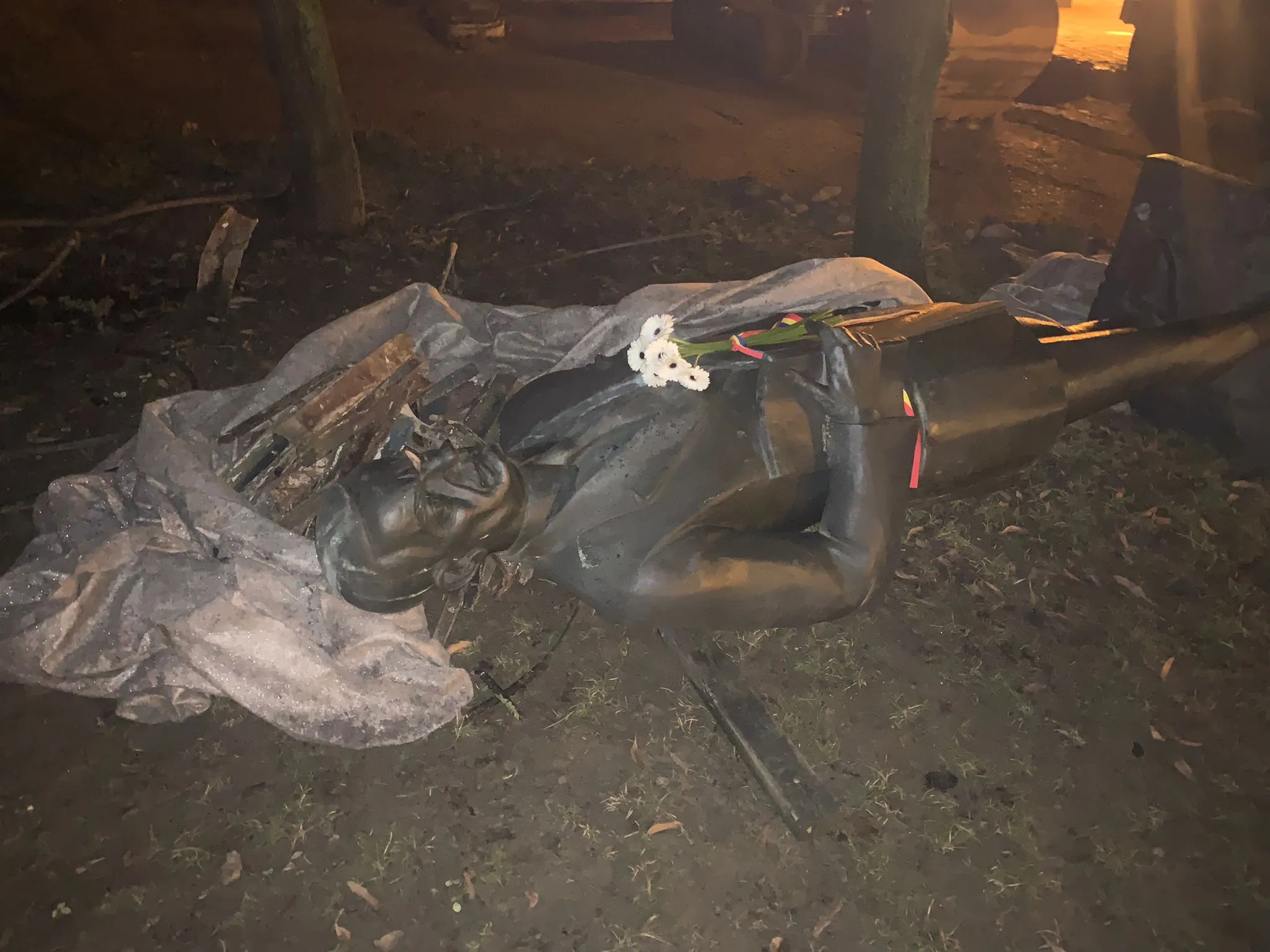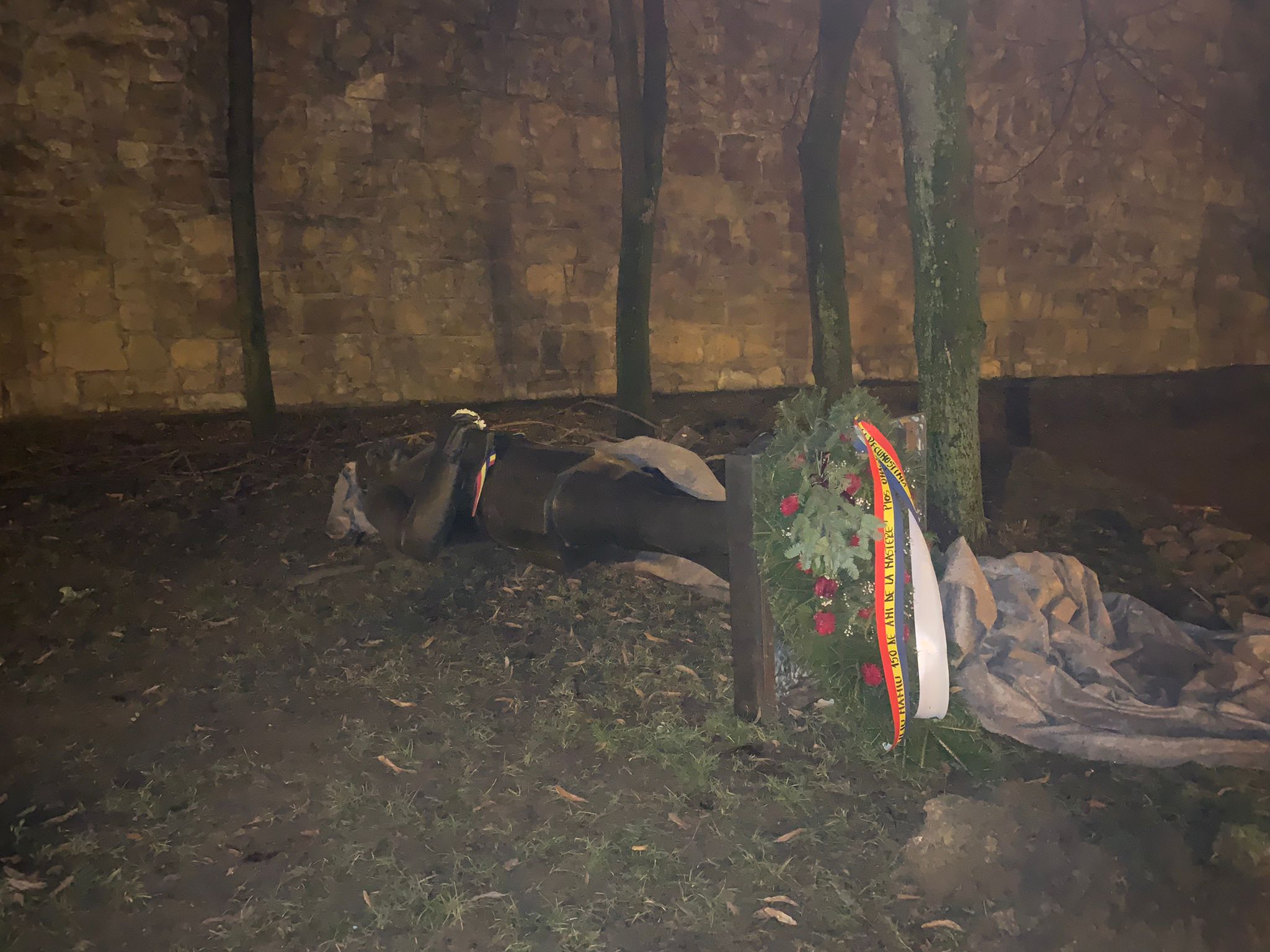 Soclul statuii a fost scos din pământ, iar statuia este culcată la pământ. Inițial a fost învelită cu o cârpă, dar aceasta a fost dată la o parte. Încă pe statuia este un buchet de flori de la o ceremonie recentă.
