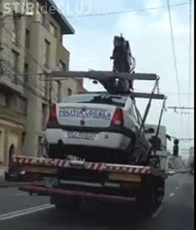 Pe imagini se observă cum o mașină a Poliției Locale a fost ridicată de către camionul de tractare. Există însă și posibilitatea ca mașina să fie stricată.